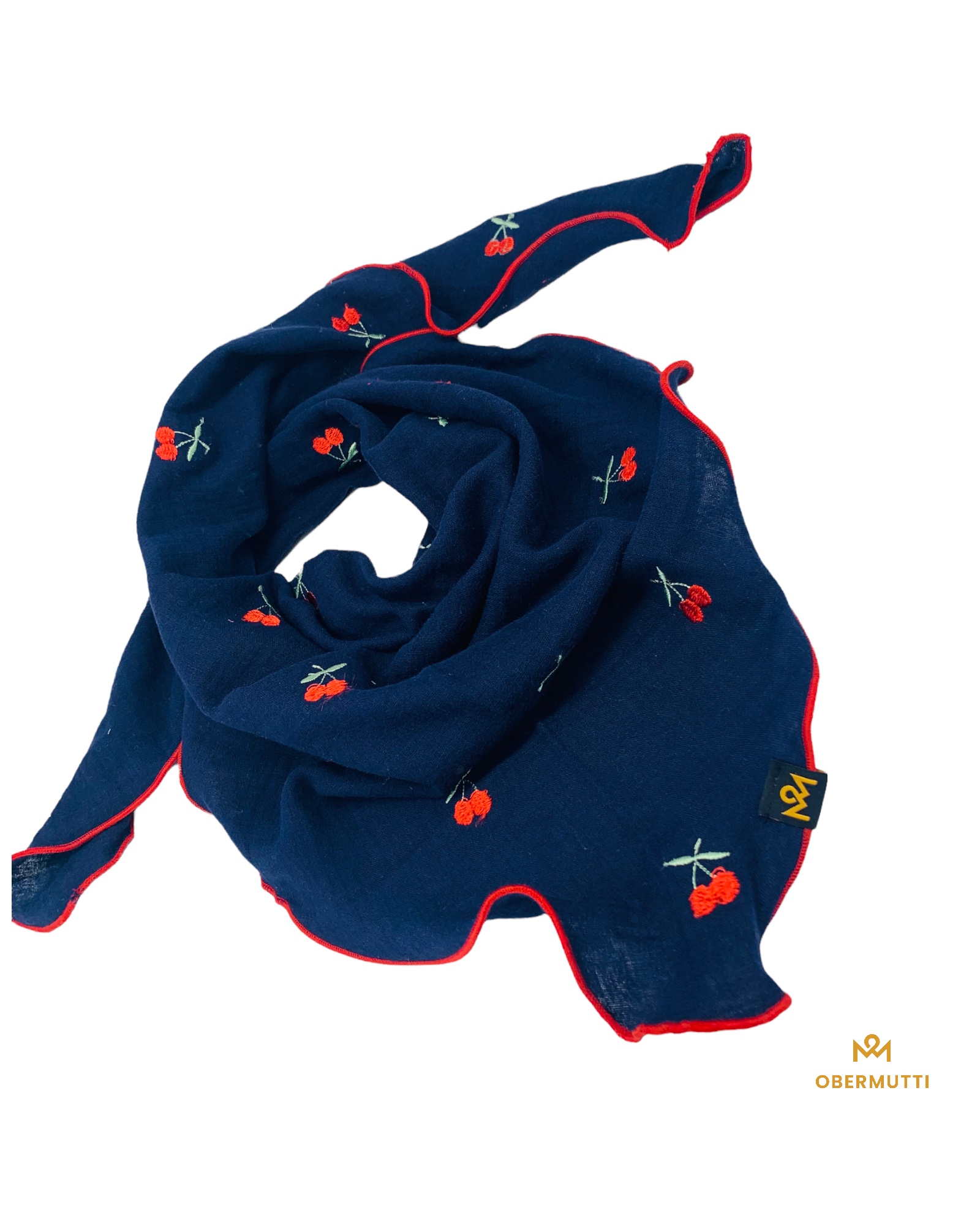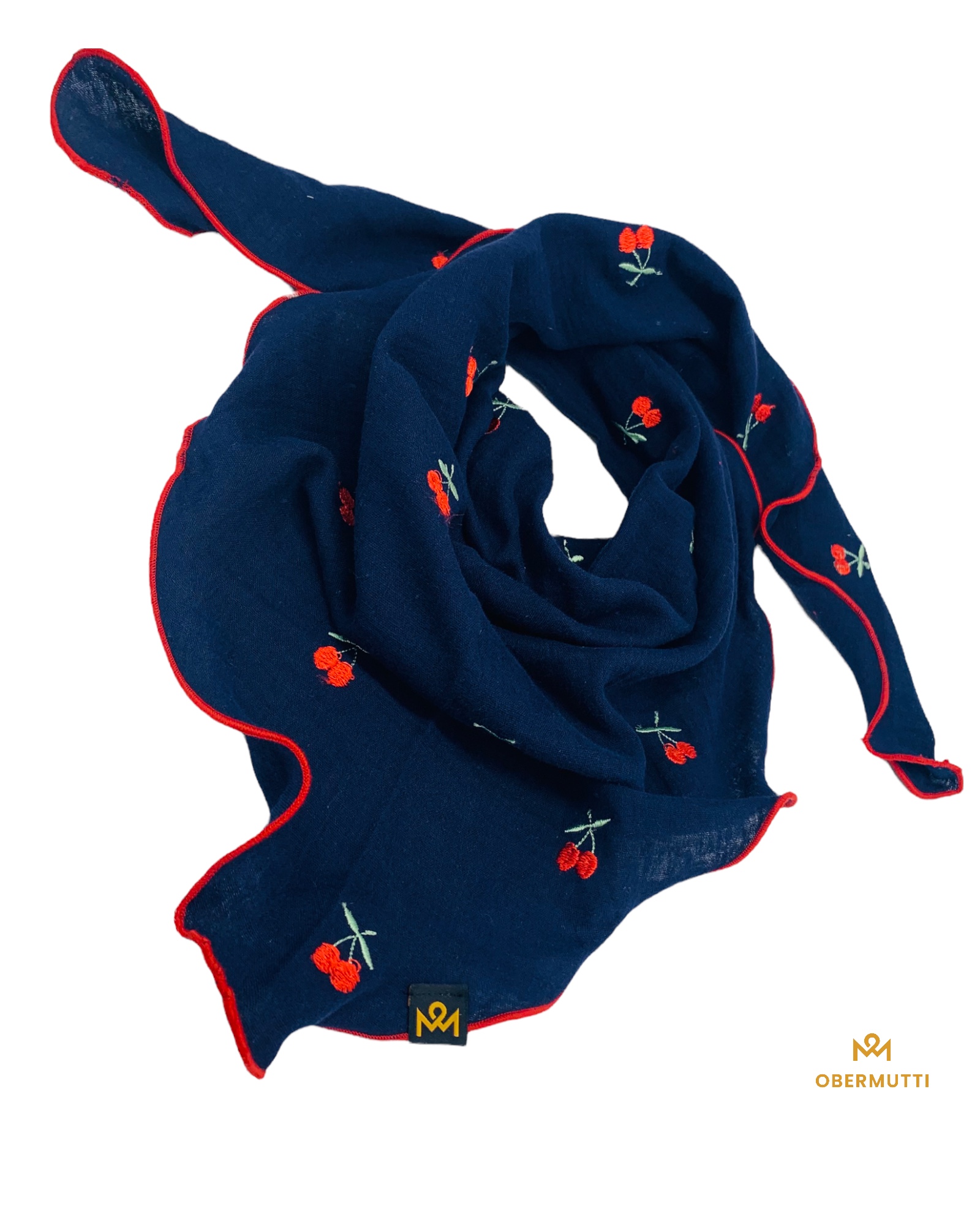 Dieser hochwertige, doppelt gewebte Schal aus 100% Baumwollmusselin wurde in der Farbe "Dunkelblau mit Kirschenprint" gefertigt.