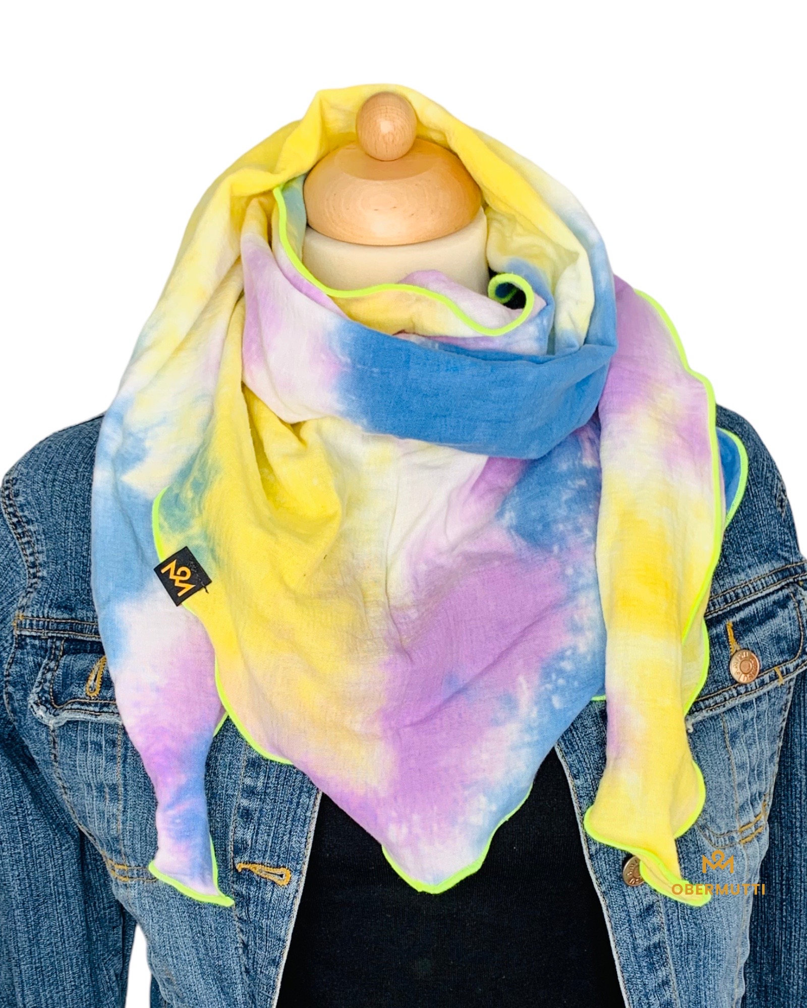 Dieser hochwertige, doppelt gewebte Schal aus 100% Baumwollmusselin wurde in der Farbe "Hellblau, Gelb, Flieder im Batik Style " gefertigt.
