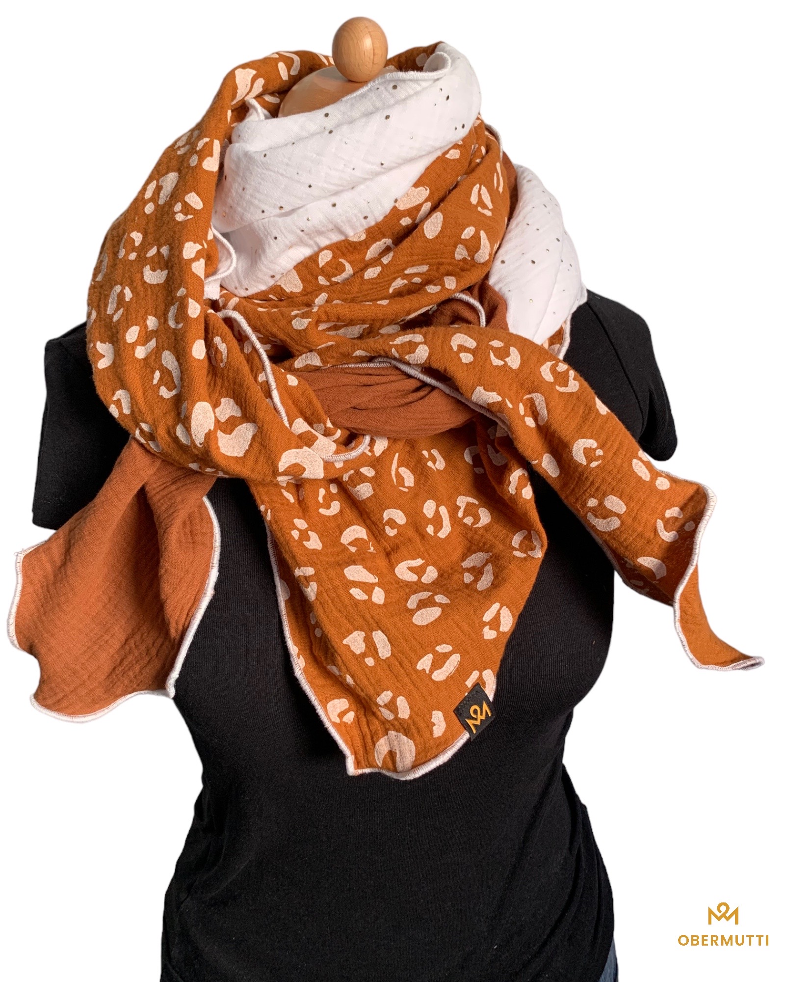 Der Schal besteht aus einem glatten, lockeren und feinfädigen Musselinbaumwollstoff.