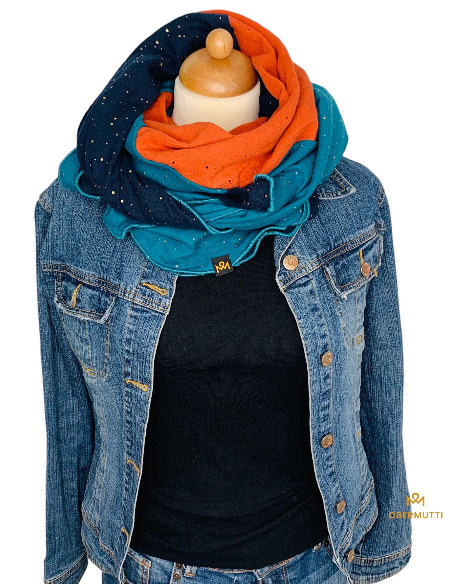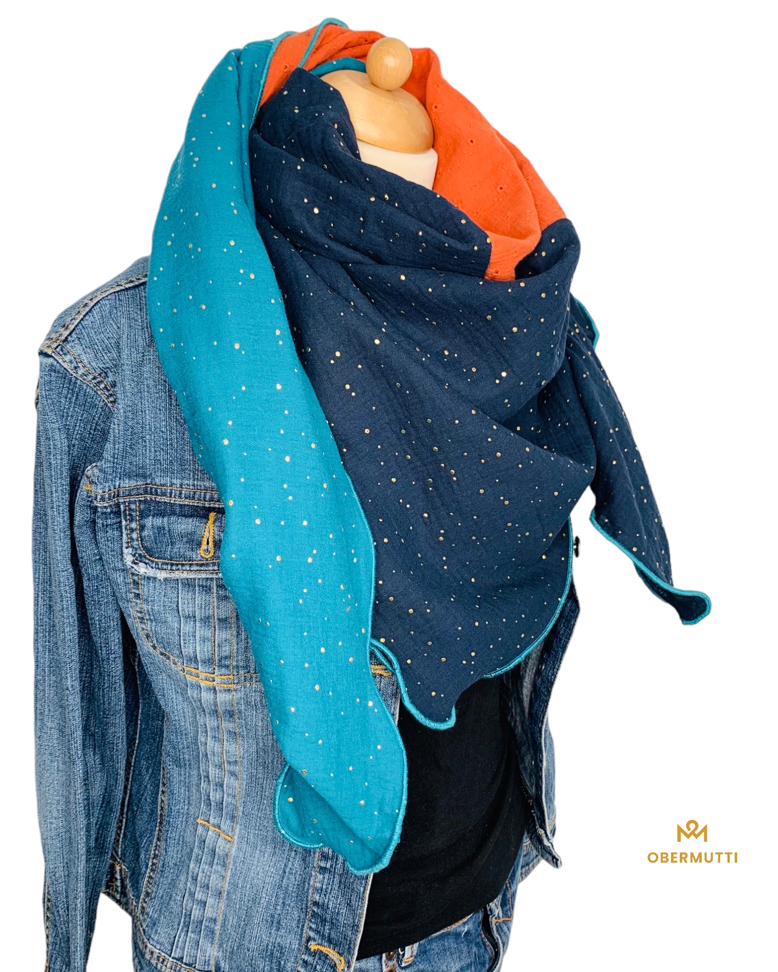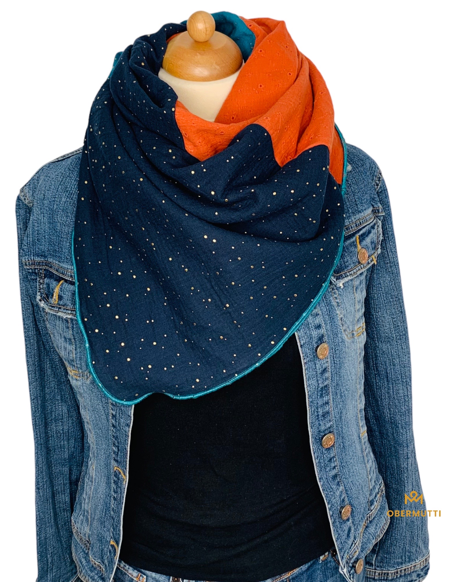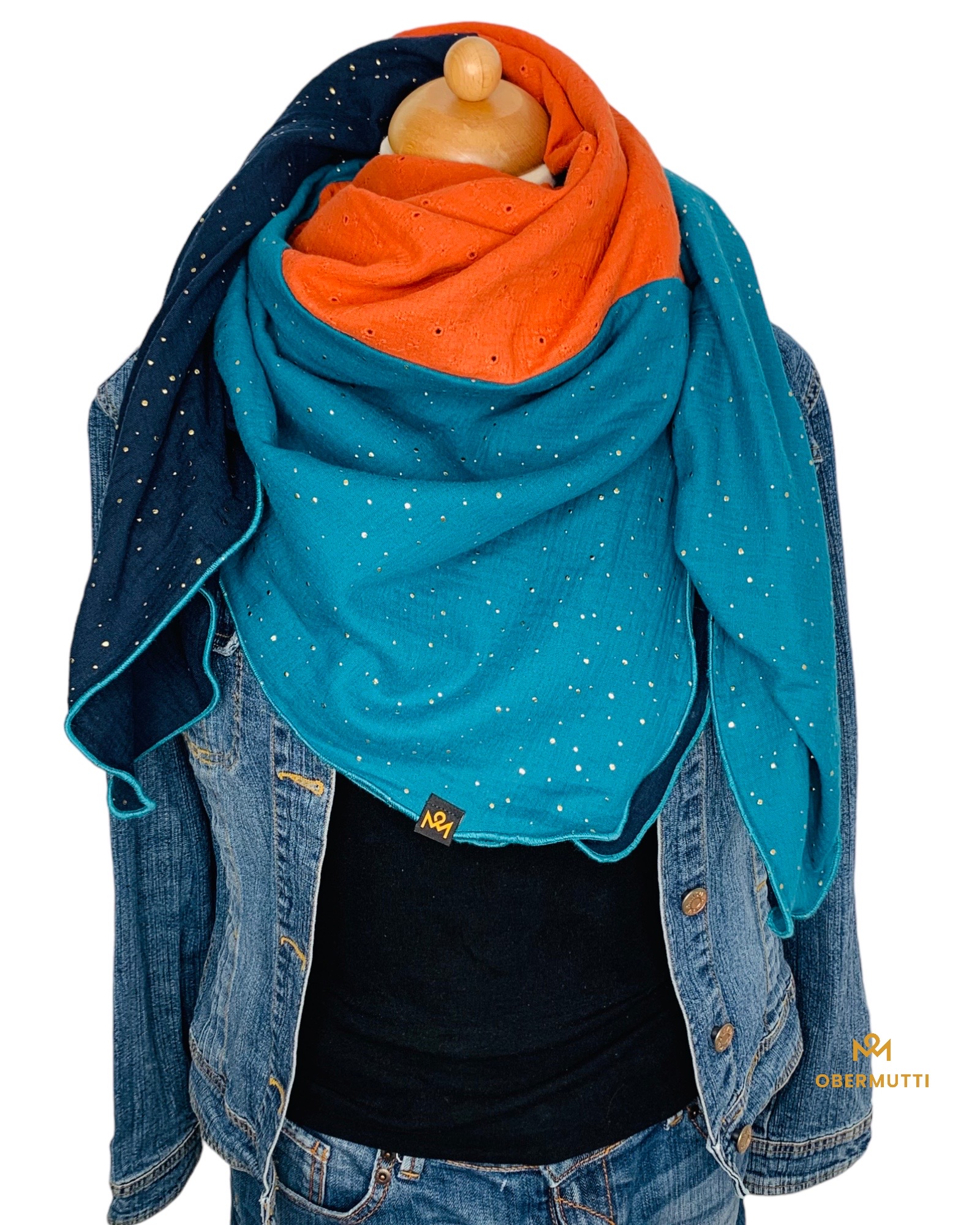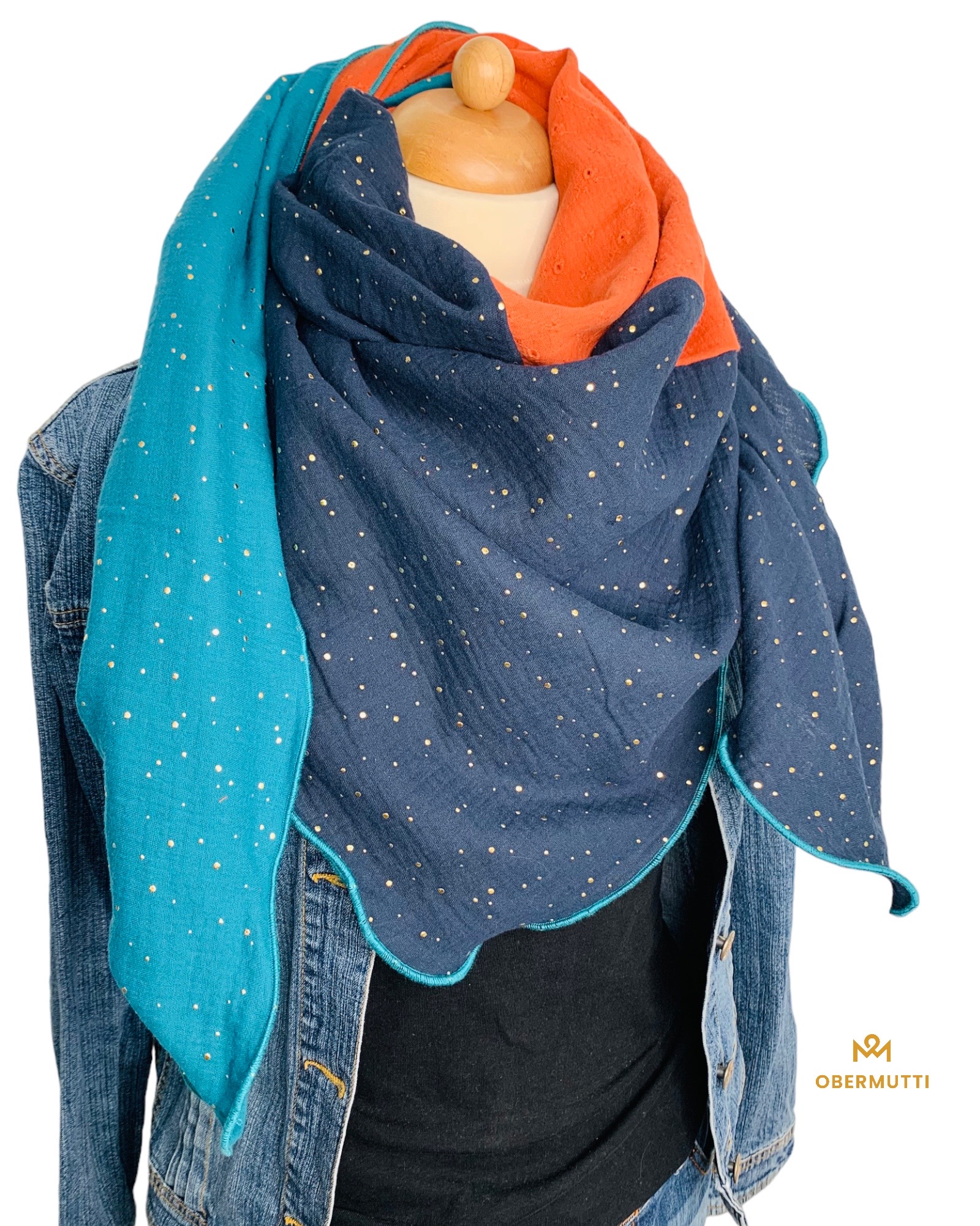 Farbe: Petrol und Marineblau mit goldenen Punkte sowie Rostrot mit Lochstickerei