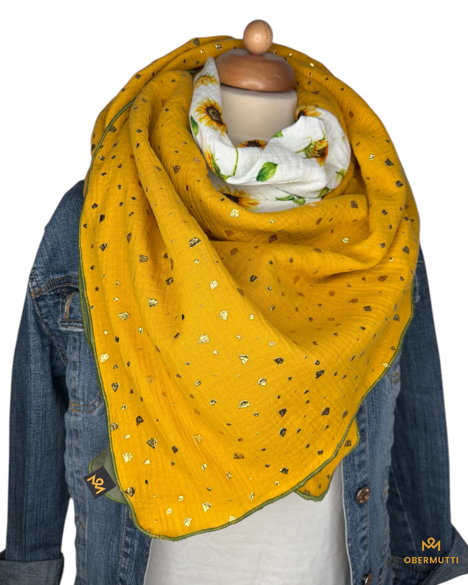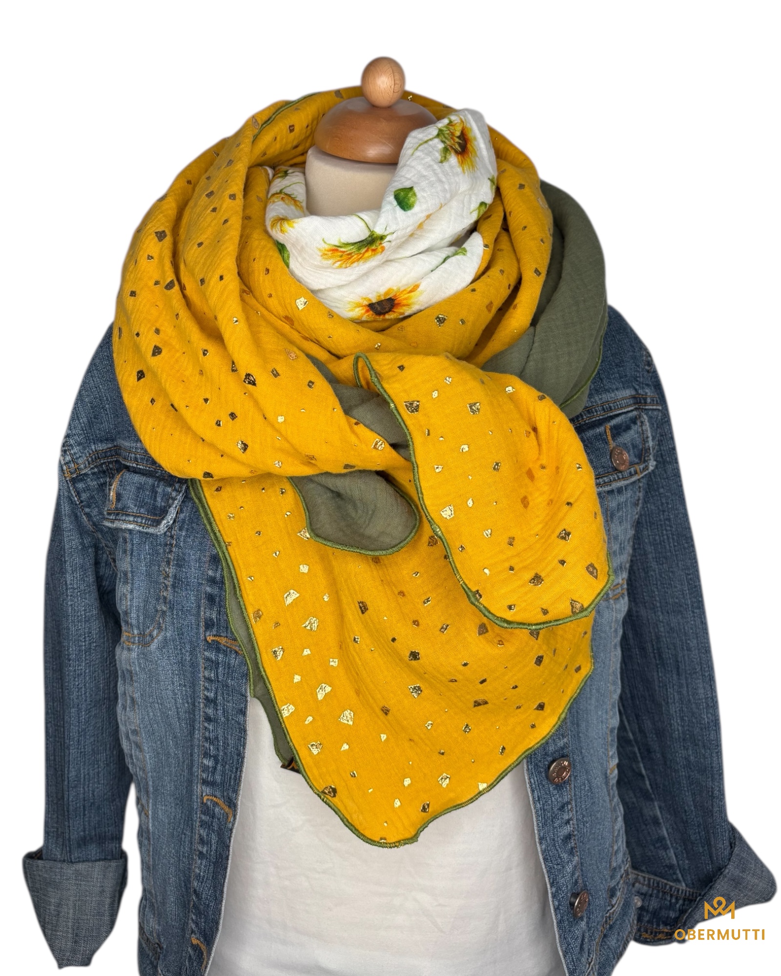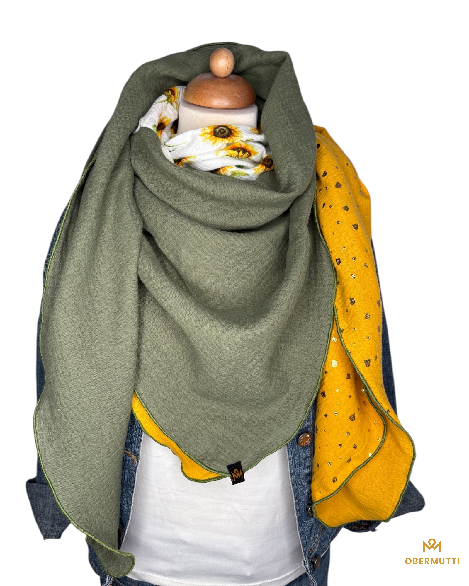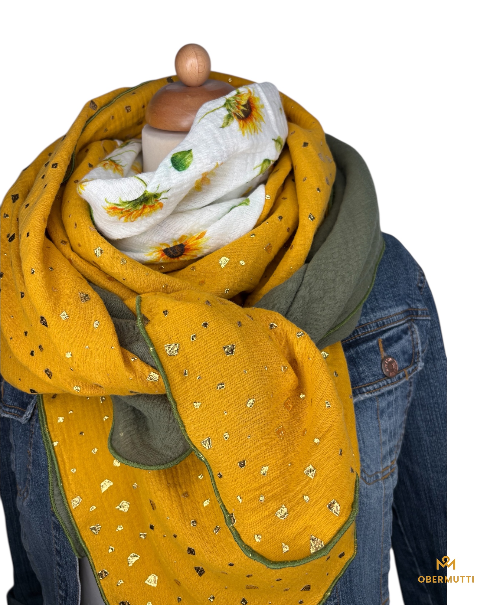 Farbe: Senfgelb mit Glitzerflakes, Olivegrün und weiß mit Sonnenblumen