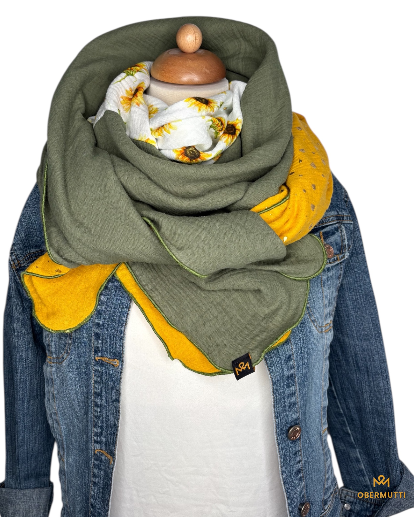 Die Einzigartigkeit des Designs wird durch die Struktur des weichen Baumwollmusselins in Kombination mit der Gewebekante in der Farbe "Olivegrün" bestimmt.