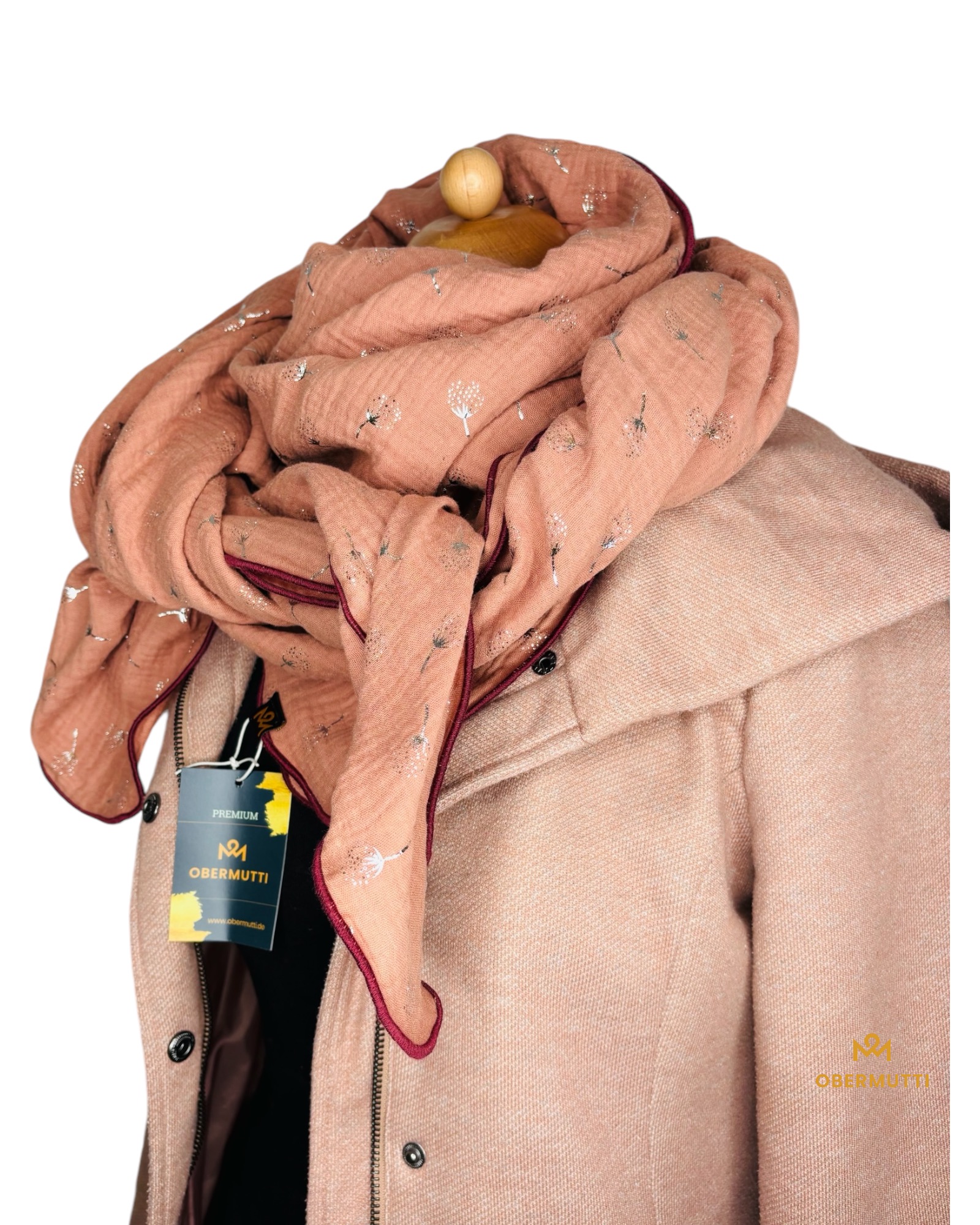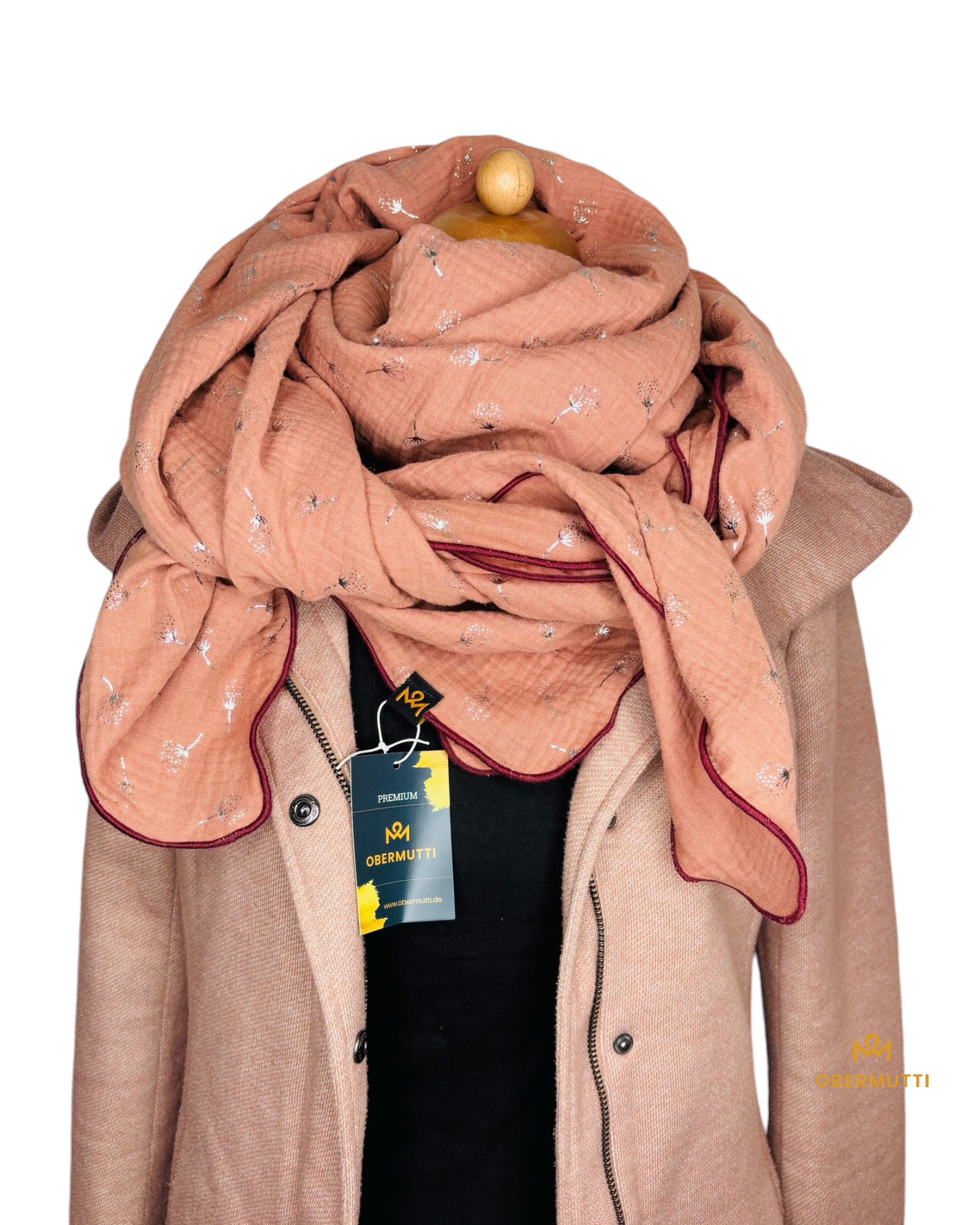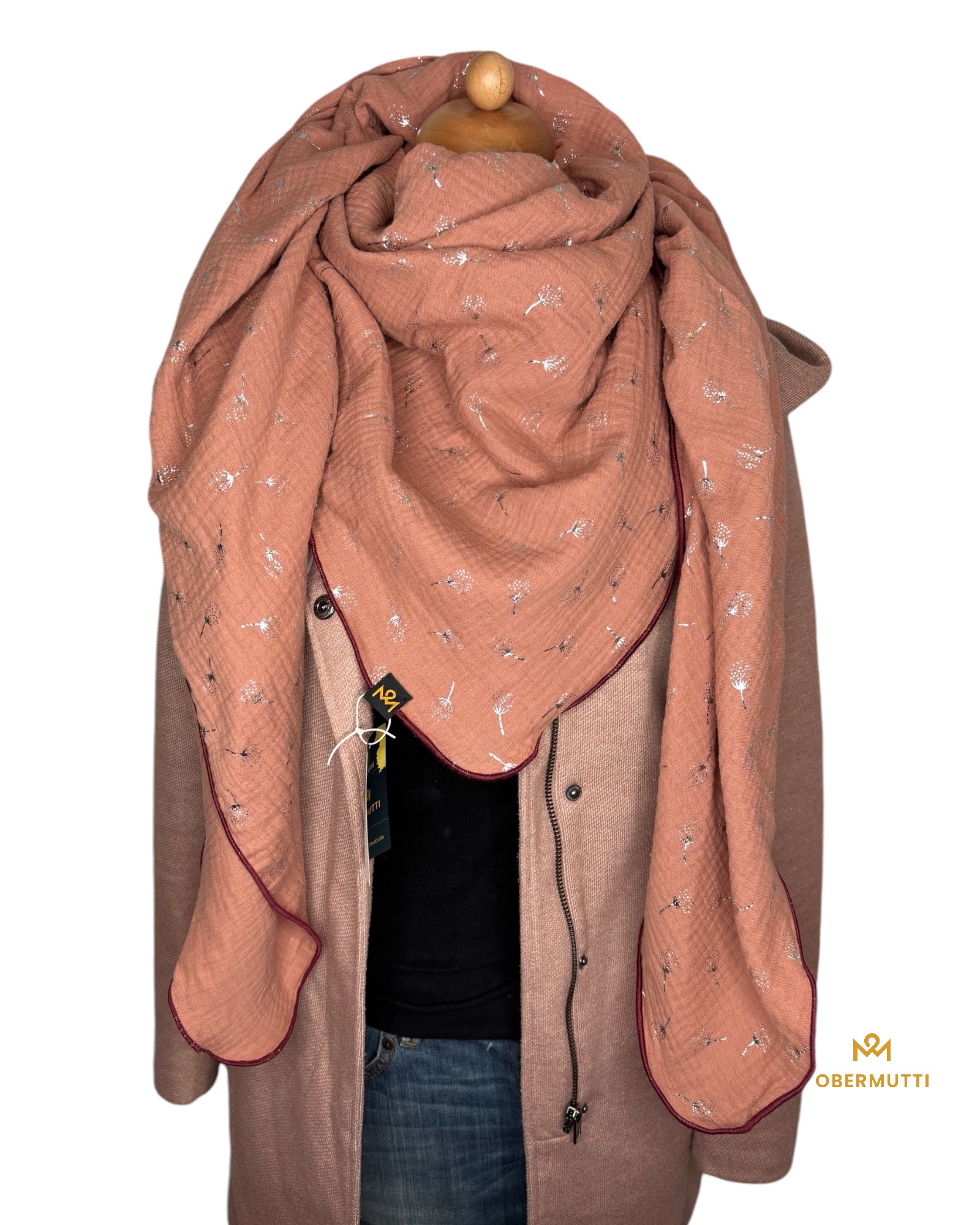 Die Einzigartigkeit des Designs wird durch die Struktur des weichen Baumwollmusselins in Kombination mit der Gewebekante in der Farbe "Altrosa" bestimmt.