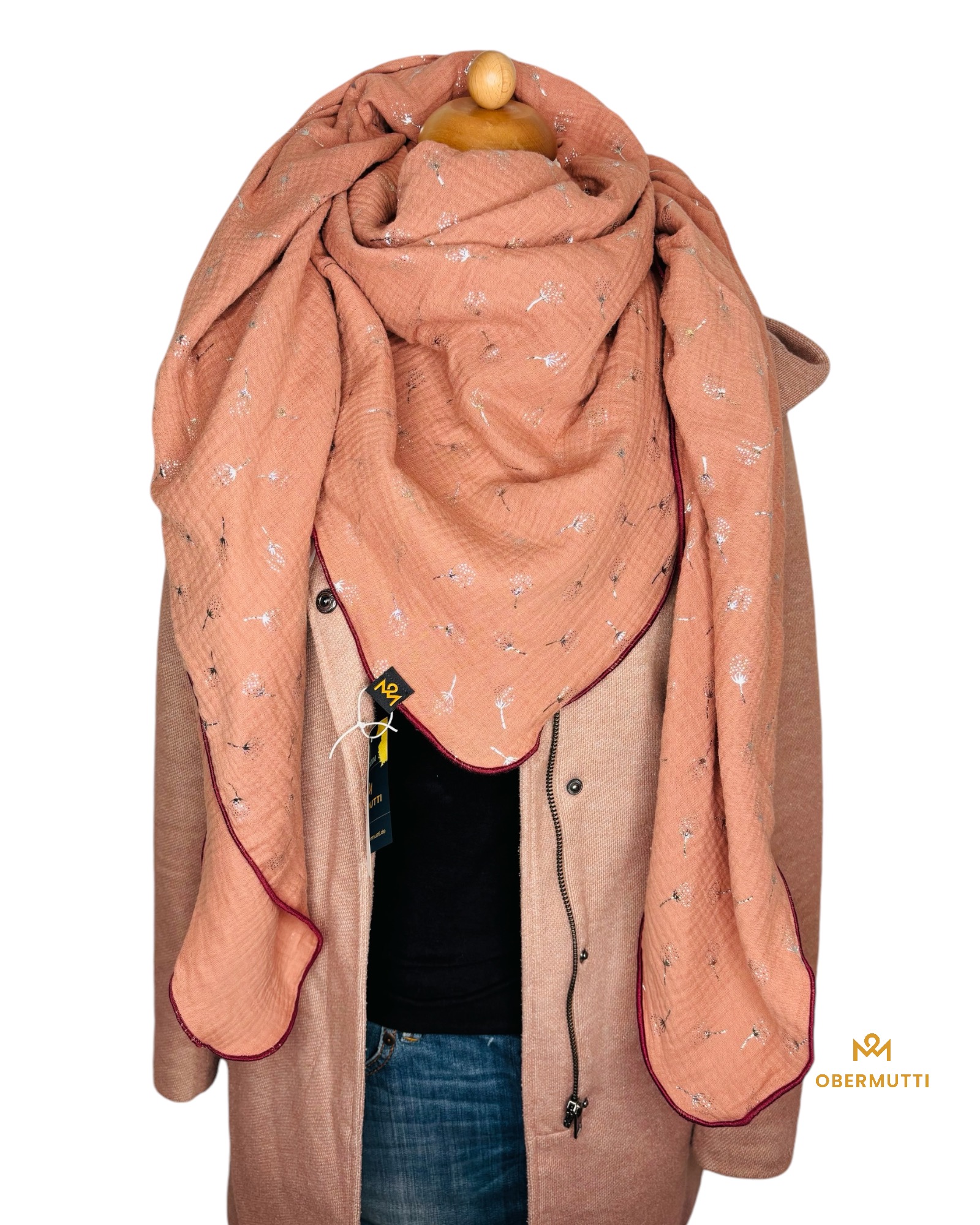 Mit einem quadratischen Schnittformat in einer Breite von ca. 140 cm u. einer Länge von 140 cm lässt er alle Trage- und Kombinationsmöglichkeiten offen.