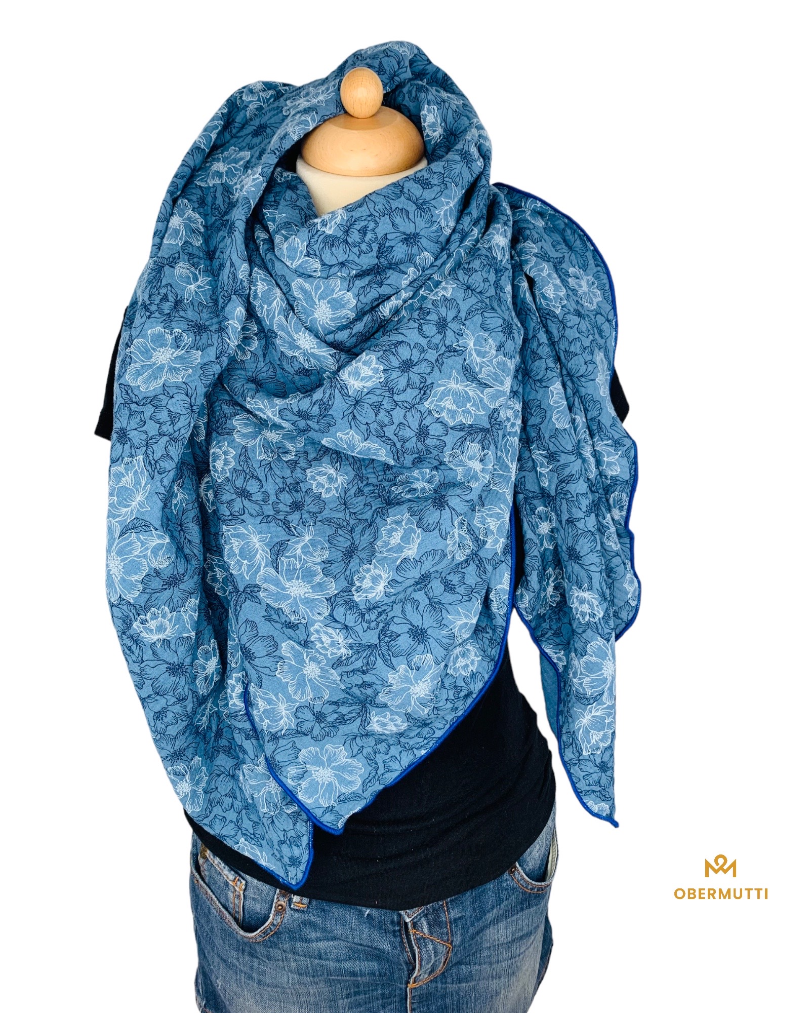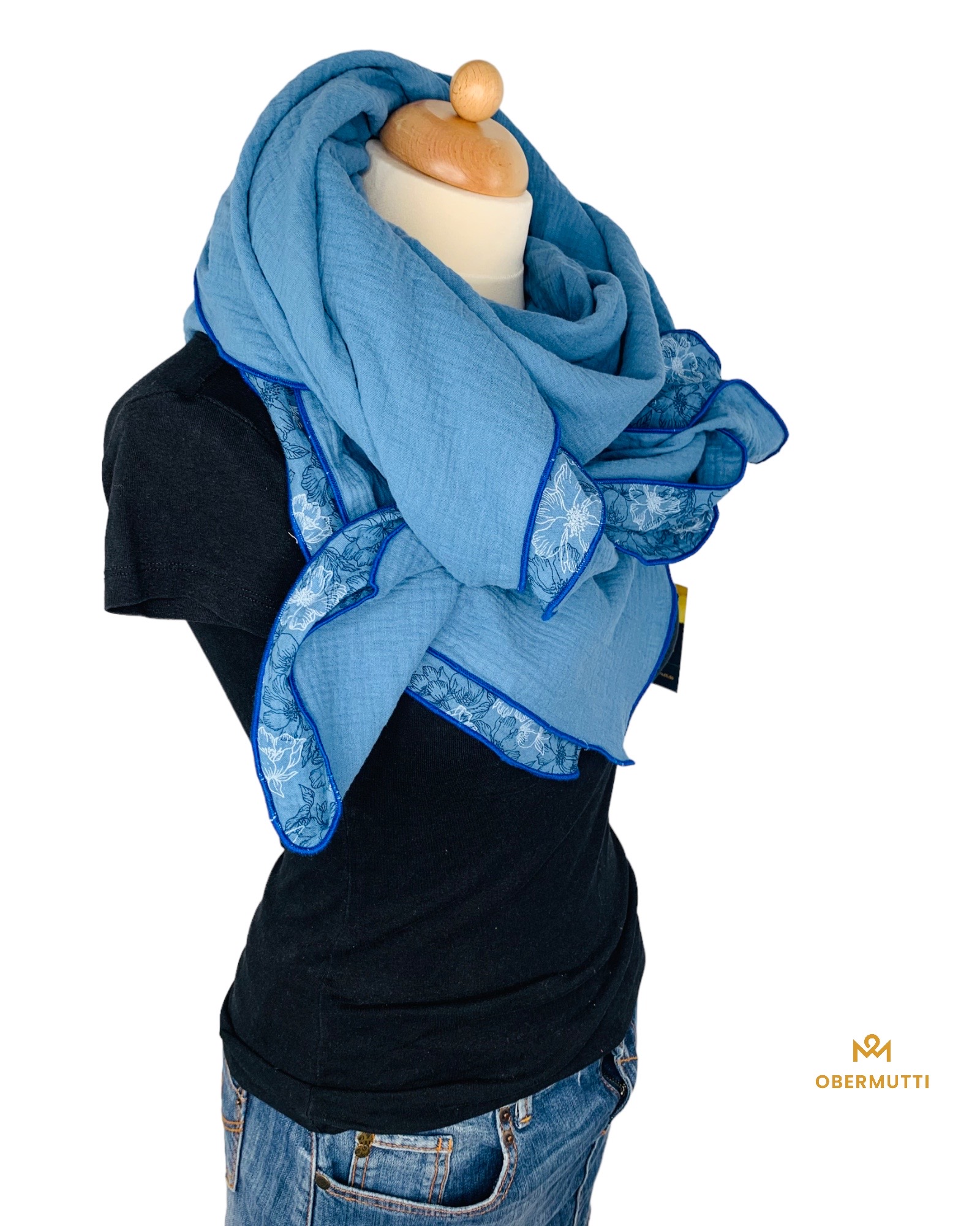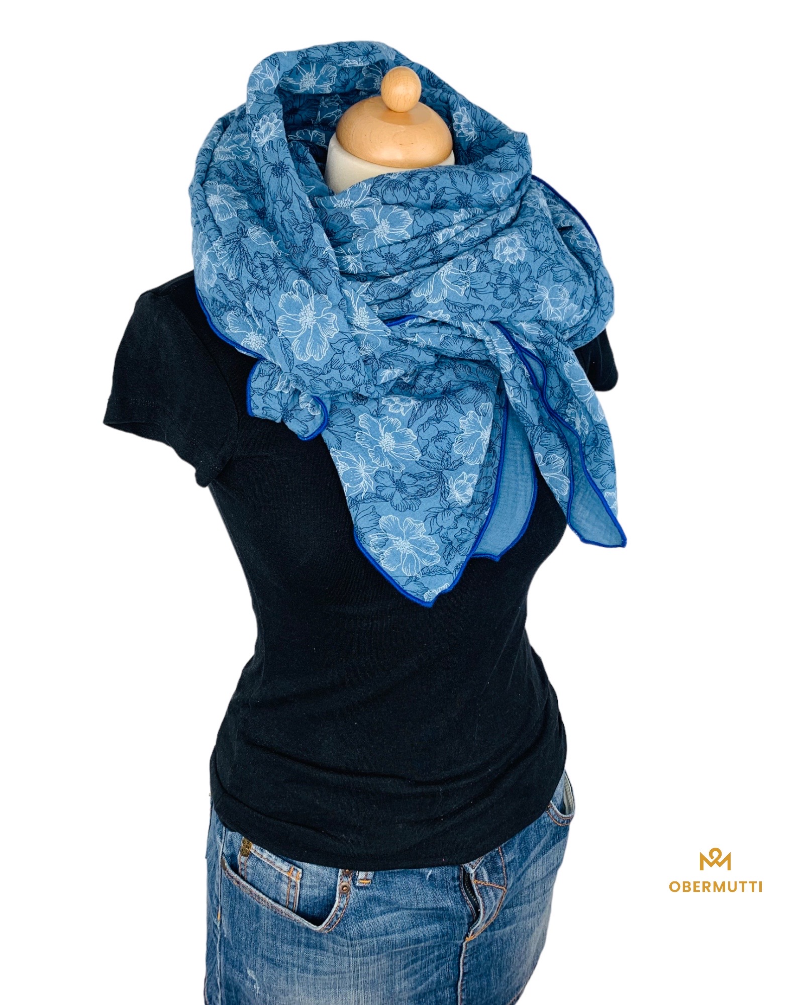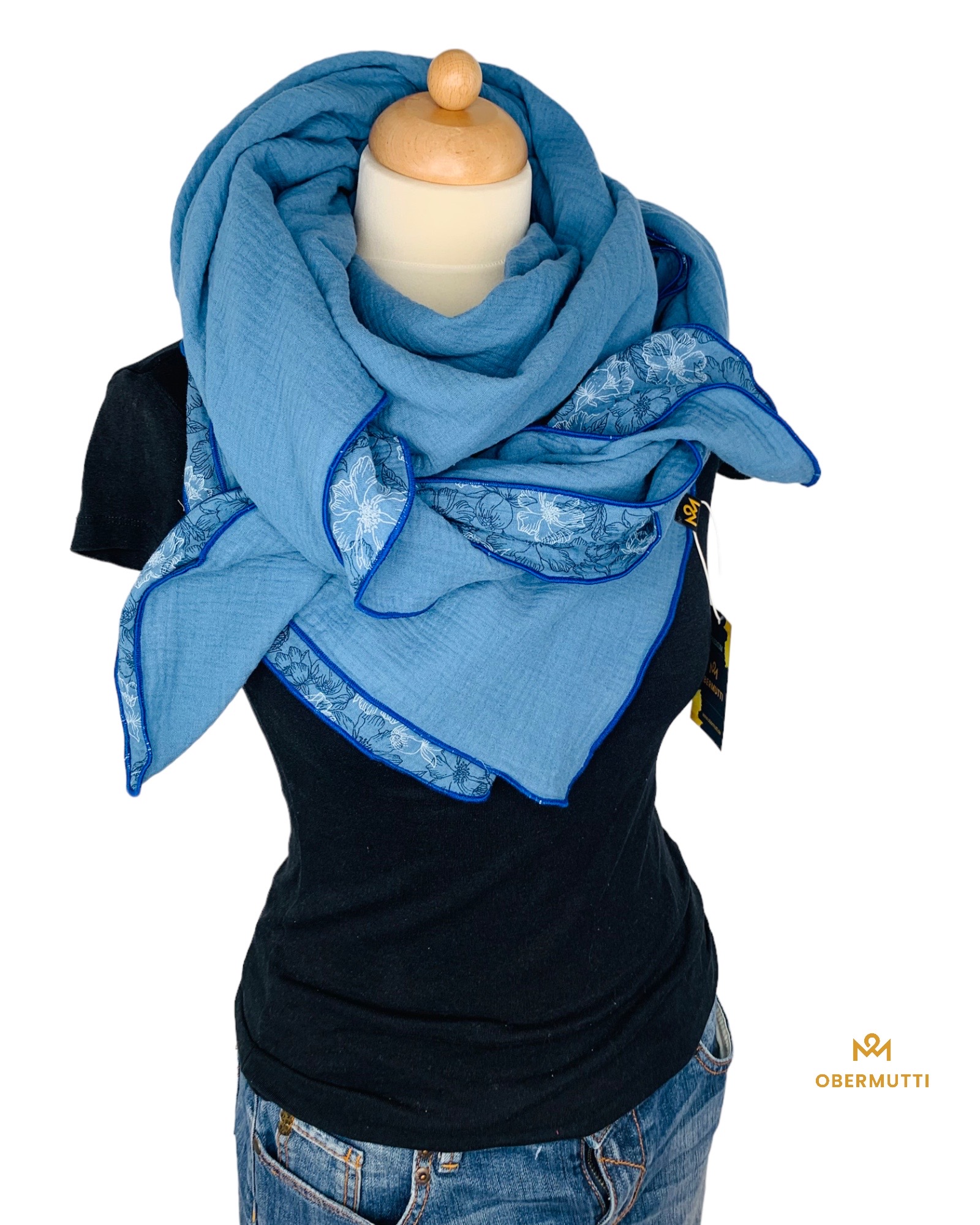 Die Einzigartigkeit des Designs wird durch die Struktur des weichen Baumwollmusselins in Kombination mit der Gewebekante in der Farbe "Kobaltblau" bestimmt.