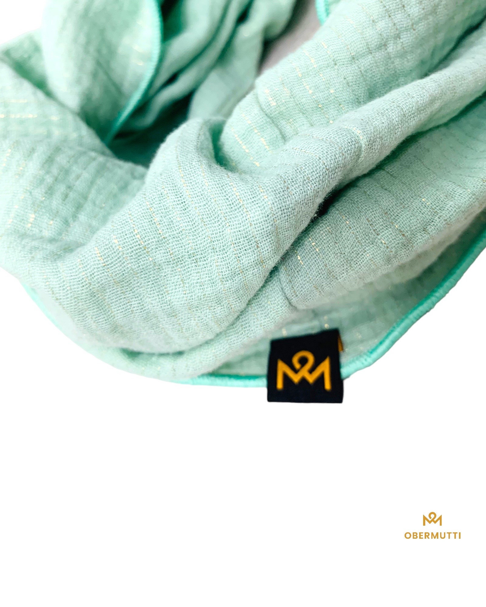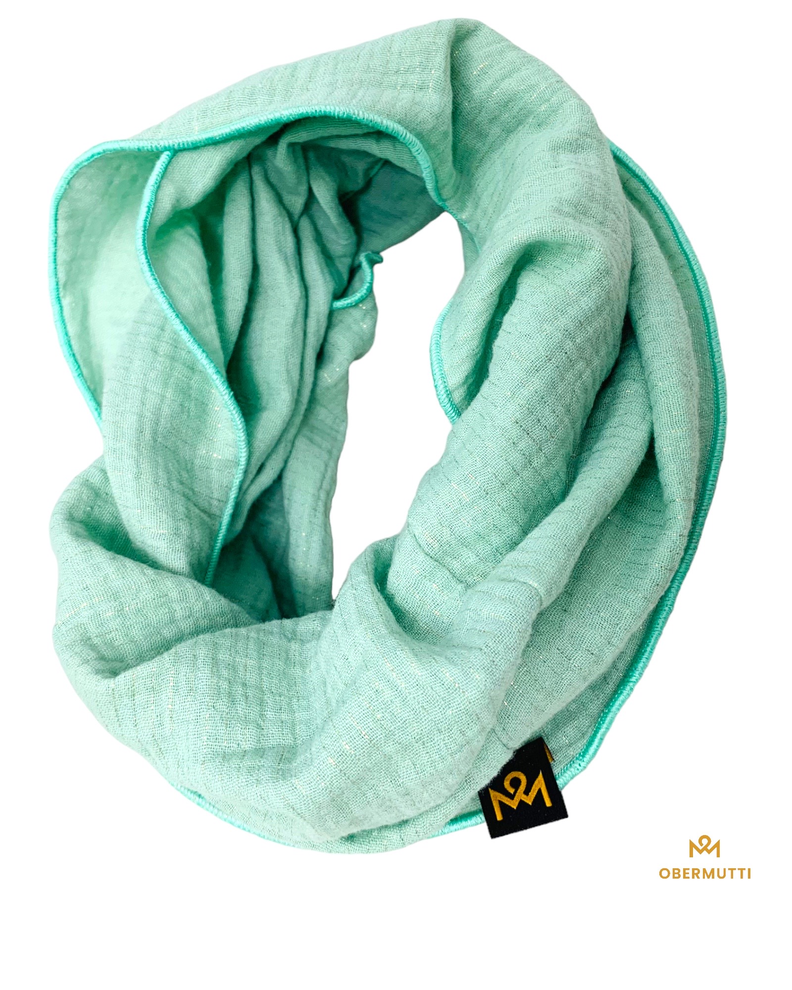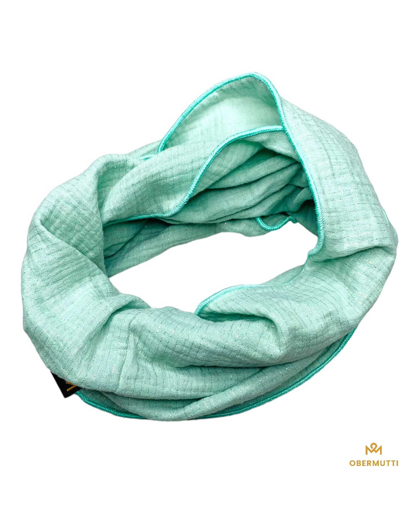 Dieser hochwertige, doppelt gewebte Schlauchschal aus 100% Baumwollmusselin wurde in der Farbe "Mint mit Glitzerfäden" gefertigt.