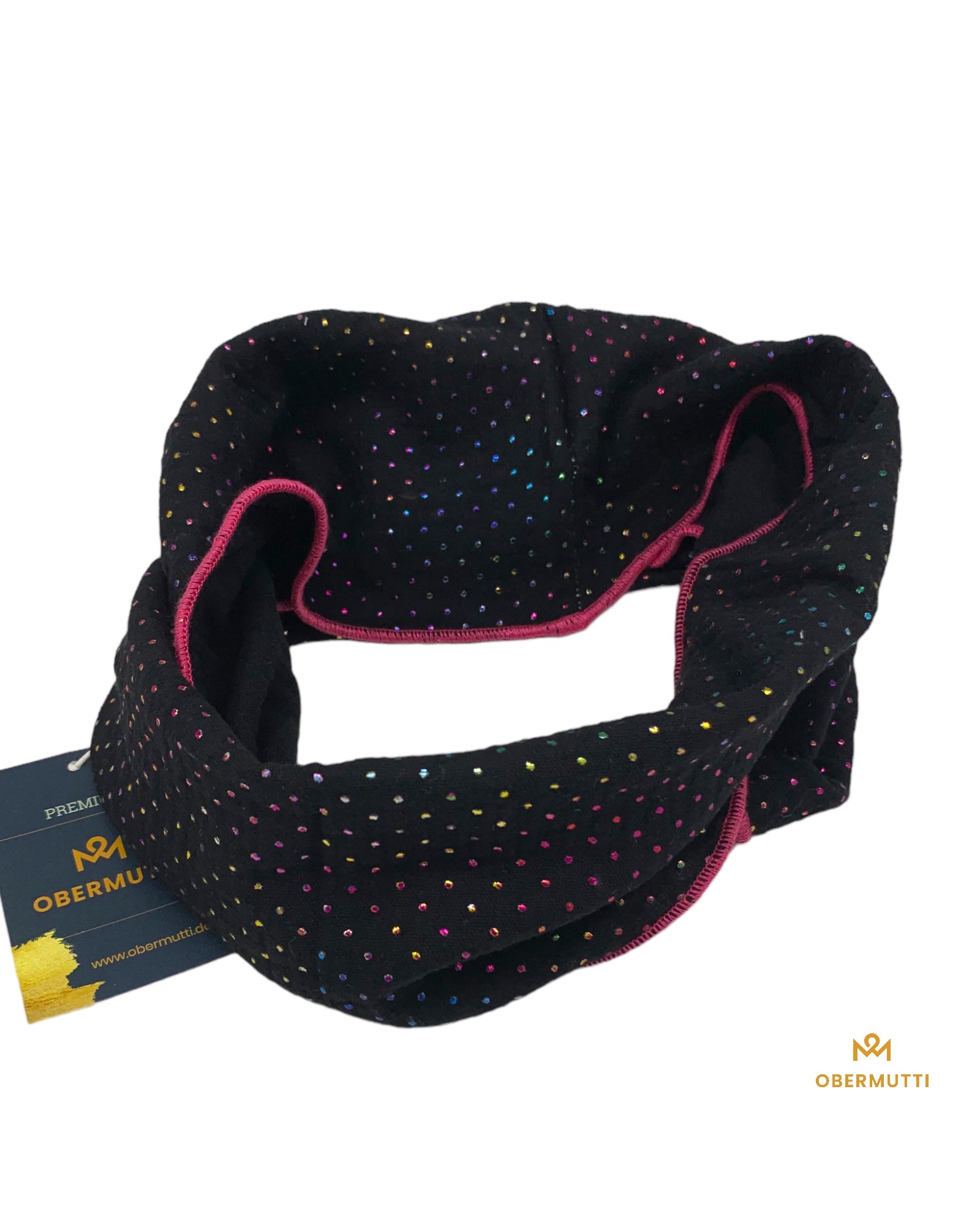 Dieser hochwertige, doppelt gewebte Schlauchschal aus 100% Baumwollmusselin wurde in der Farbe "Schwarz mit Regenbogen Glitzerpunkten" gefertigt.