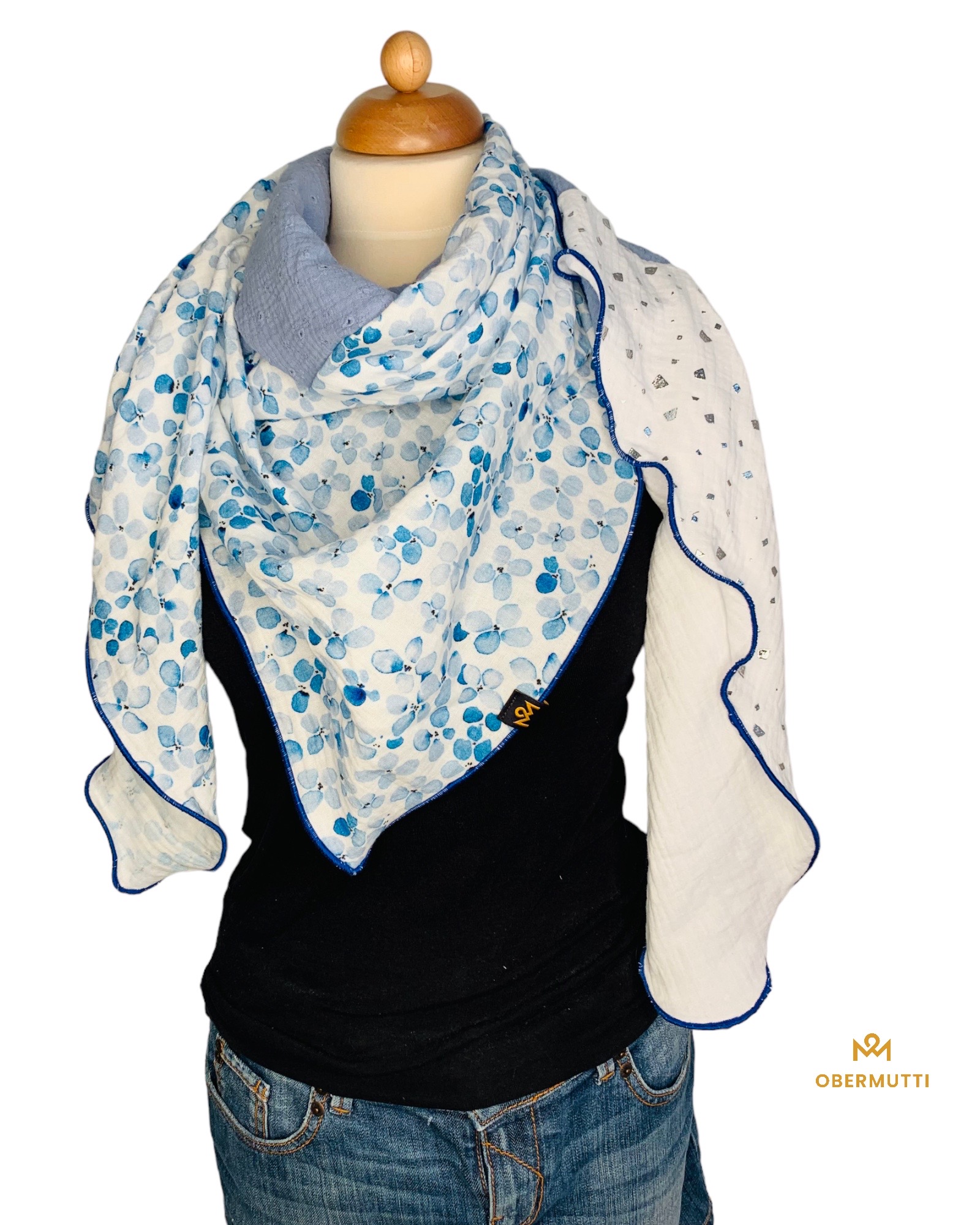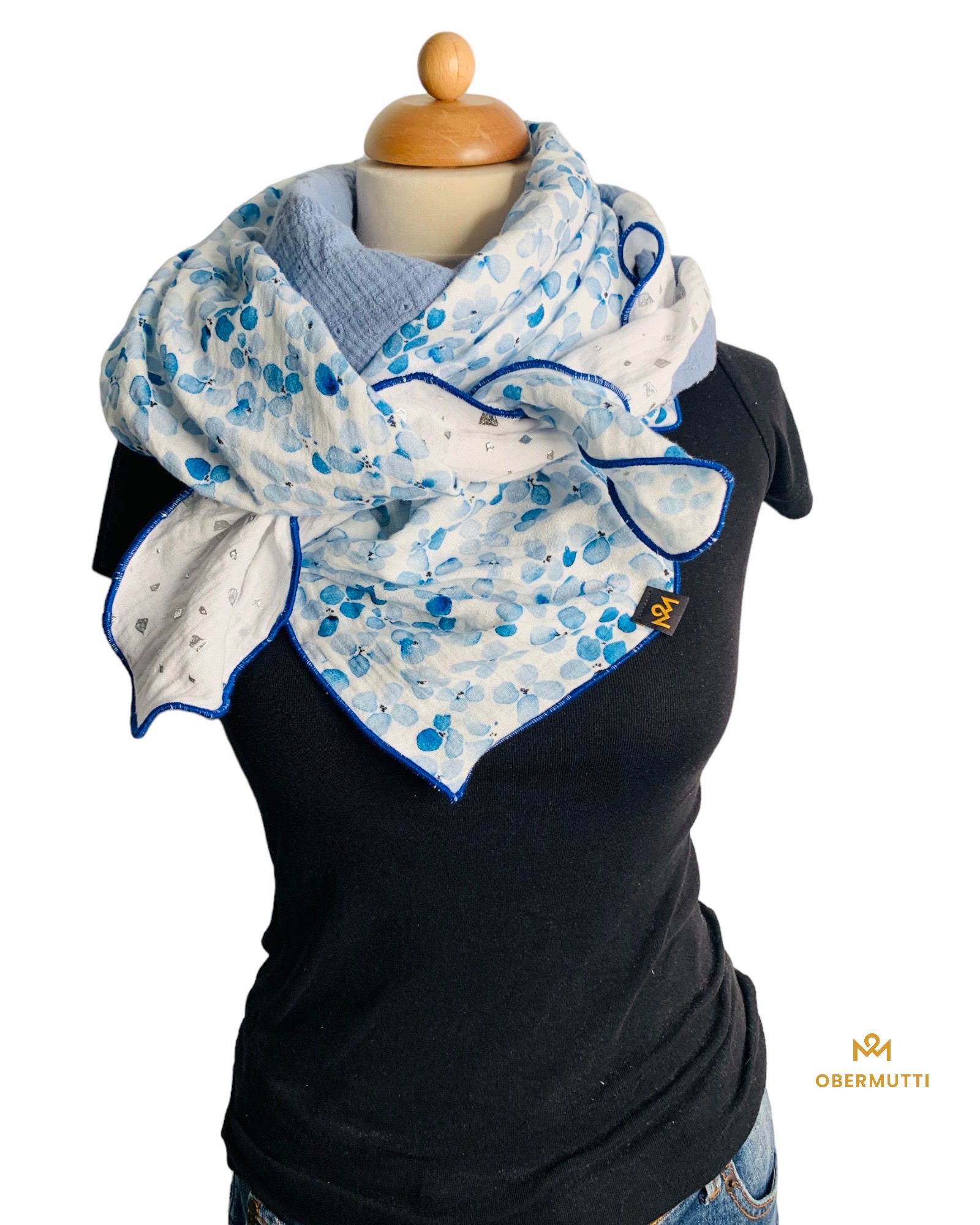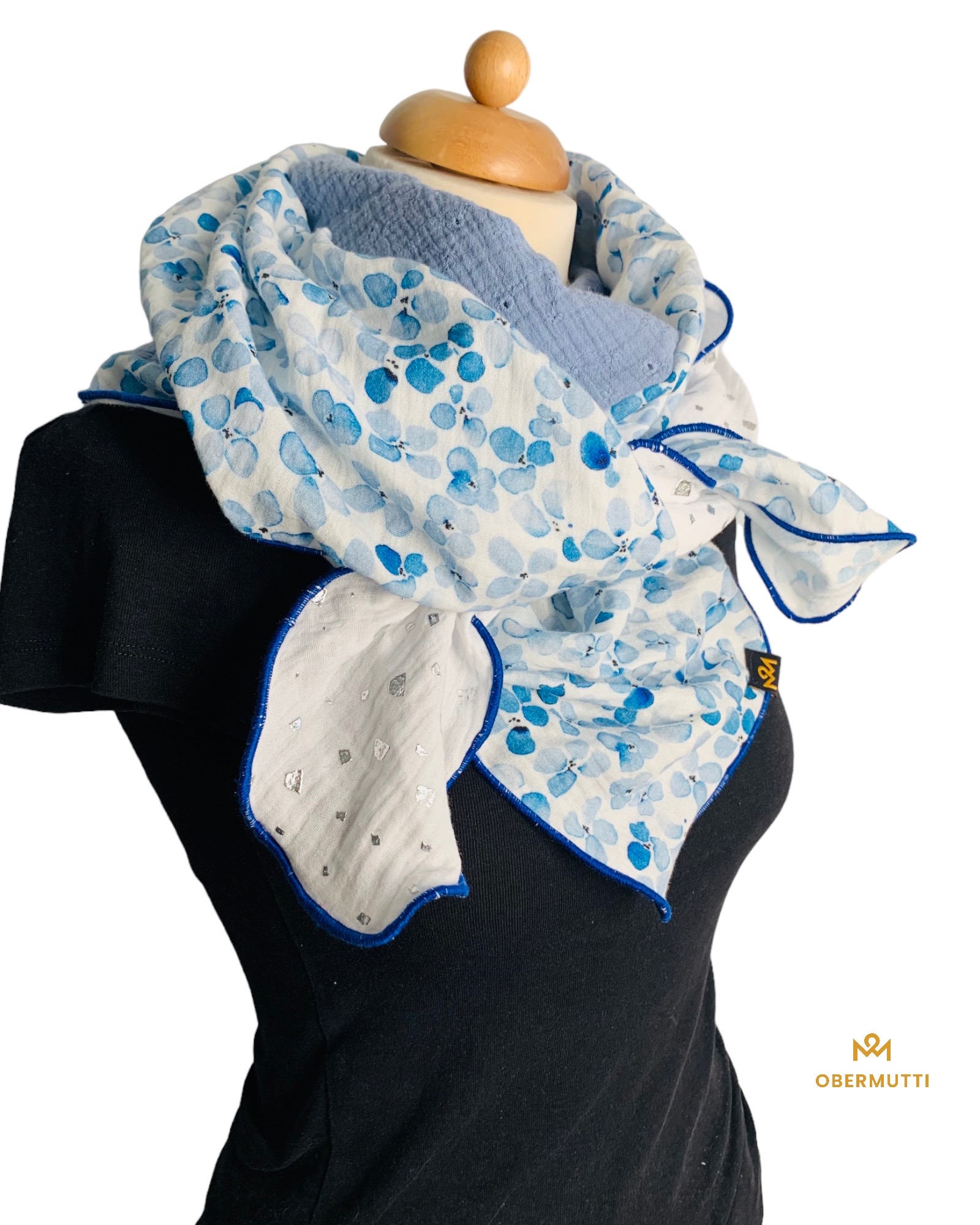 Die Einzigartigkeit des Designs wird durch die Struktur des weichen Baumwollmusselins in Kombination mit der Gewebekante in den Farben "Kobaltblau" bestimmt.