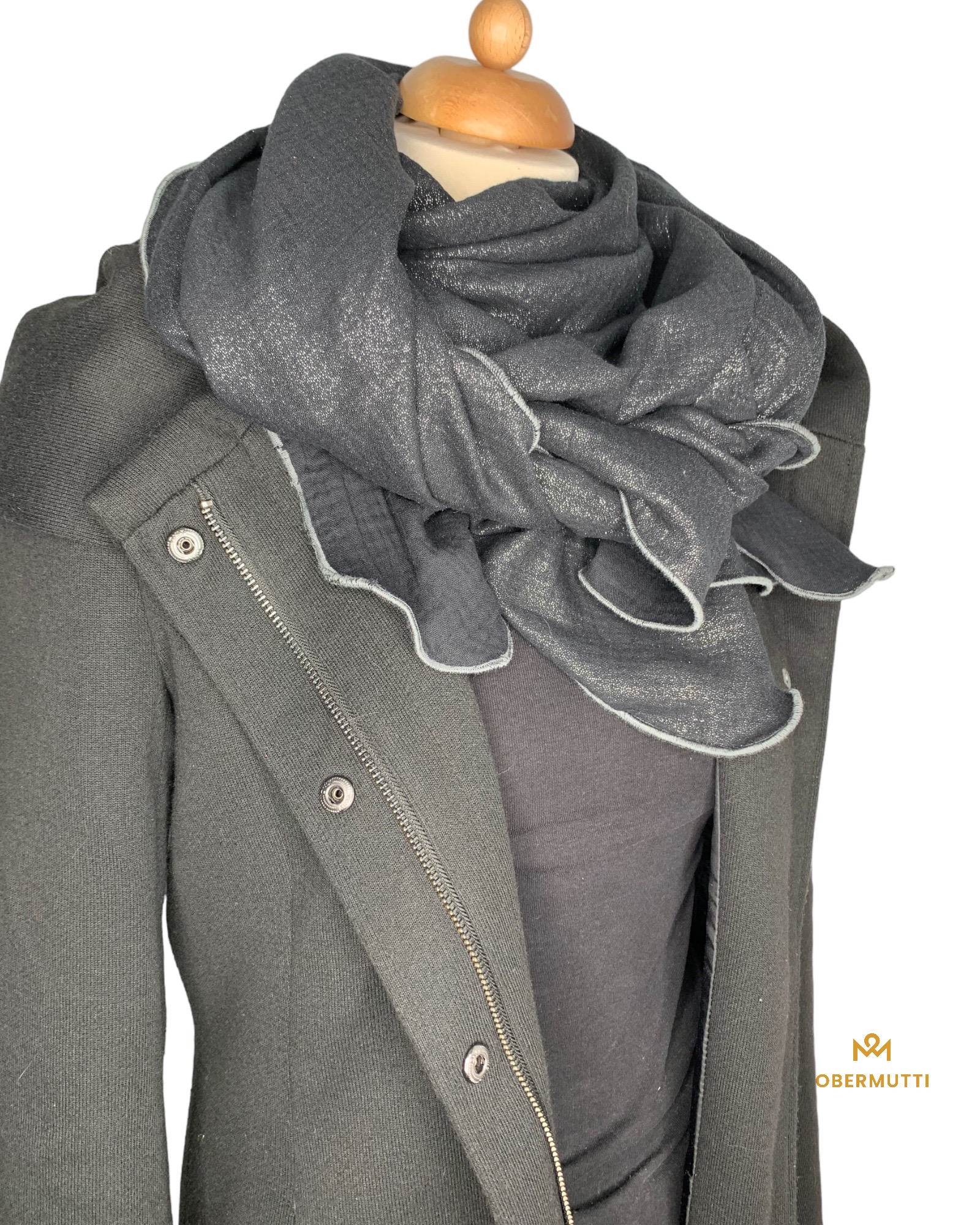 Die Einzigartigkeit des Designs wird durch die Struktur des weichen Baumwollmusselins in Kombination mit der Gewebekante in den Farben "Anthrazit" bestimmt.