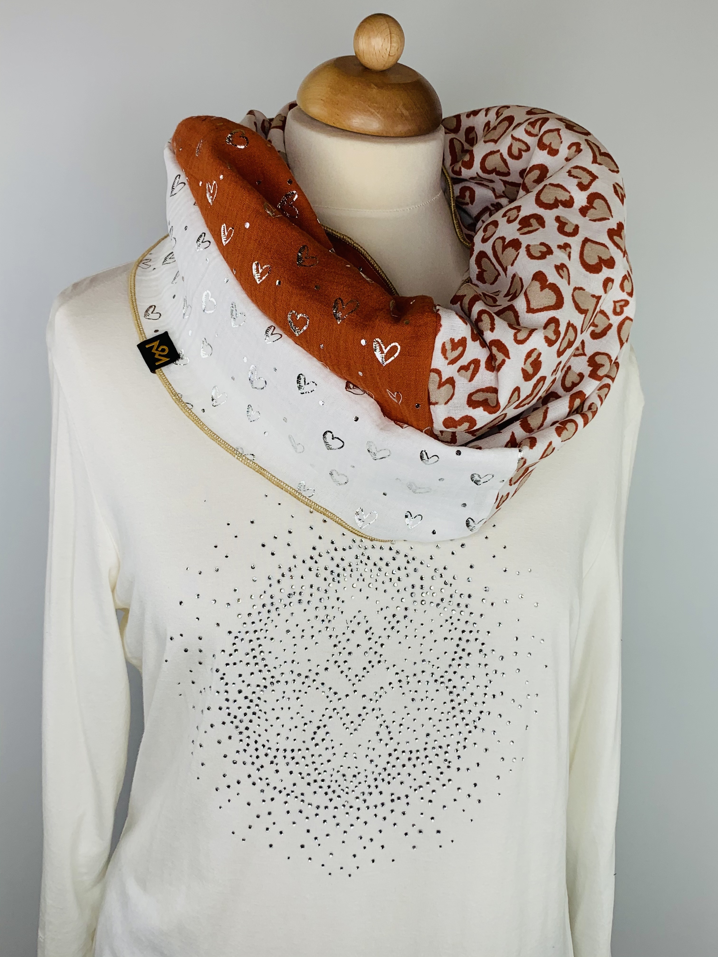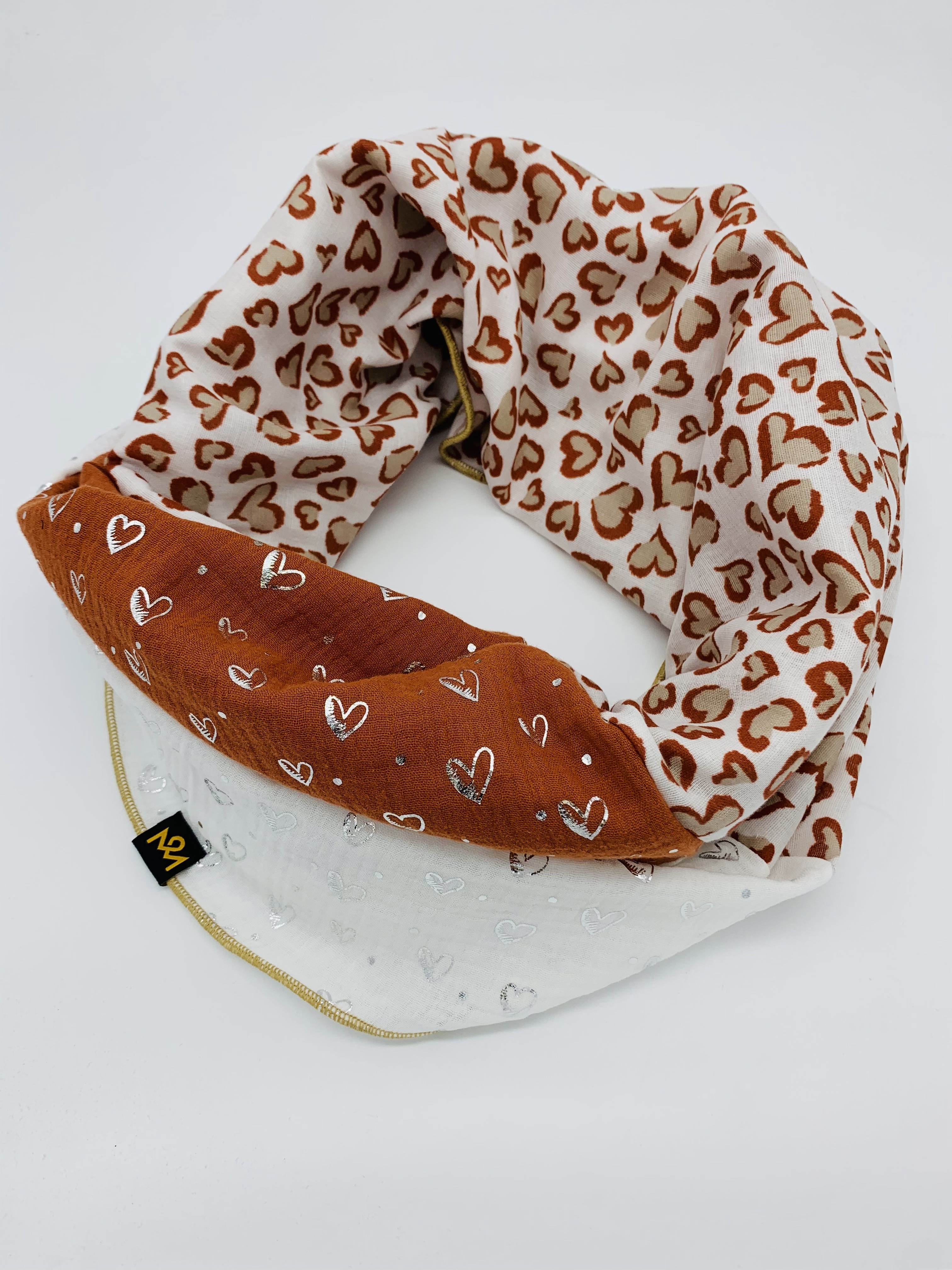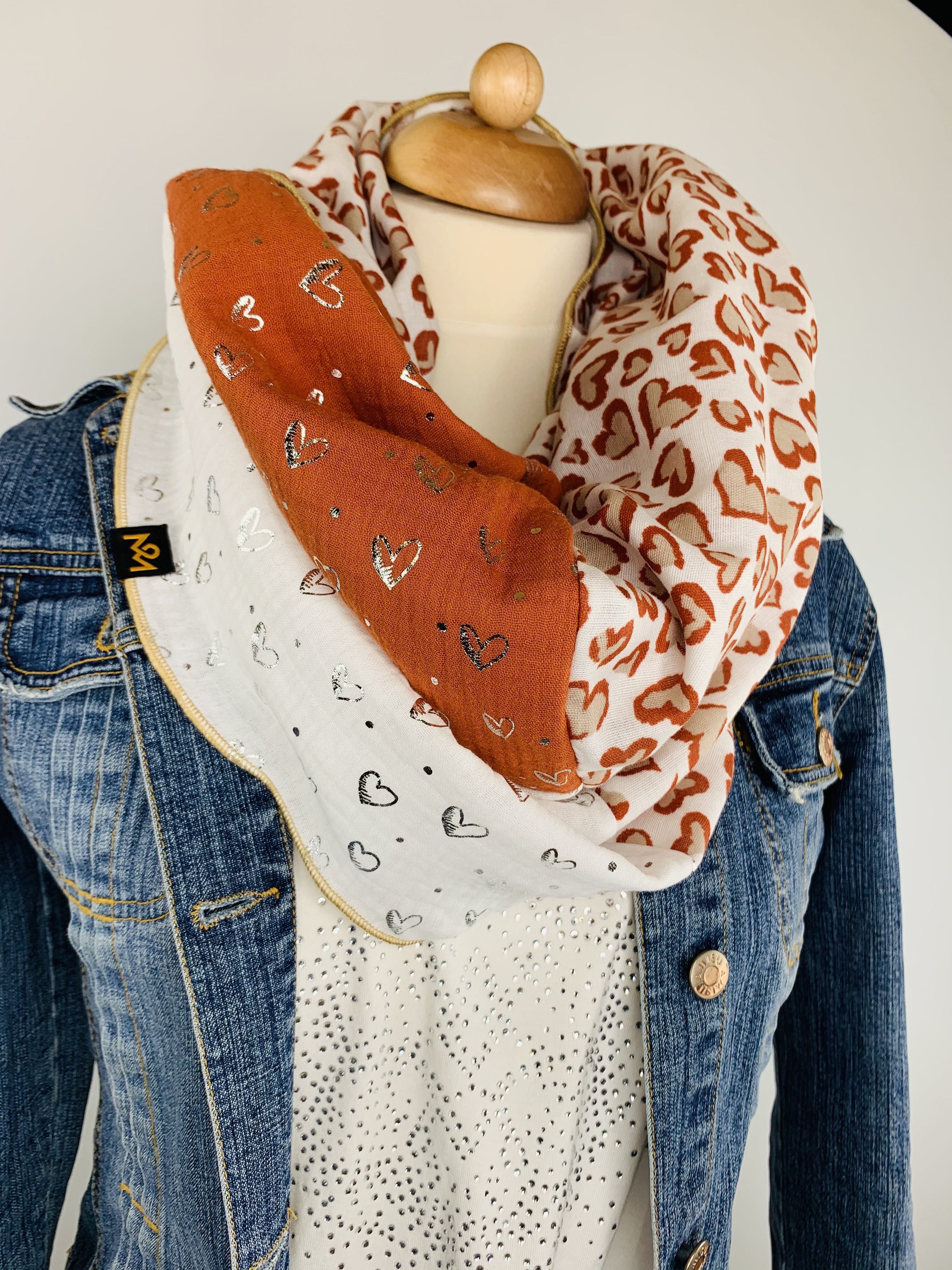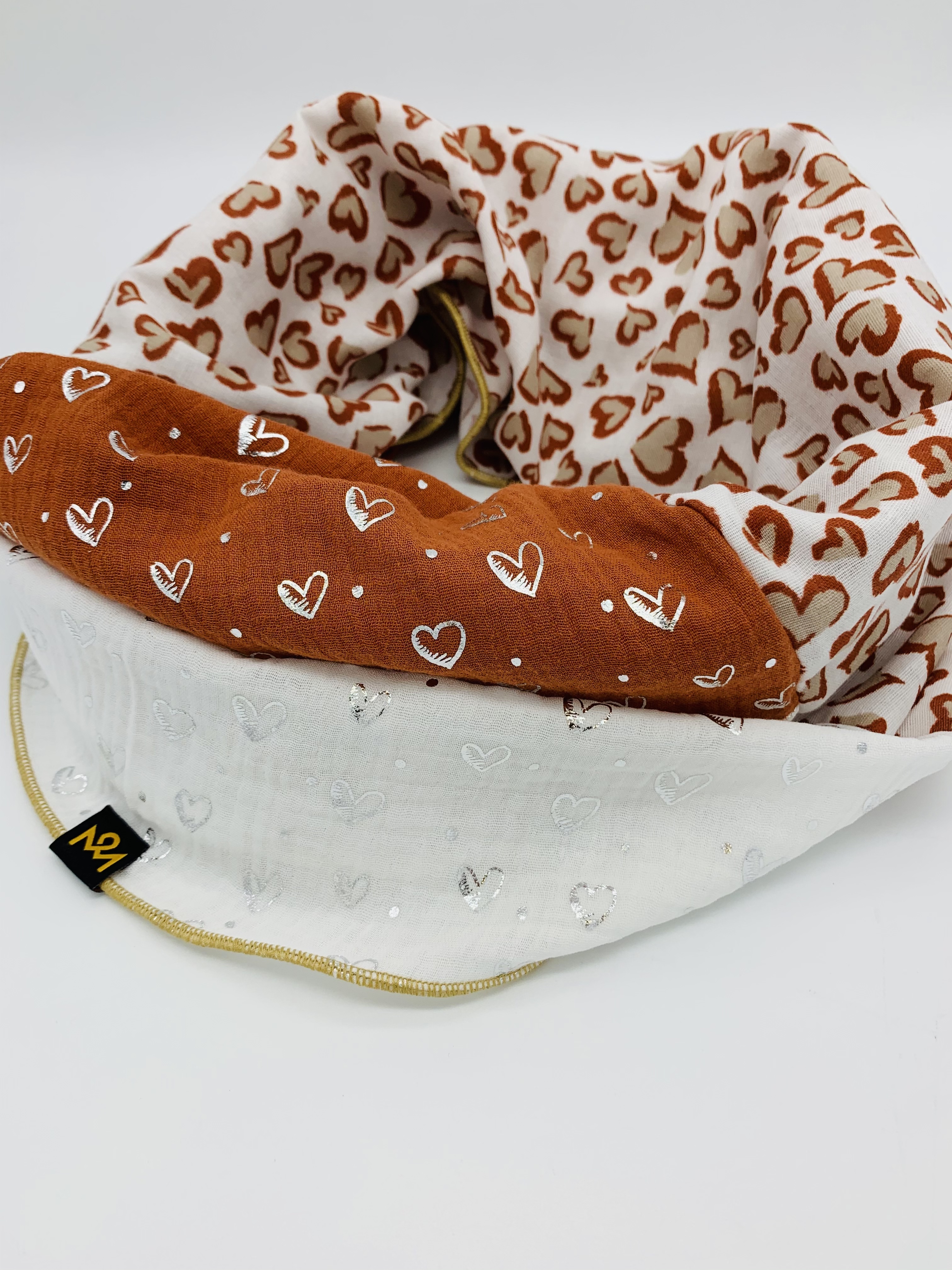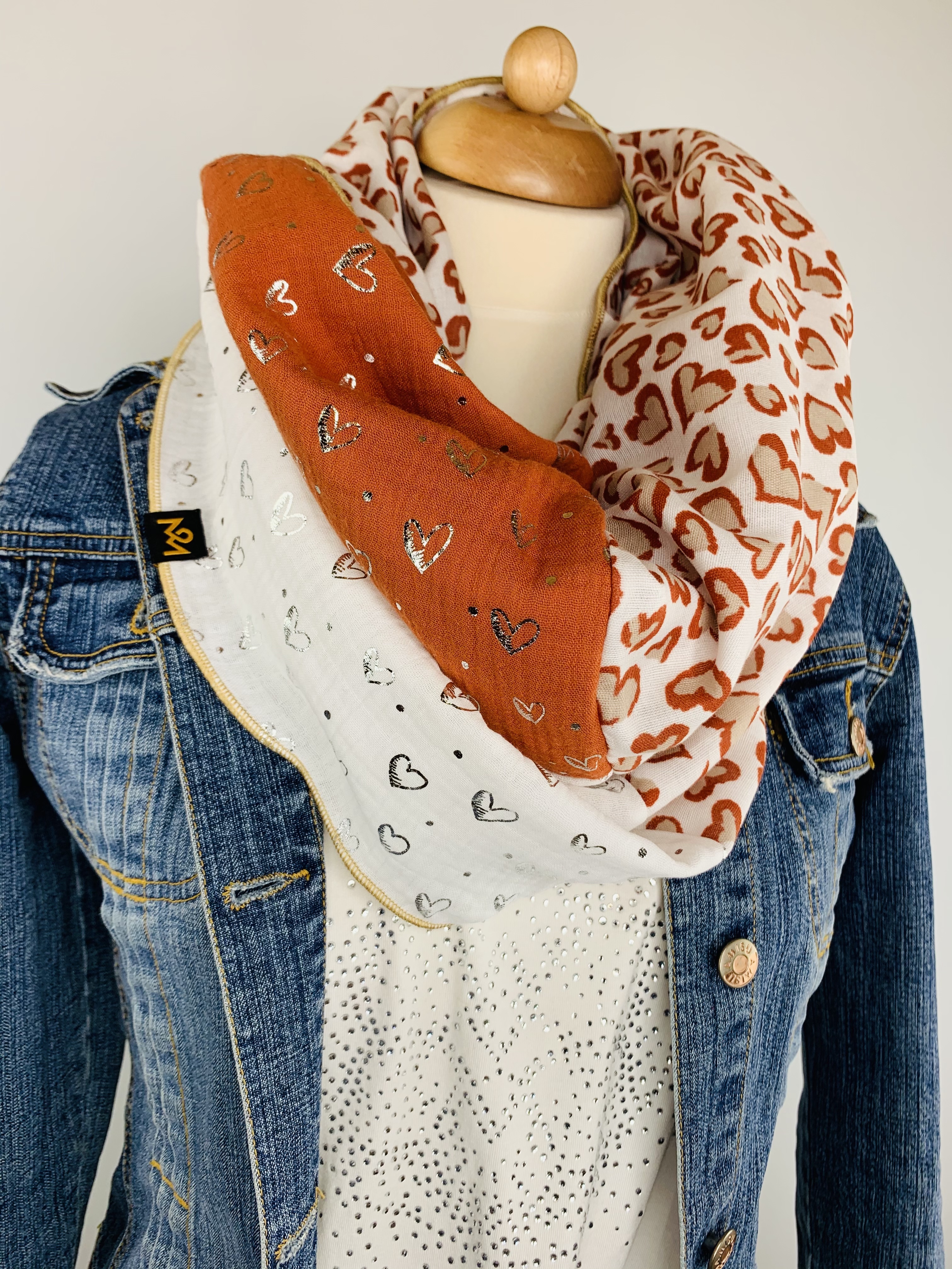 Hochwertiger, doppelt gewebter Schlauchschal aus 100 % Baumwollmusselin in gebrochenem weiß mit silbernen Herzchen, Leo Herzchen in rostrot und rostrot mit silbernen Herzchen.