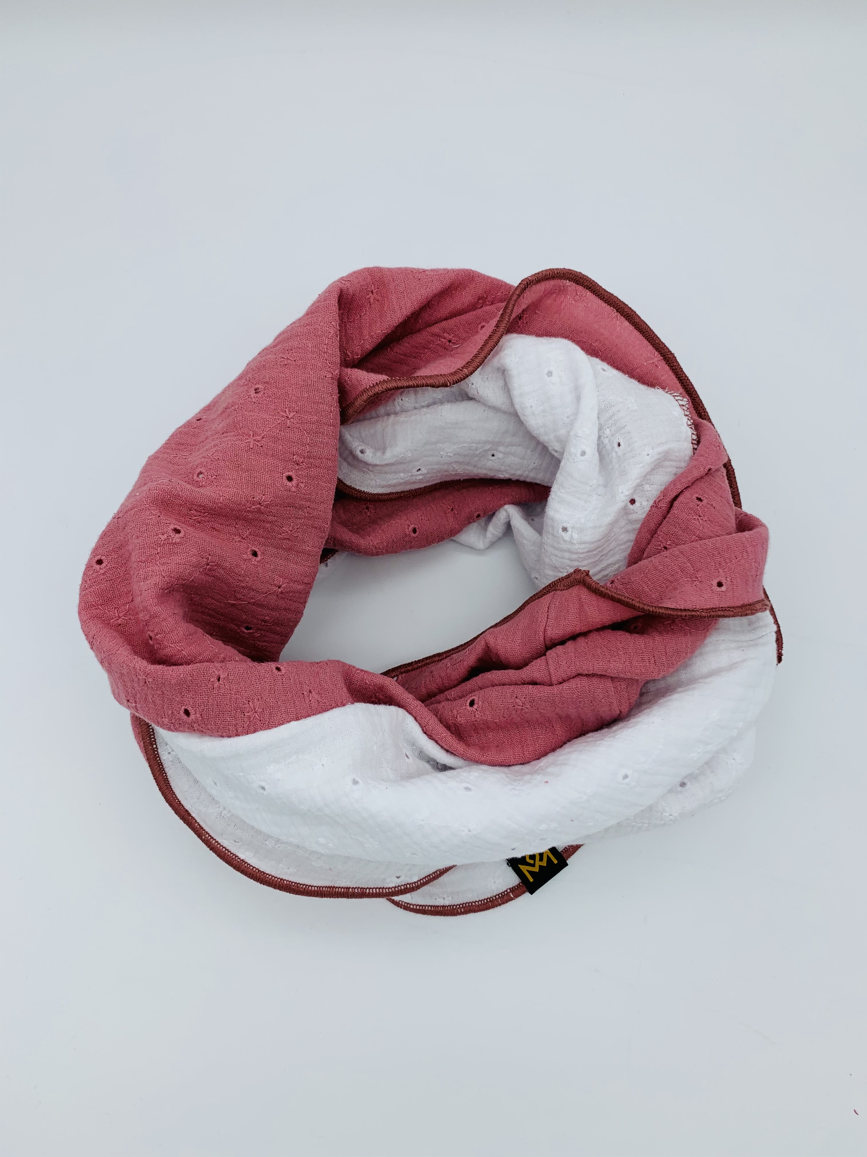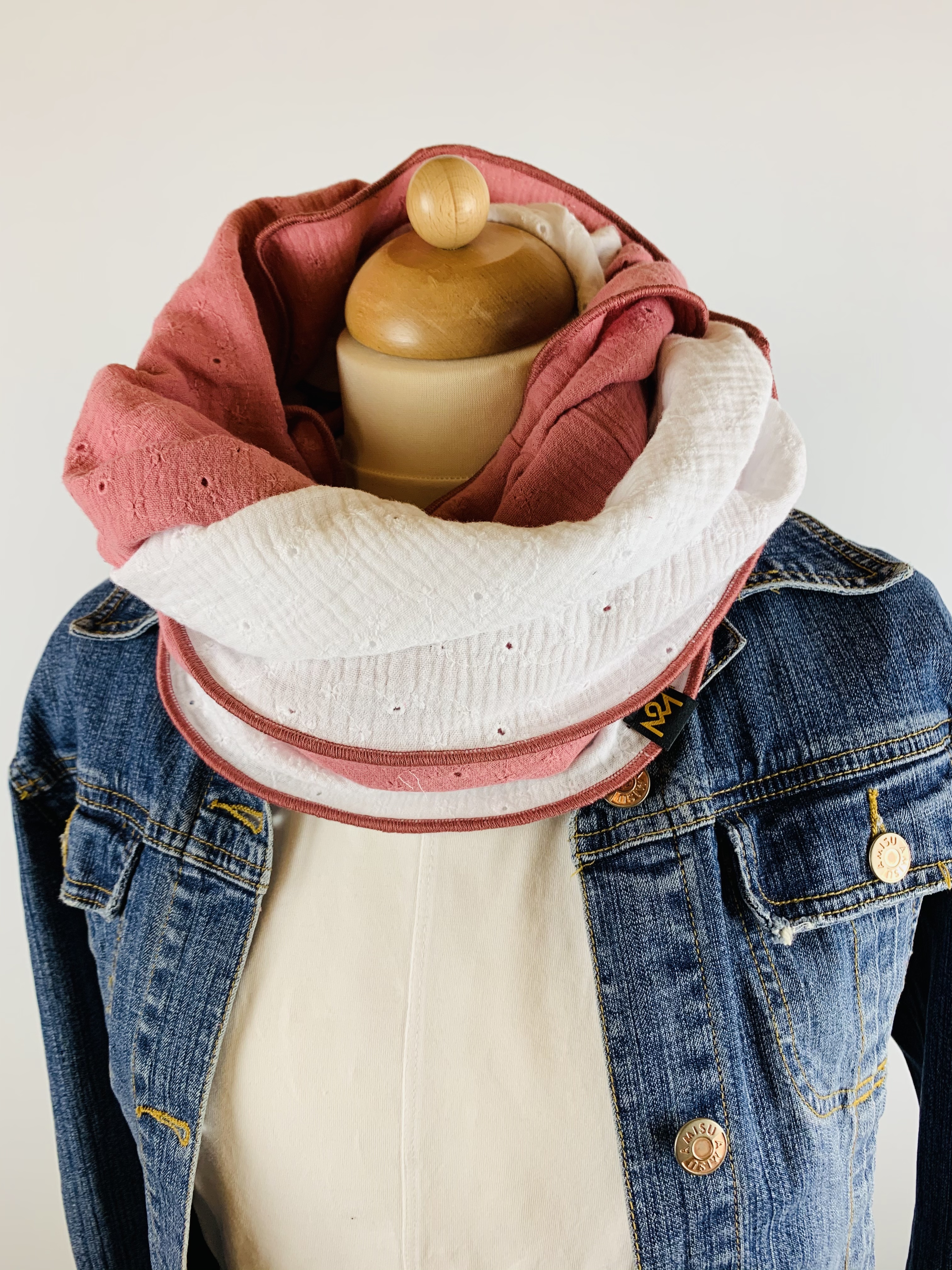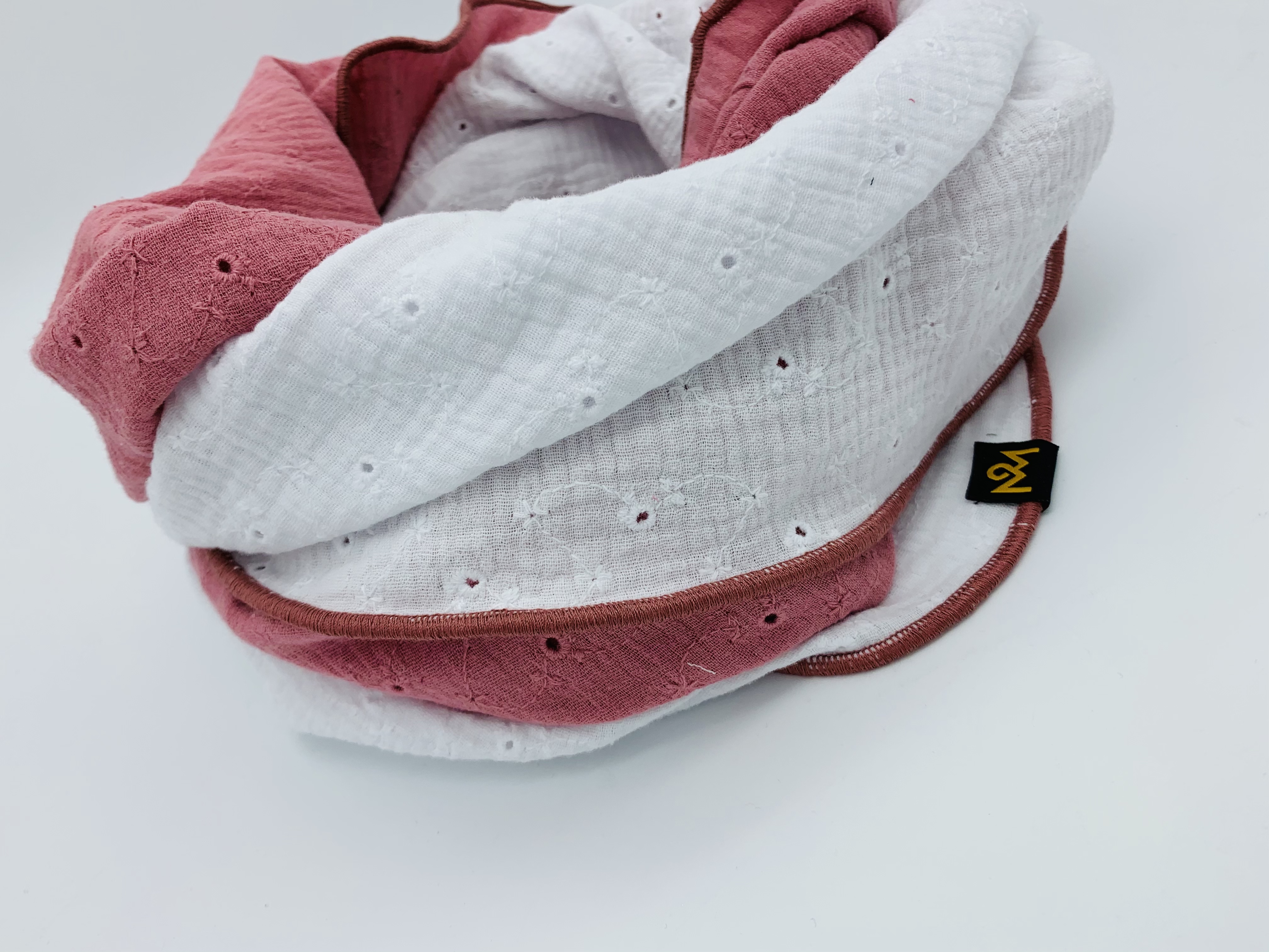 Hochwertiger, doppelt gewebter Schlauchschal aus 100 % Baumwollmusselin in weiß und altrosa mit Lochstickerei.