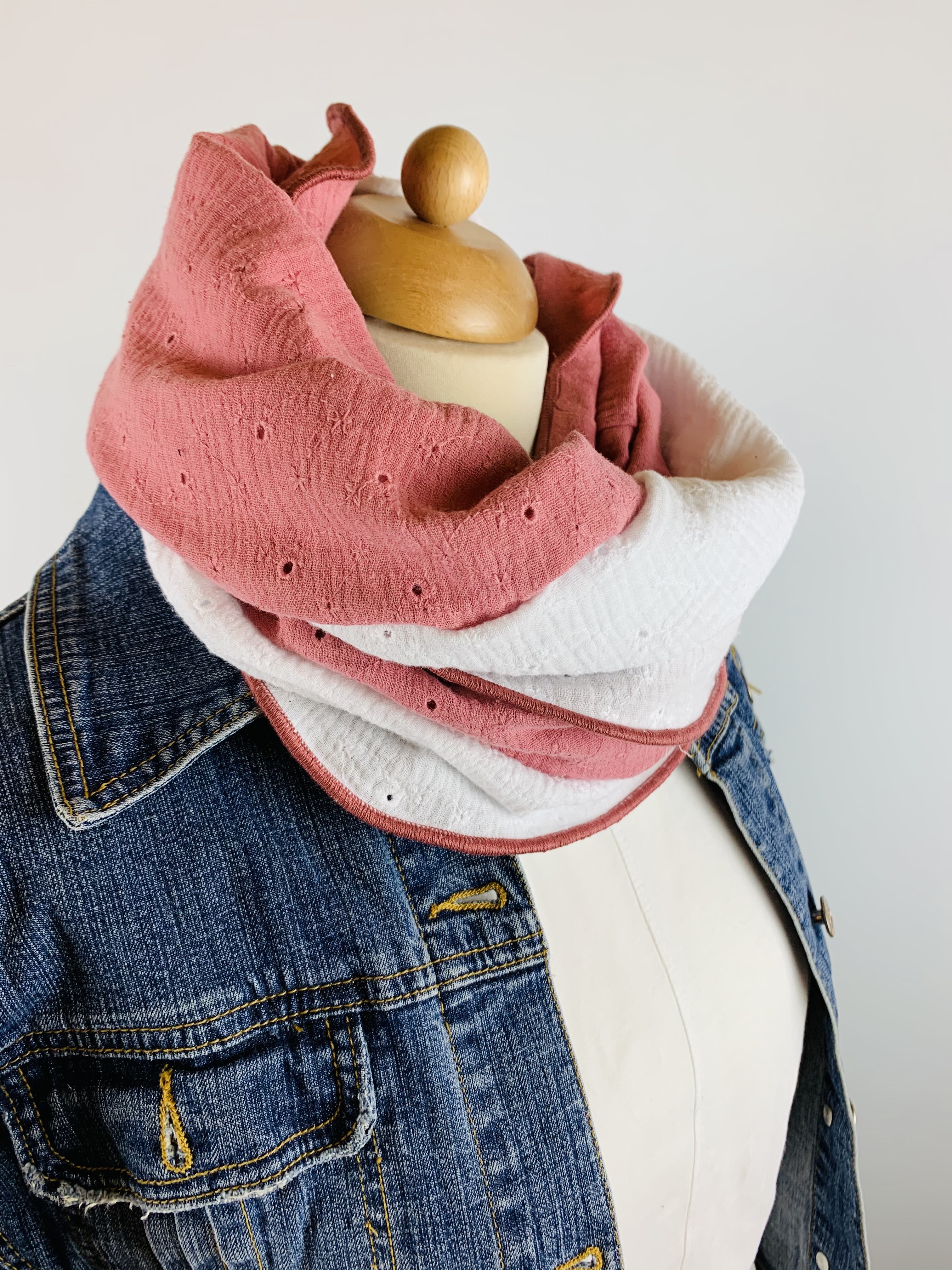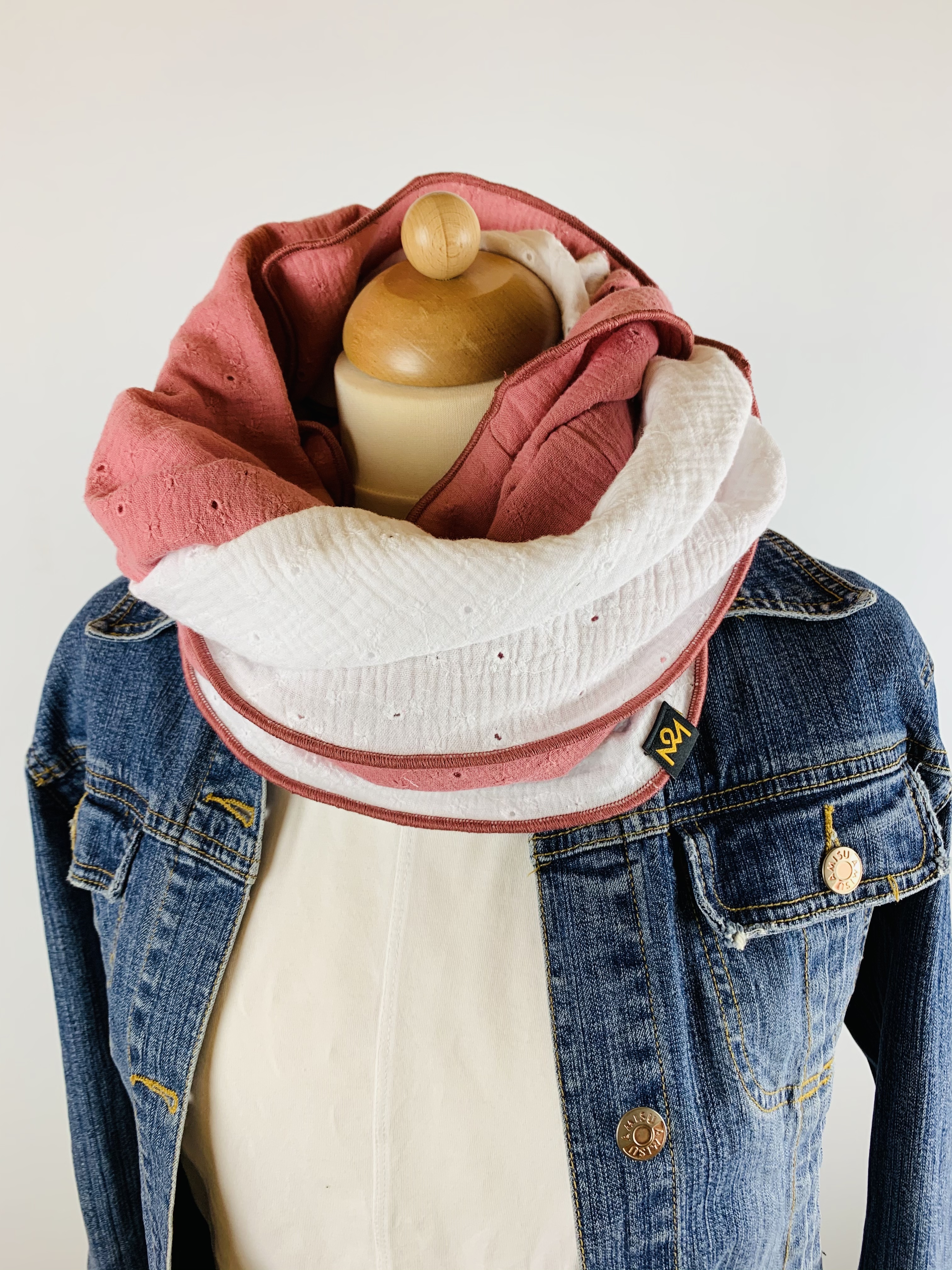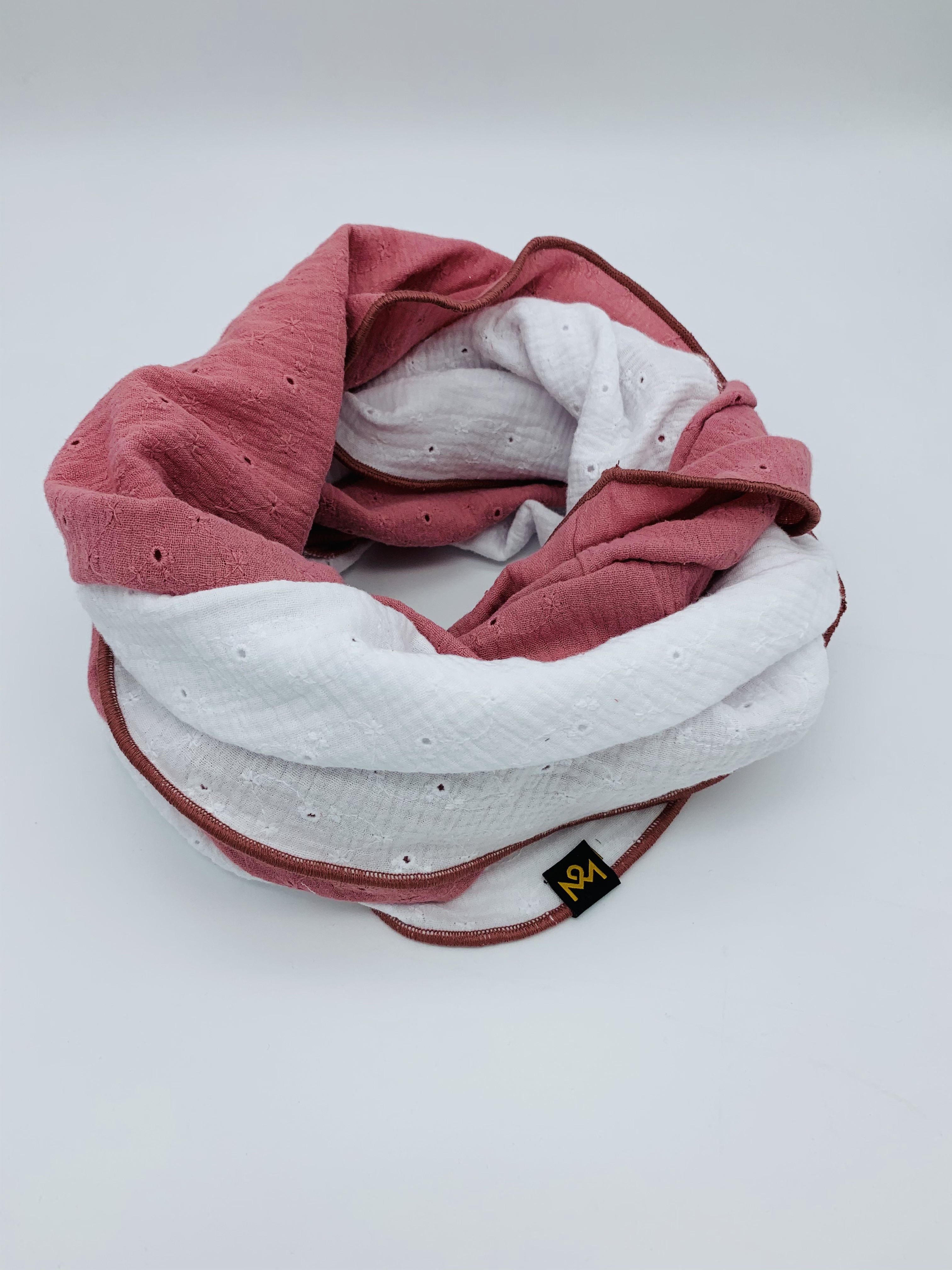 Hochwertiger, doppelt gewebter Schlauchschal aus 100 % Baumwollmusselin in weiß und altrosa mit Lochstickerei.