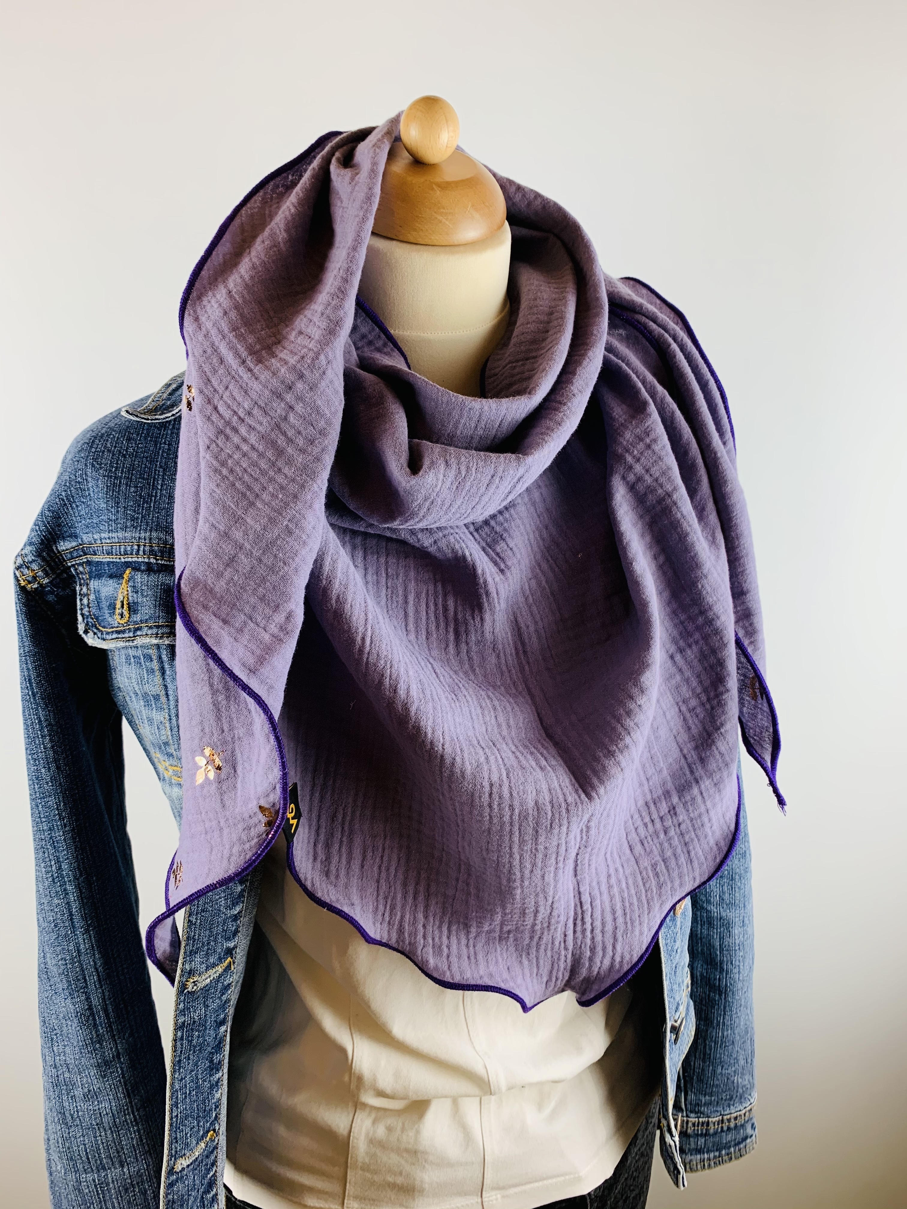 in kontrastierendem flieder mit lila Saum gefertigt.