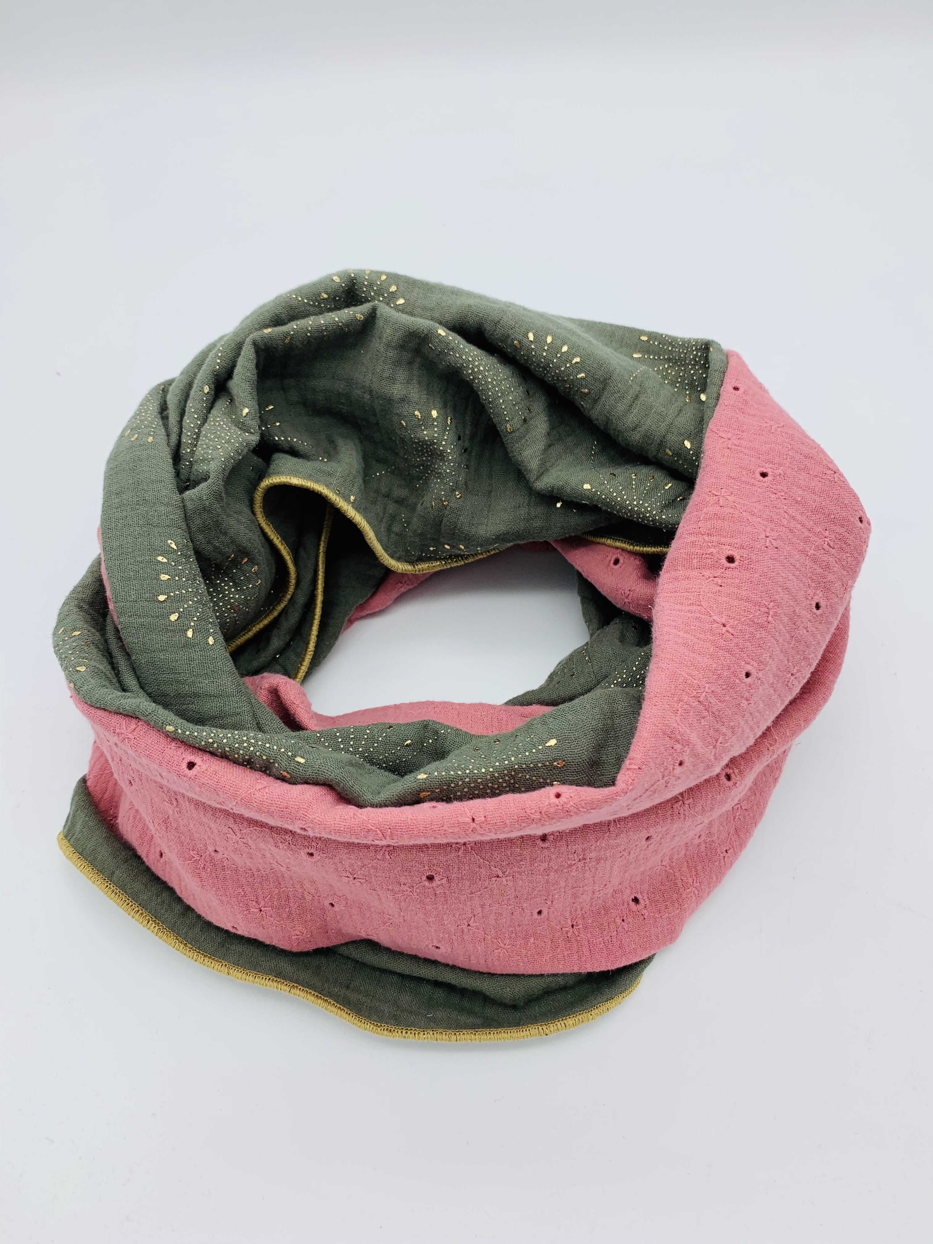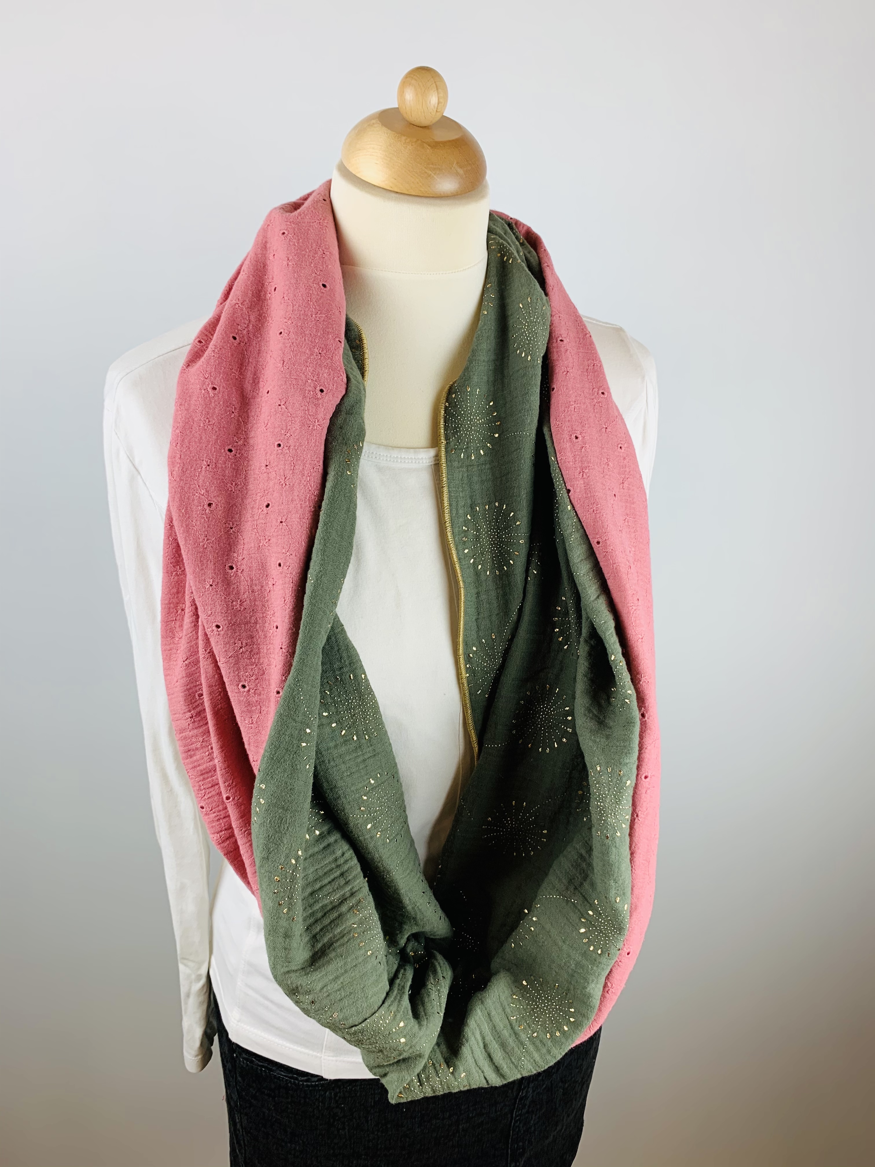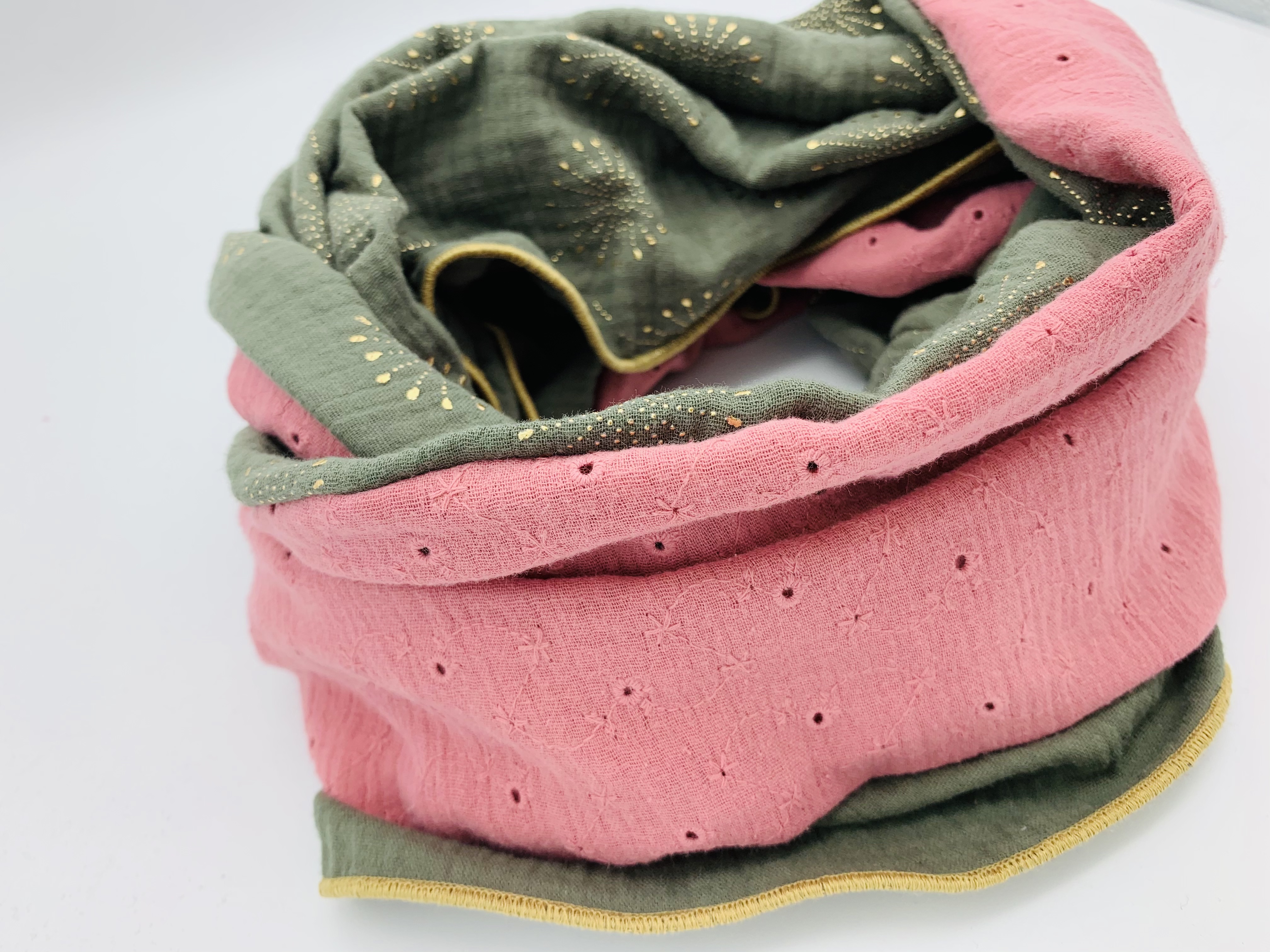 Hochwertiger, doppelt gewebter Schlauchschal aus 100 % Baumwollmusselin in khaki mit goldenen Pusteblumen und altrosaLochstickerei.