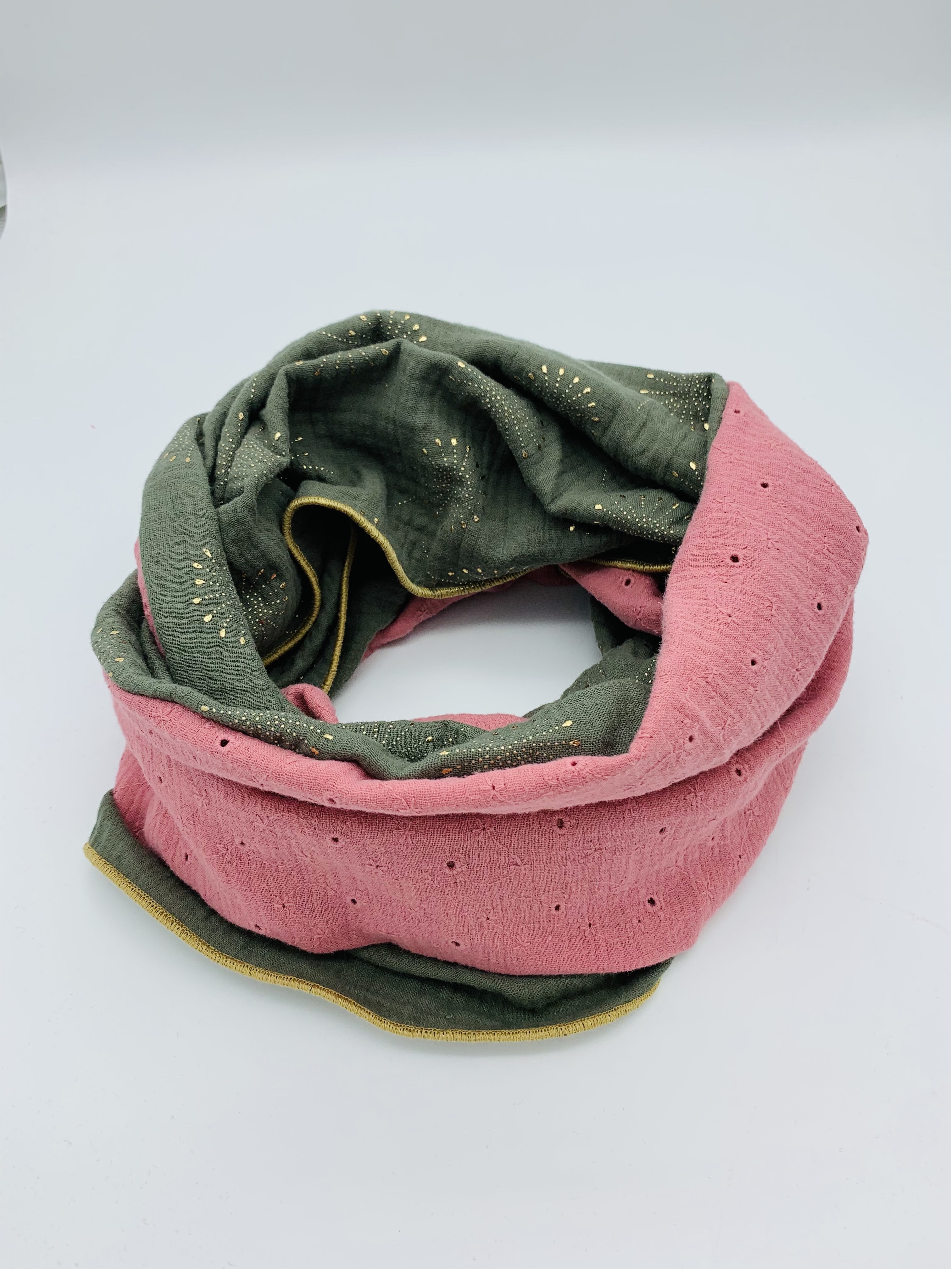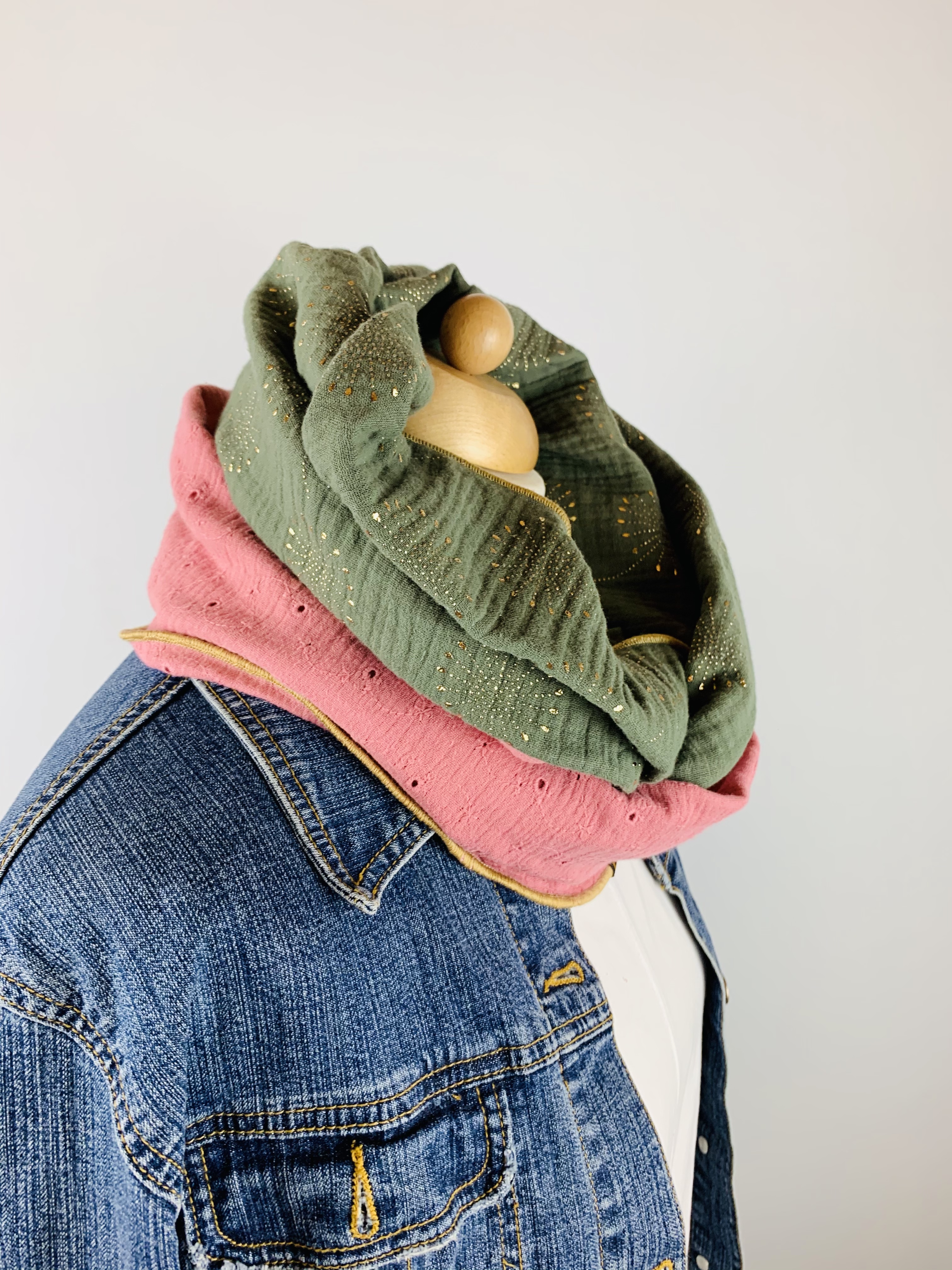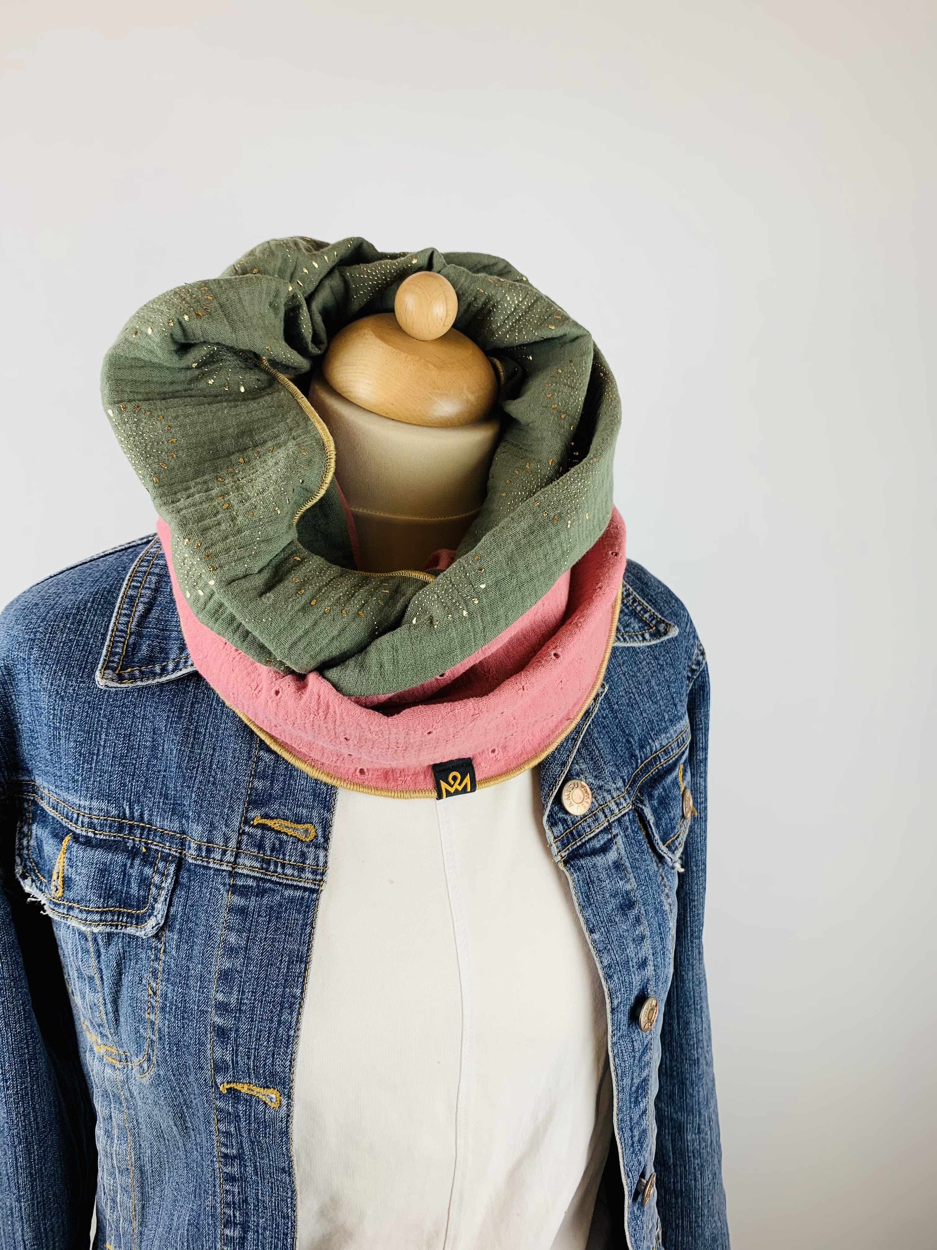 Hochwertiger, doppelt gewebter Schlauchschal aus 100 % Baumwollmusselin in khaki mit goldenen Pusteblumen und altrosaLochstickerei.