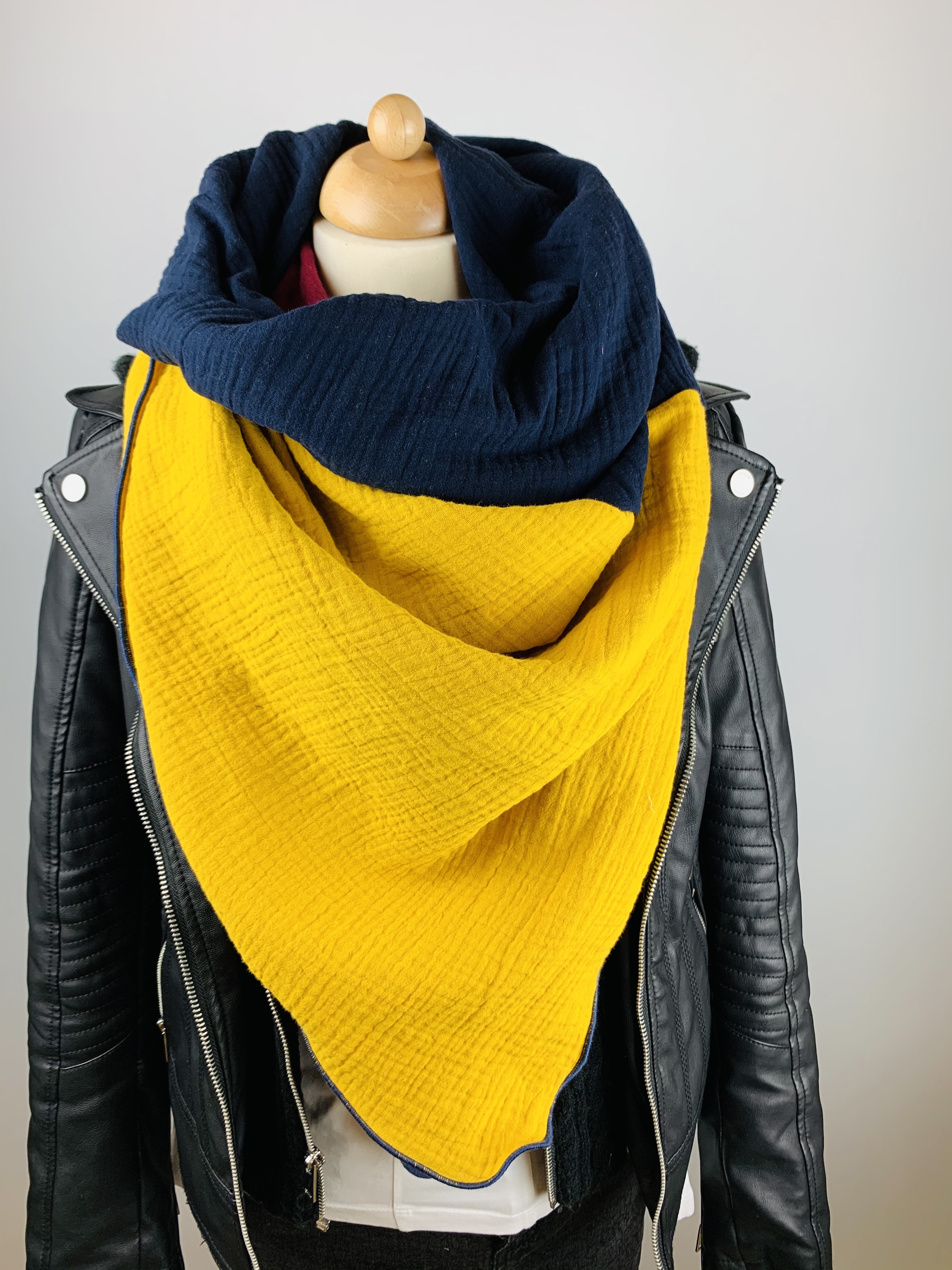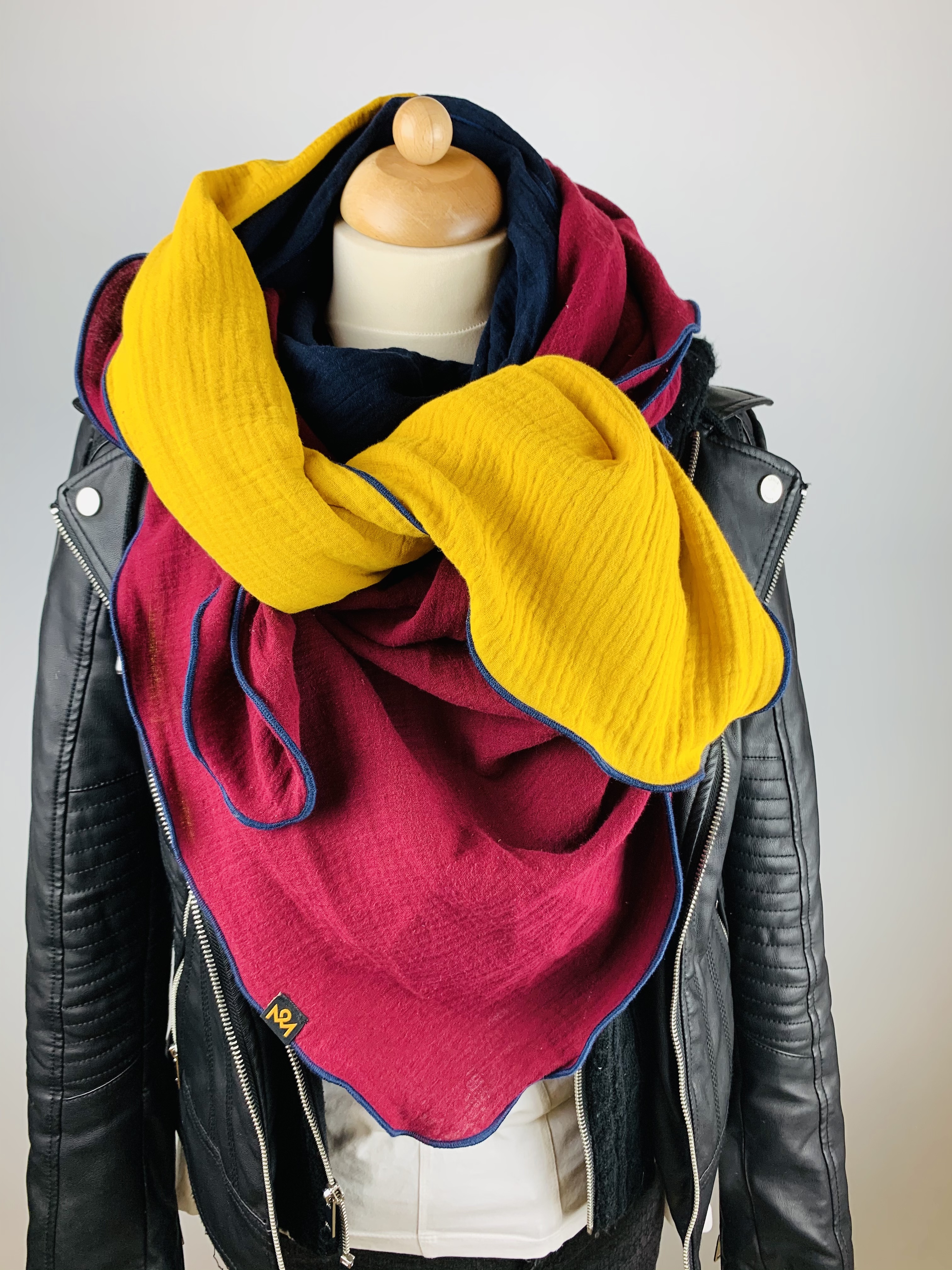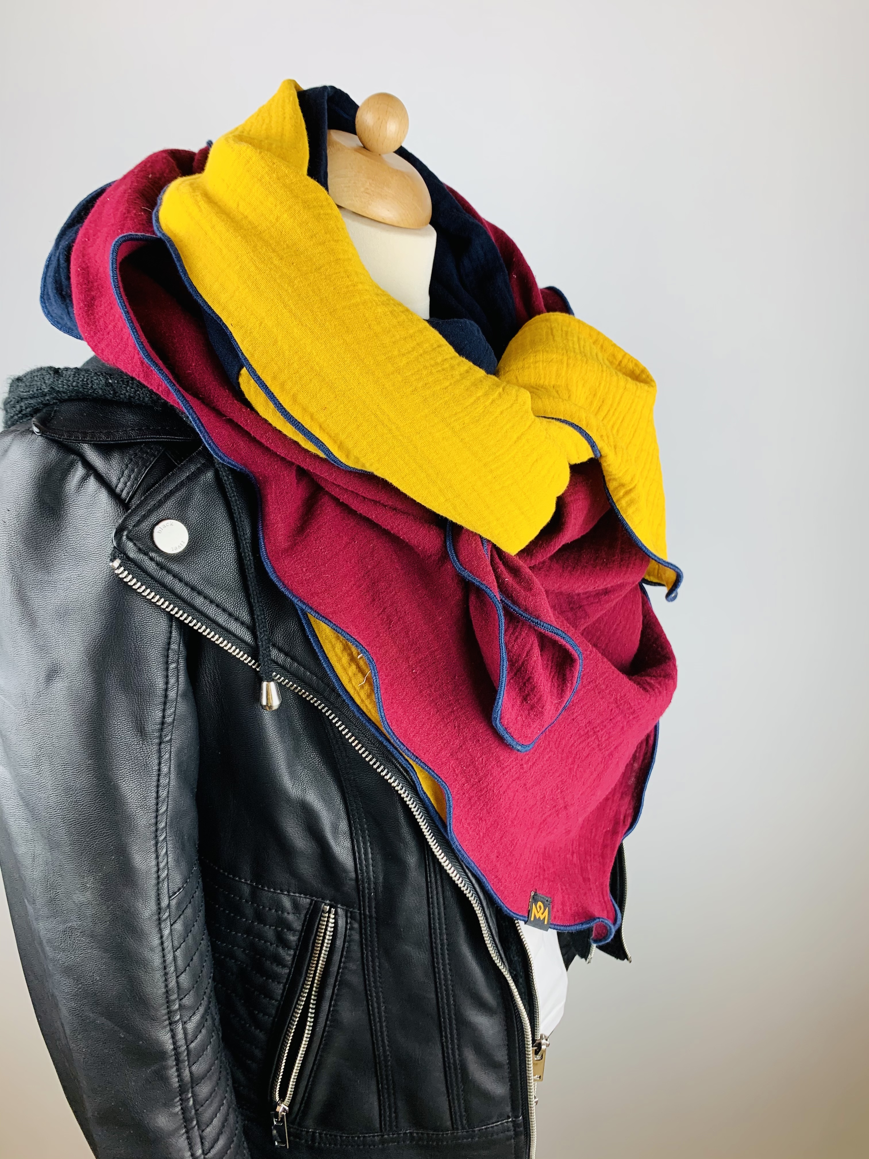 Dieser hochwertige, doppelt gewebte Schal aus 100 % Baumwollmusselin wurde in bordeaux, senfgelb und dunkelblau gefertigt.