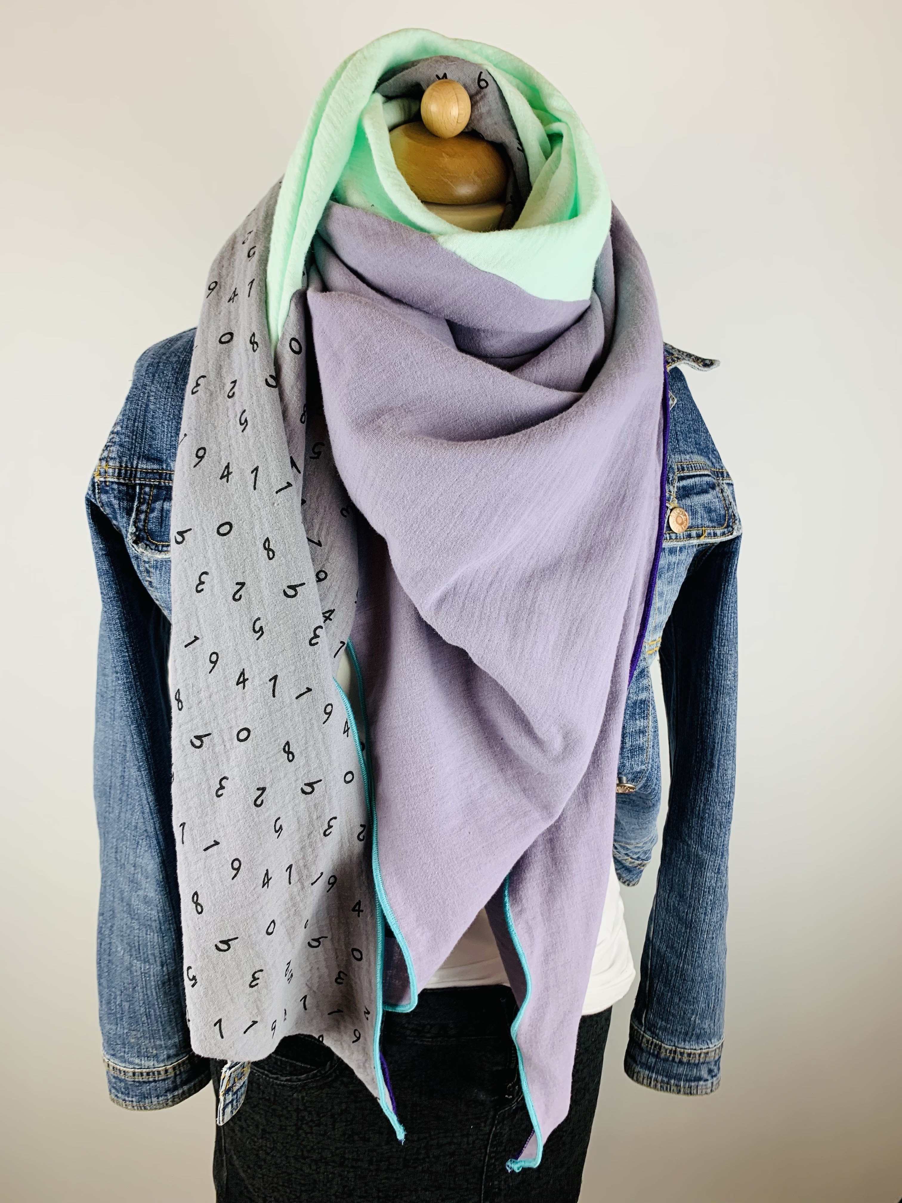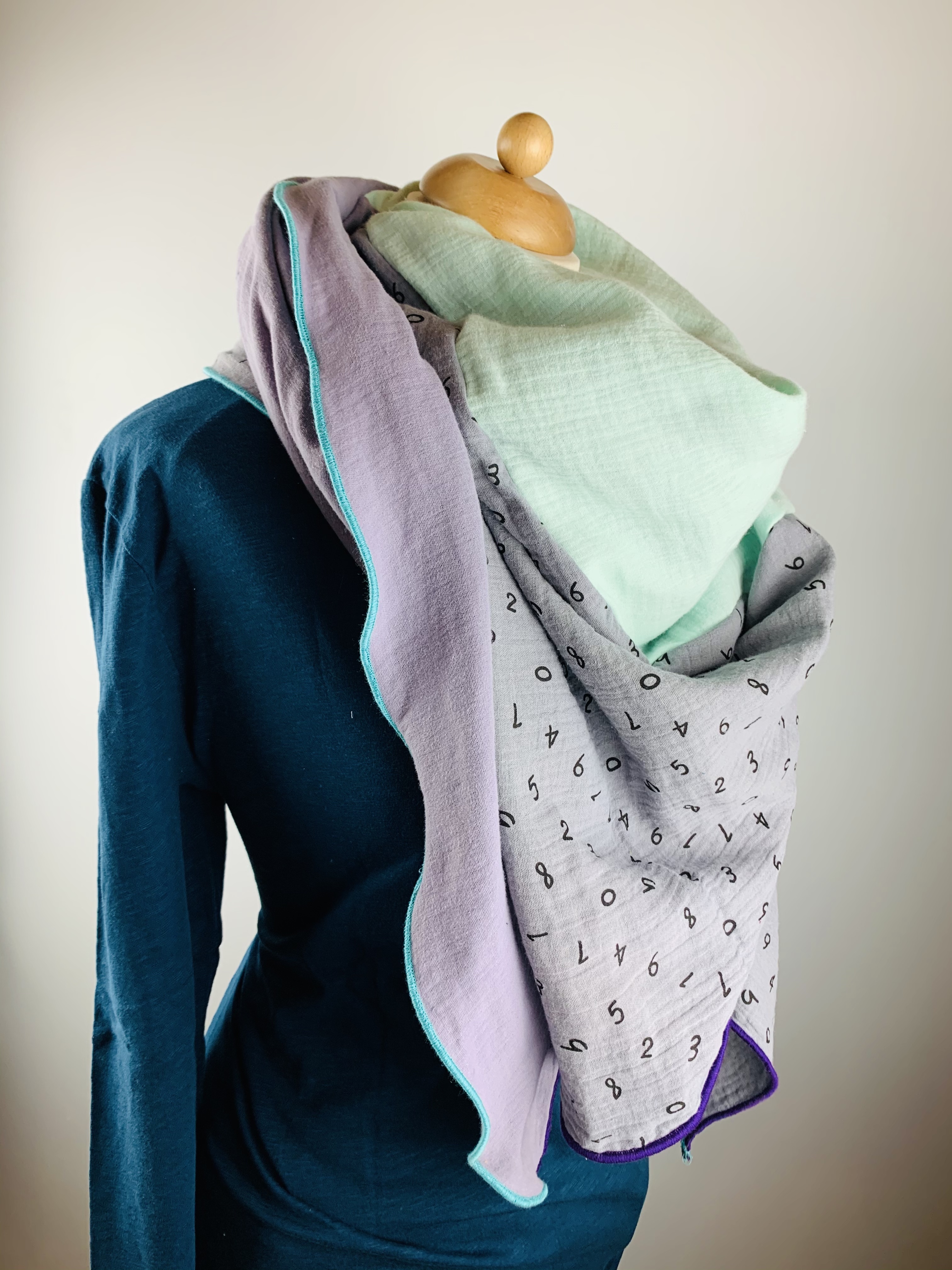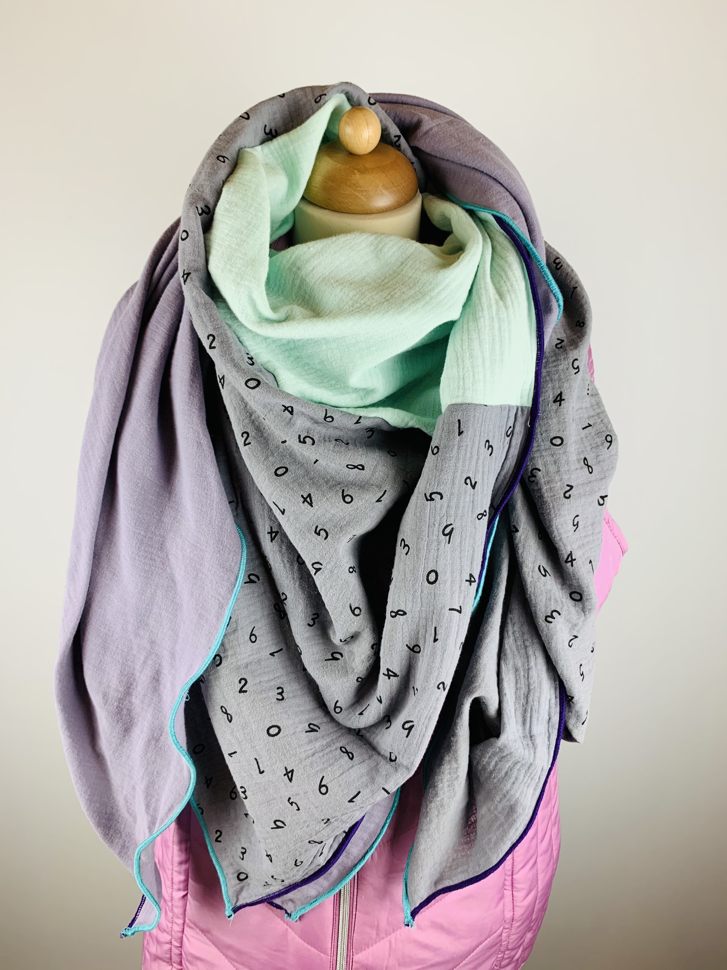 Die Einzigartigkeit des Designs wird durch die Struktur des weichen Musselins in Kombination mit dem Zahlen Print und dem zweifarbigen Saum in den Farben lila und türkis bestimmt.