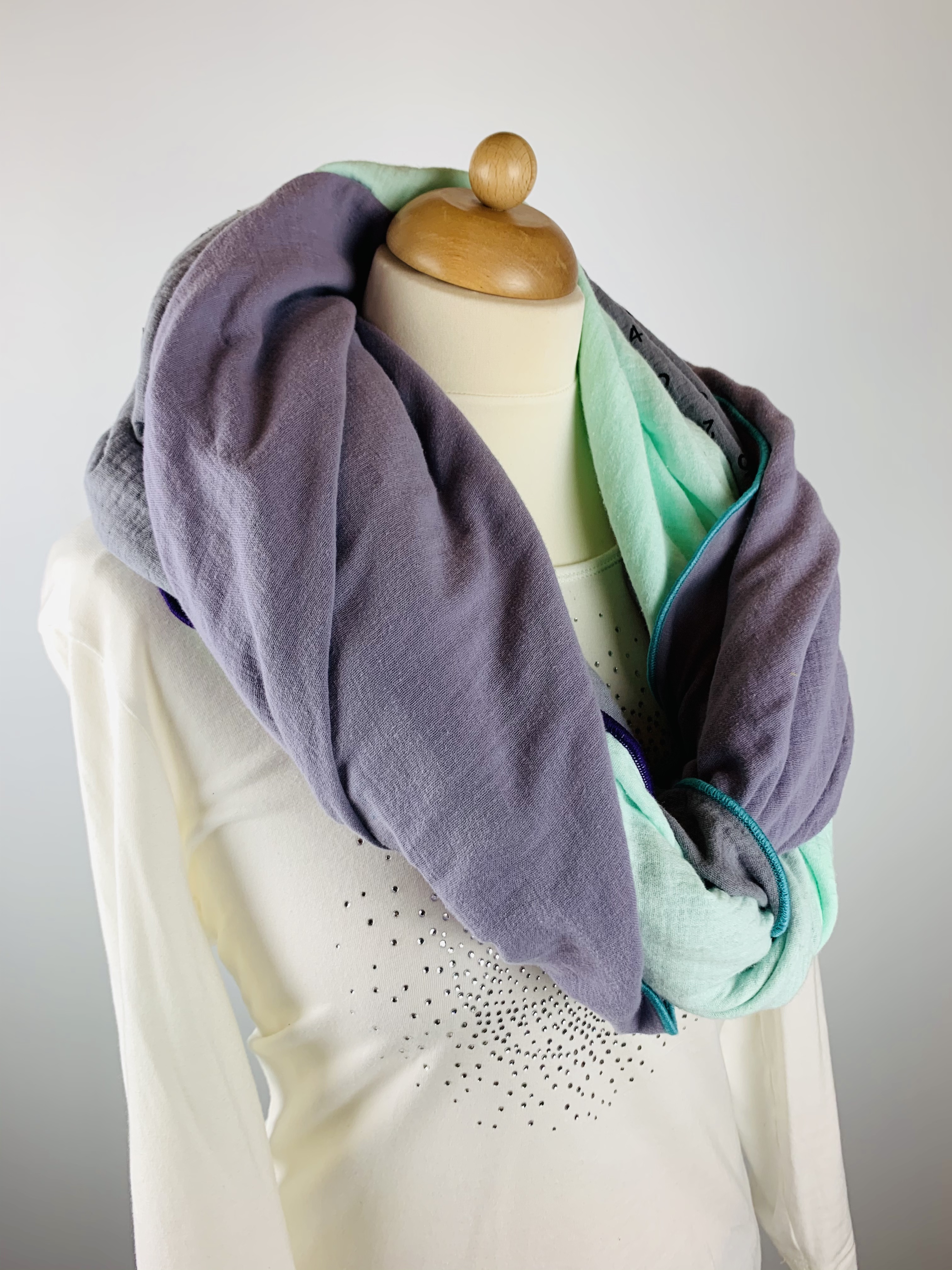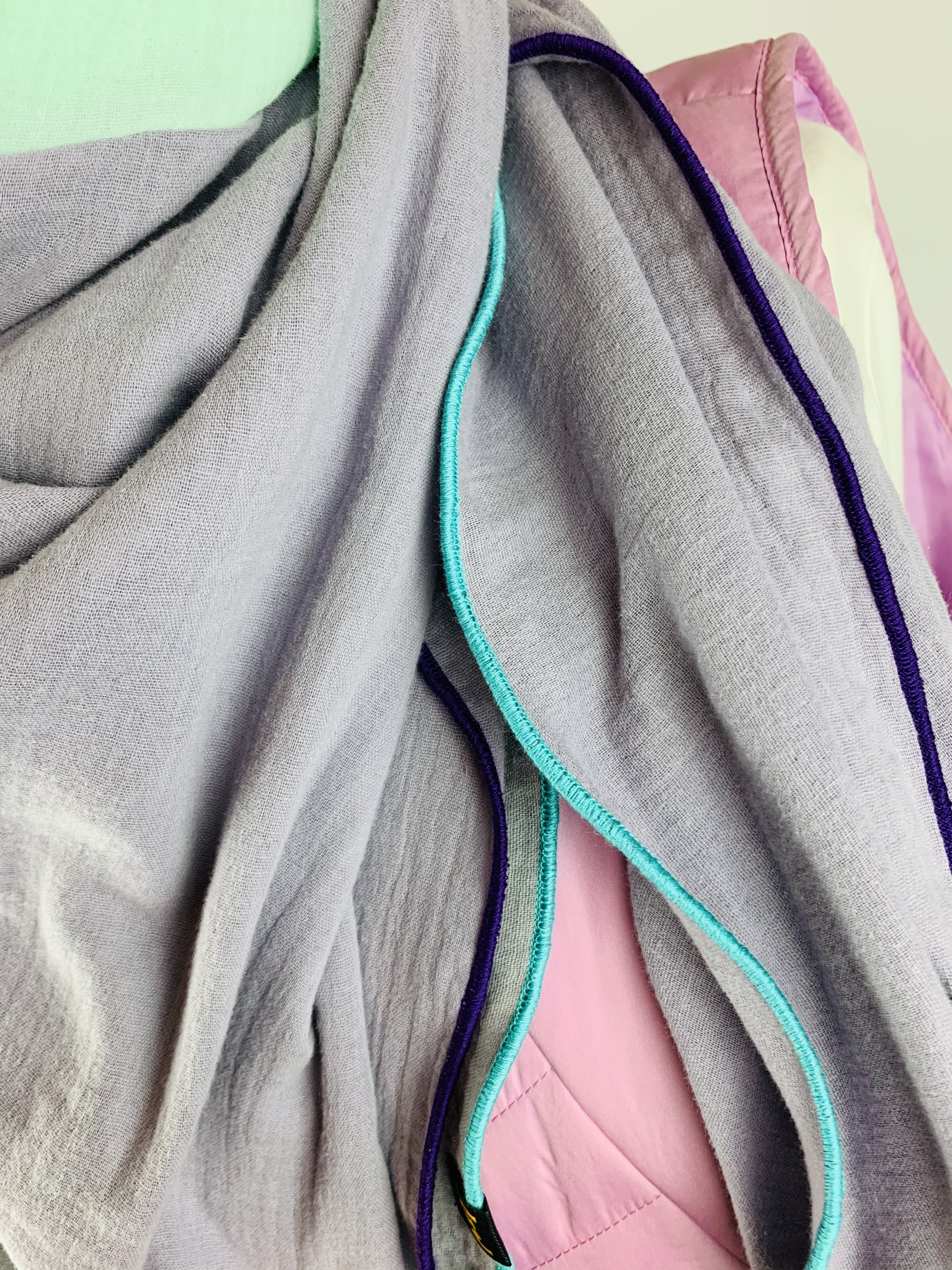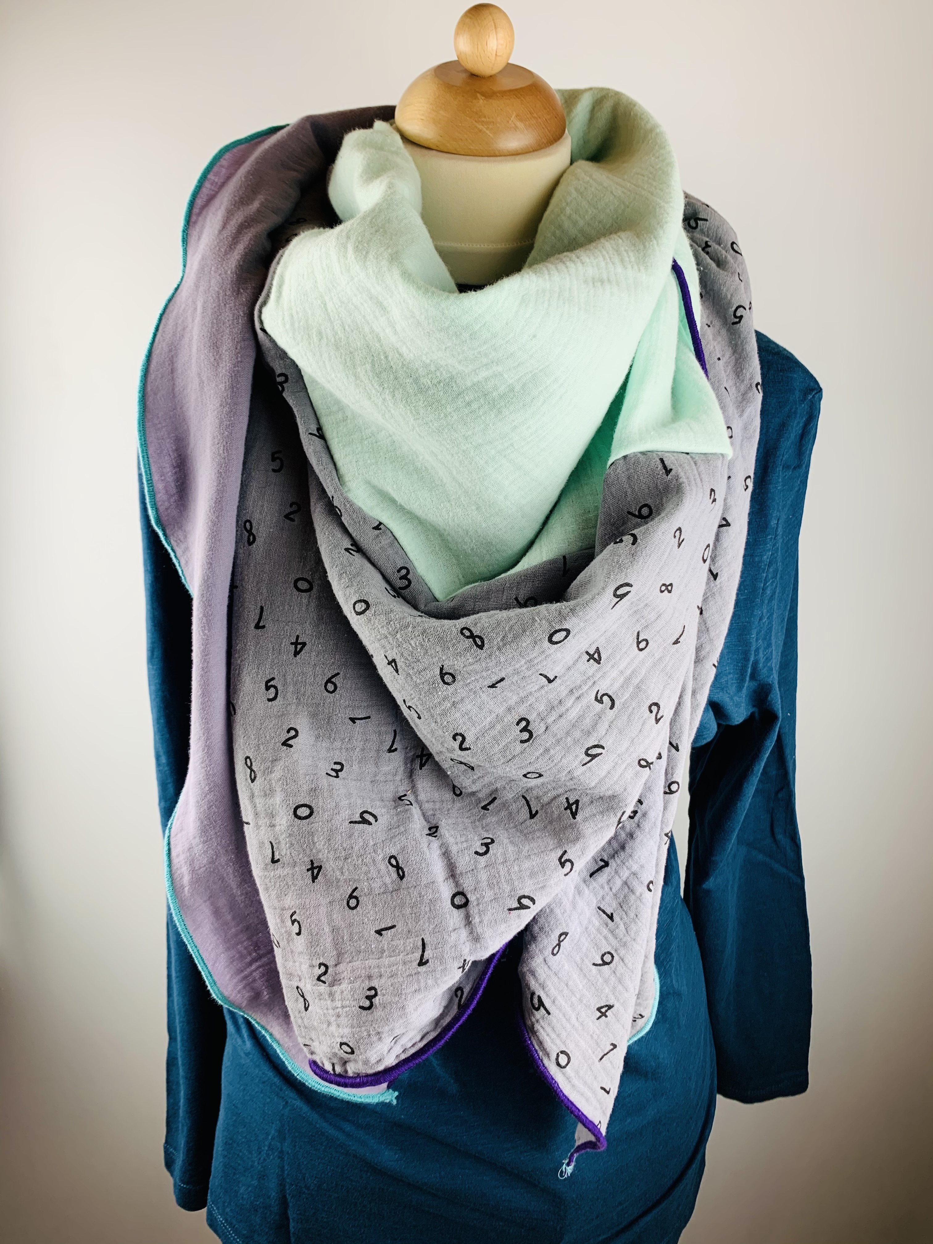 Die Einzigartigkeit des Designs wird durch die Struktur des weichen Musselins in Kombination mit dem Zahlen Print und dem zweifarbigen Saum in den Farben lila und türkis bestimmt.