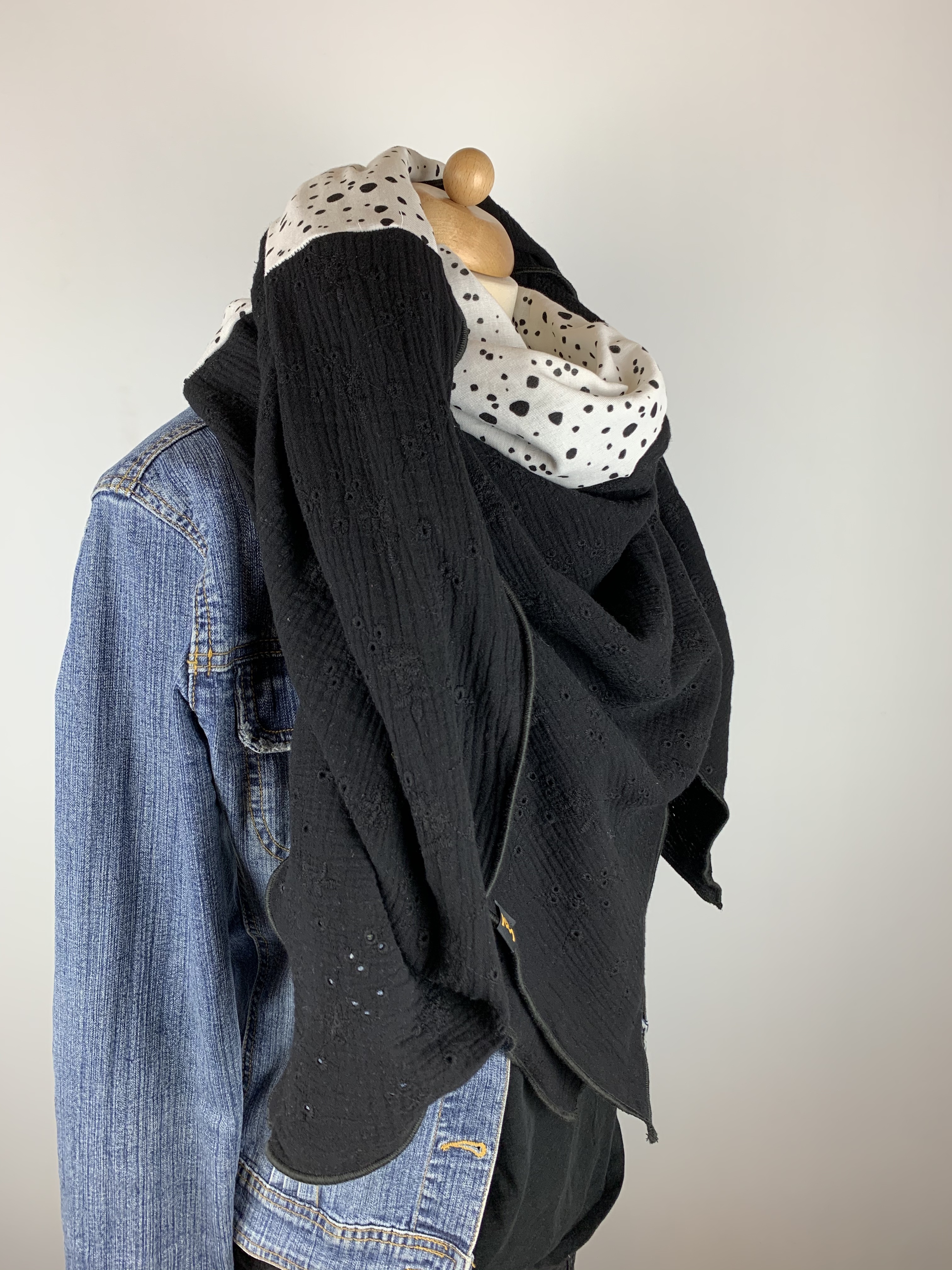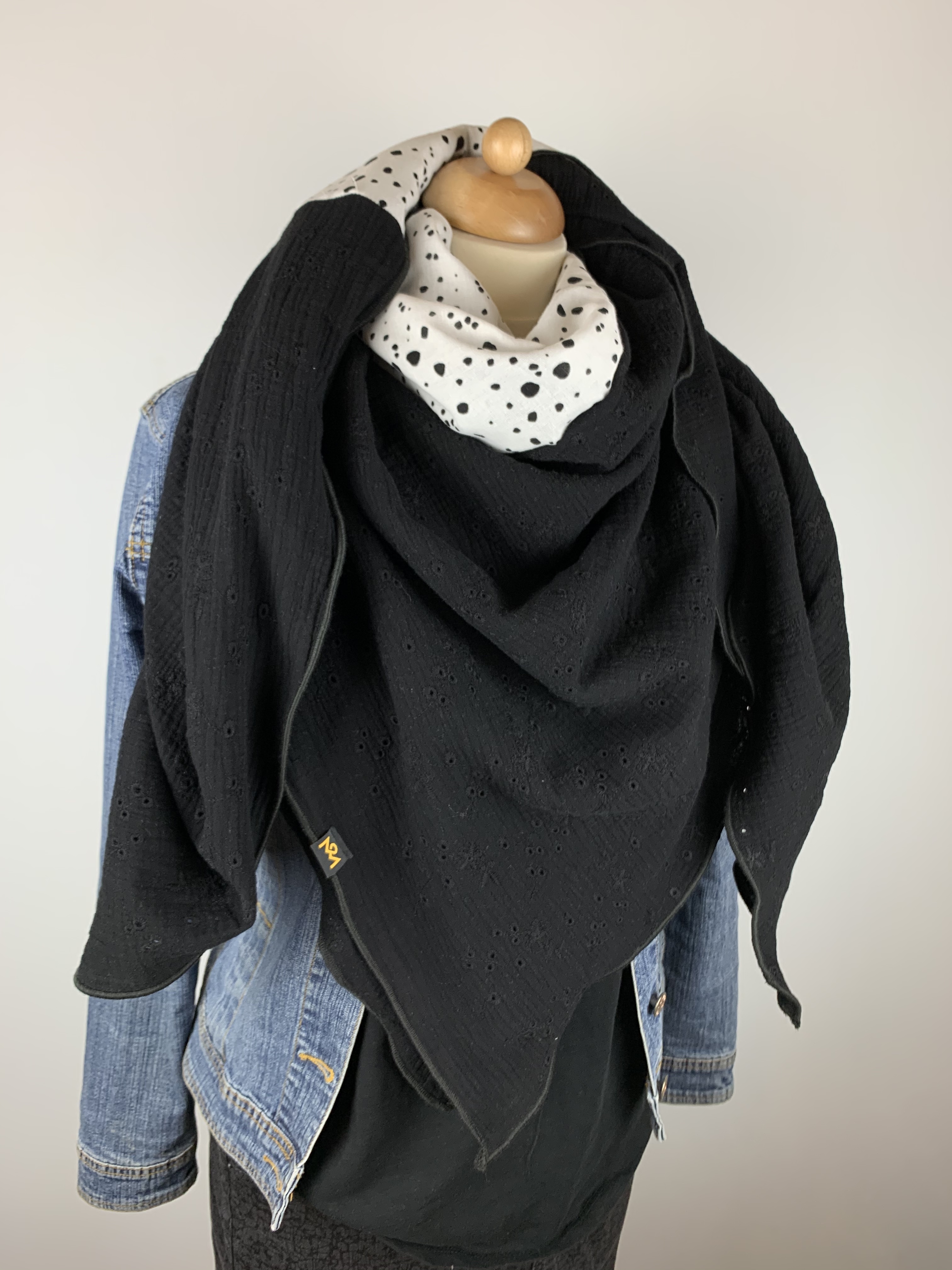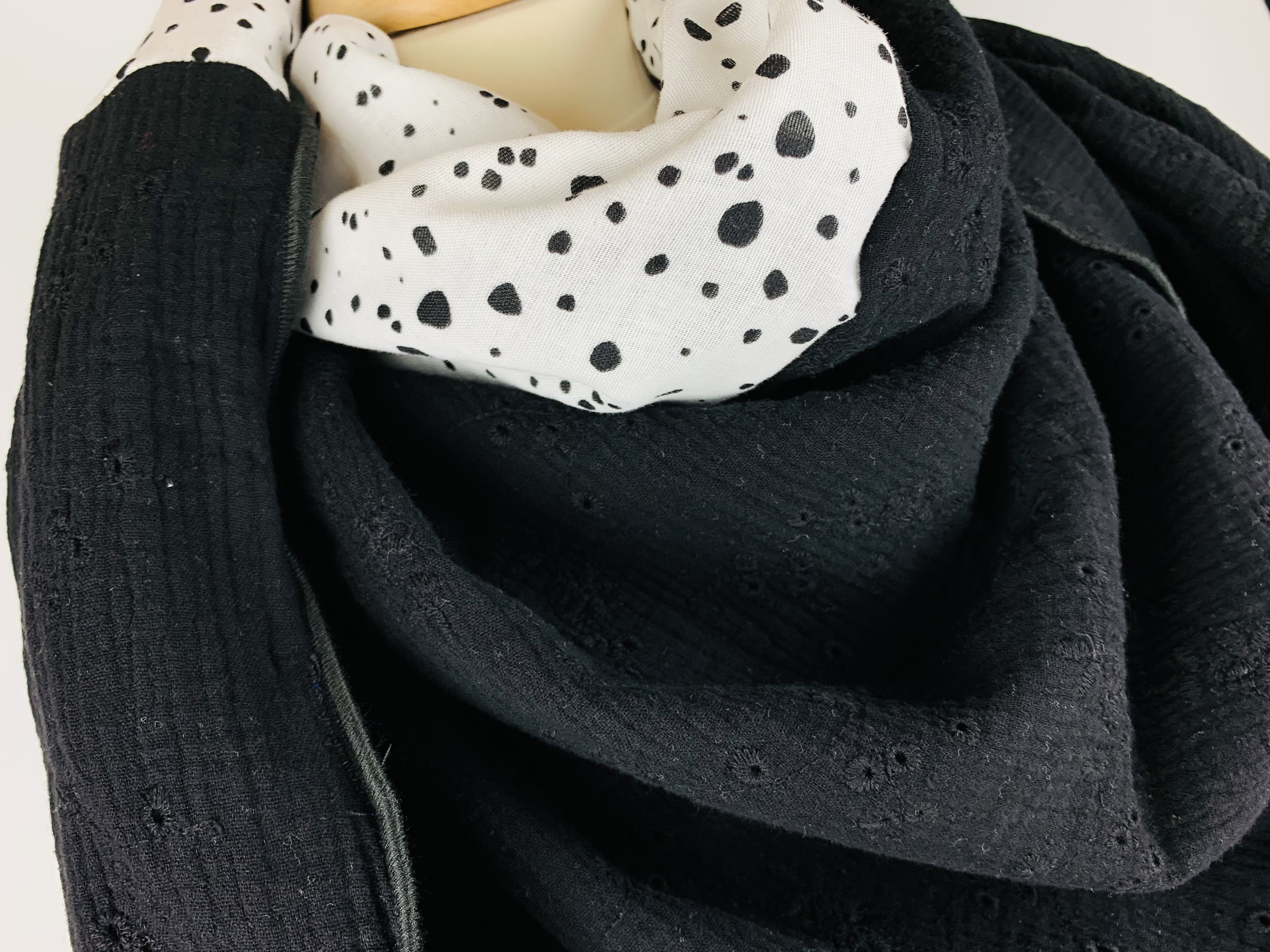 Dieses hochwertige, doppelt gewebte Tuch aus 100% Baumwollmusselin wurde in den Farben "Schwarz mit Blumenstickerei und Weiß mit schwarzen Tropfen" gefertigt.