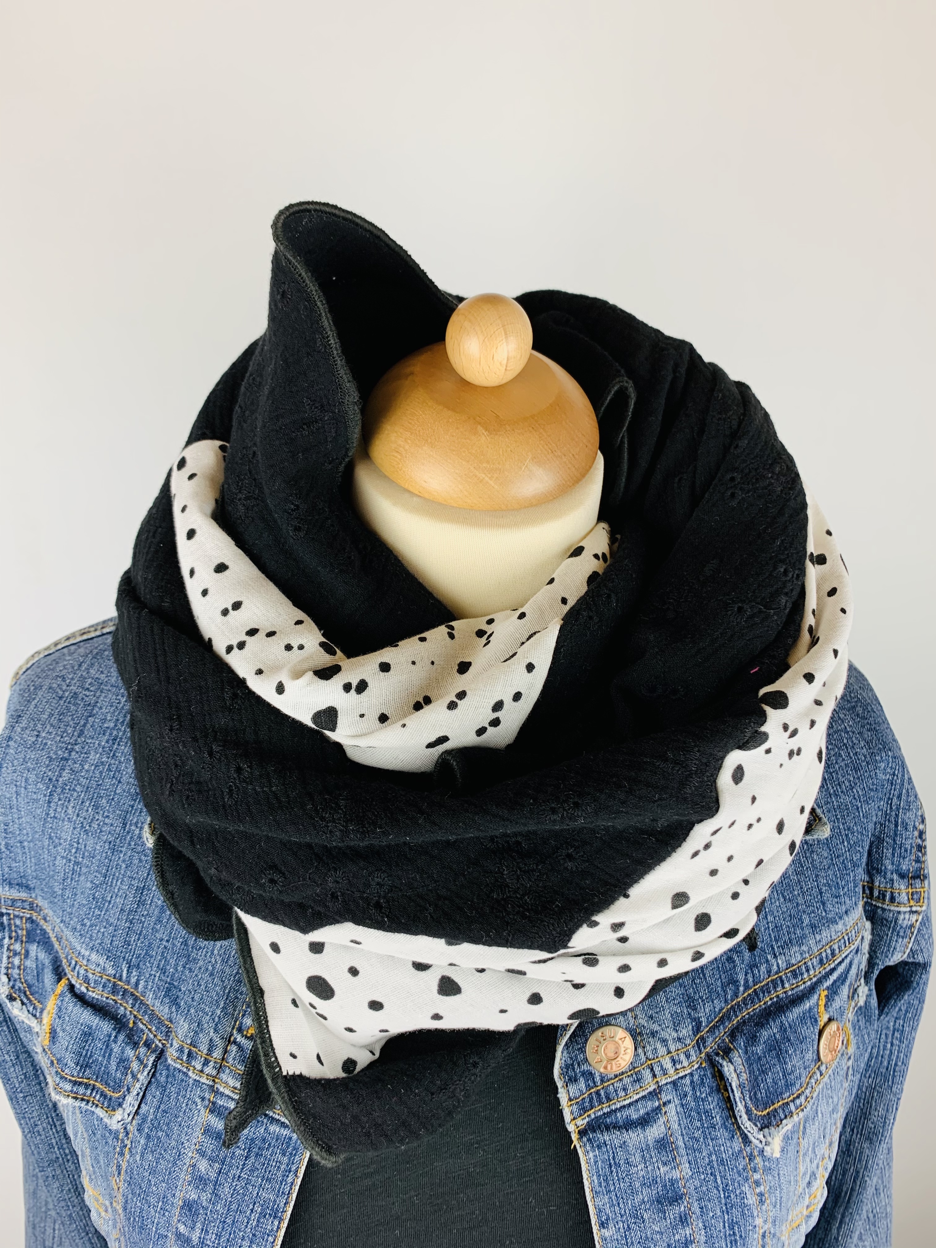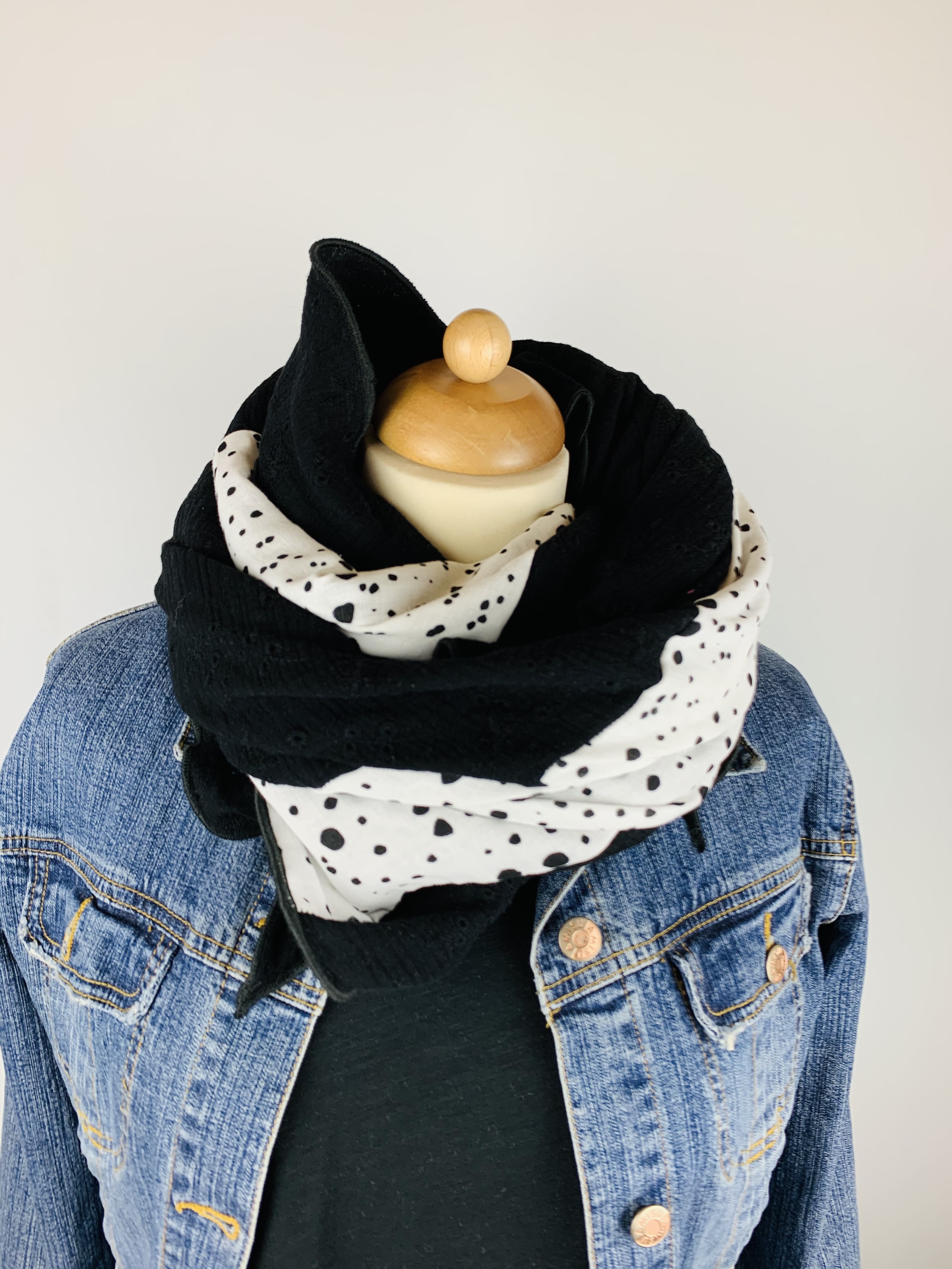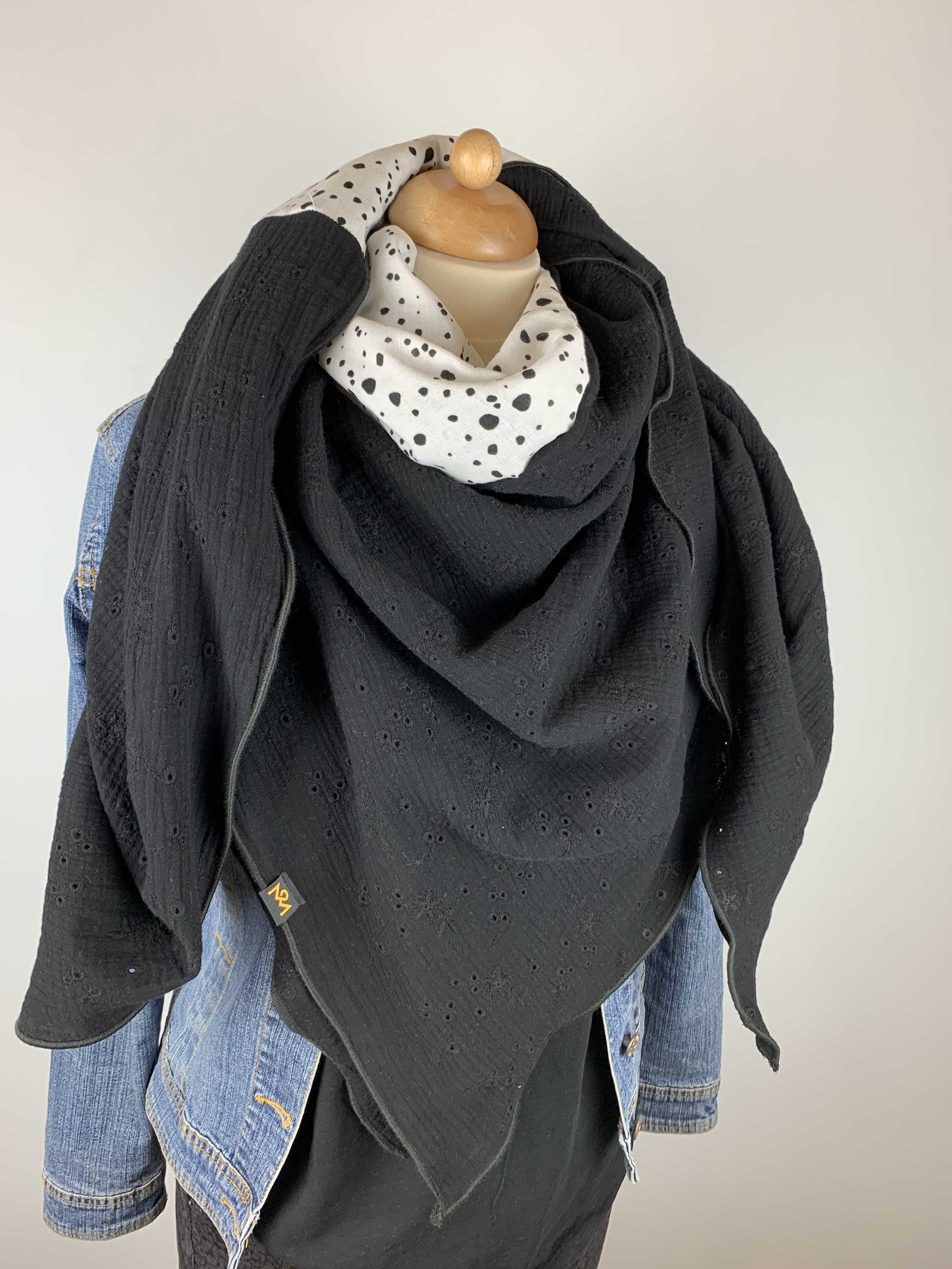 Dieses hochwertige, doppelt gewebte Tuch aus 100% Baumwollmusselin wurde in den Farben "Schwarz mit Blumenstickerei und Weiß mit schwarzen Tropfen" gefertigt.