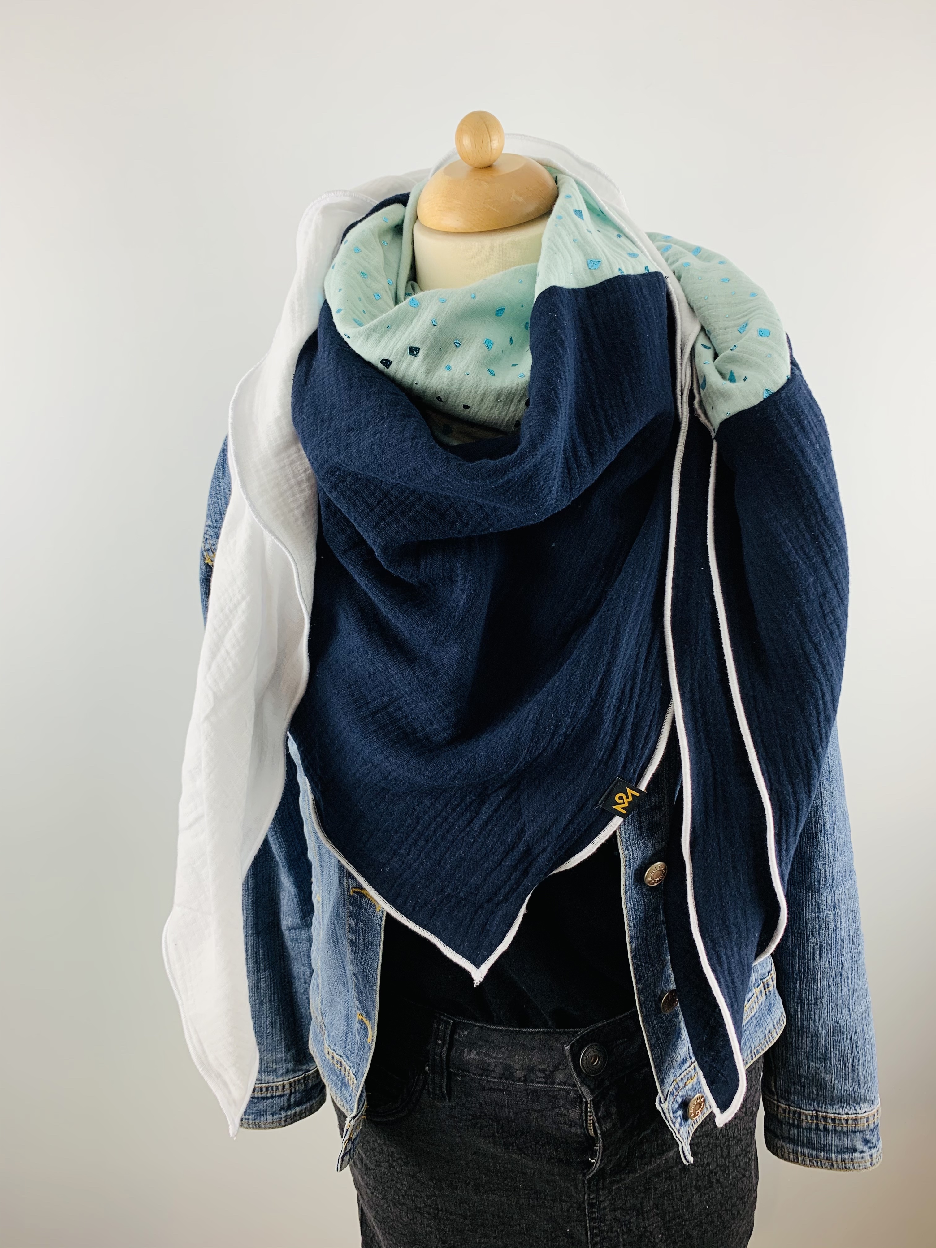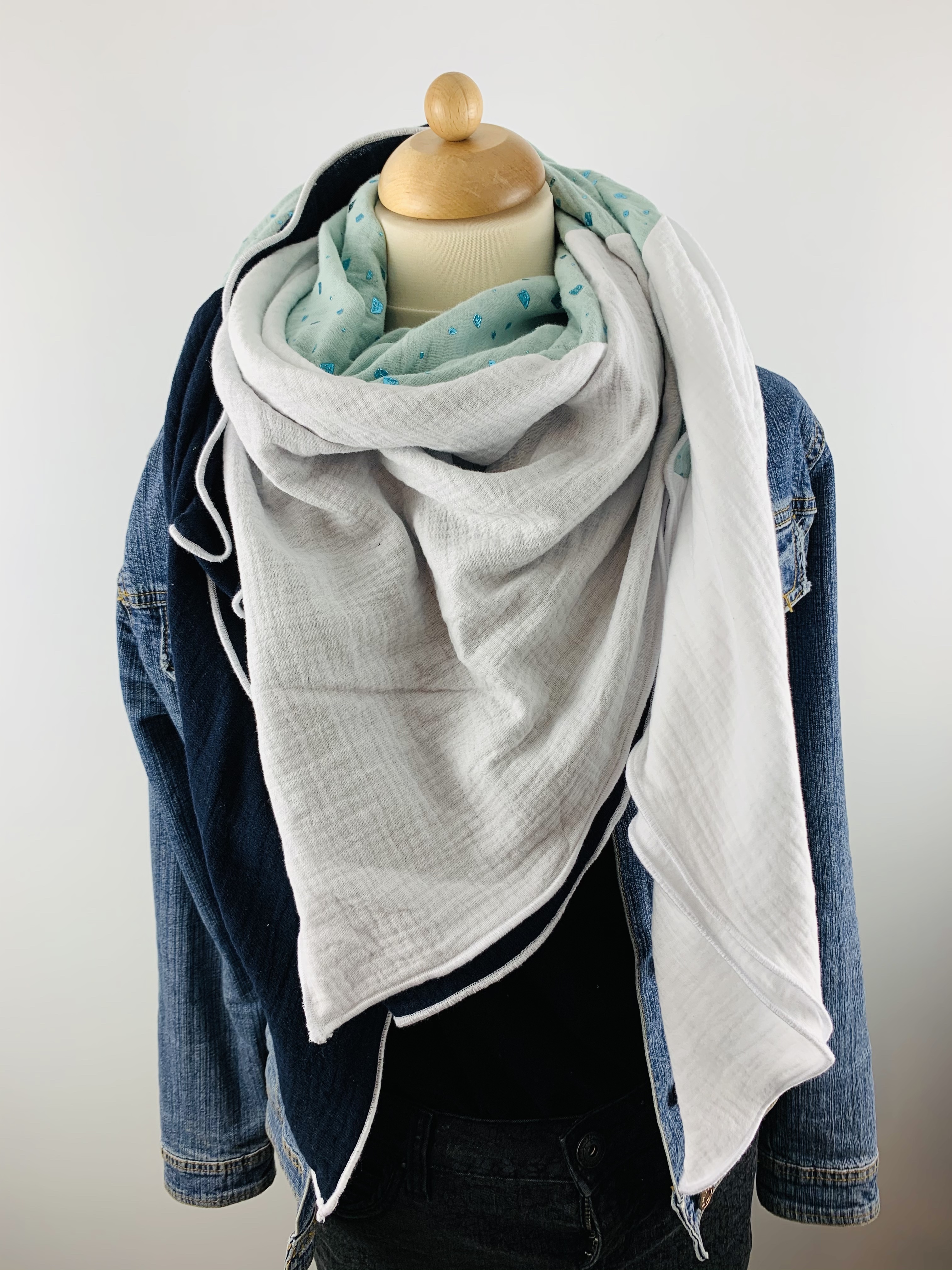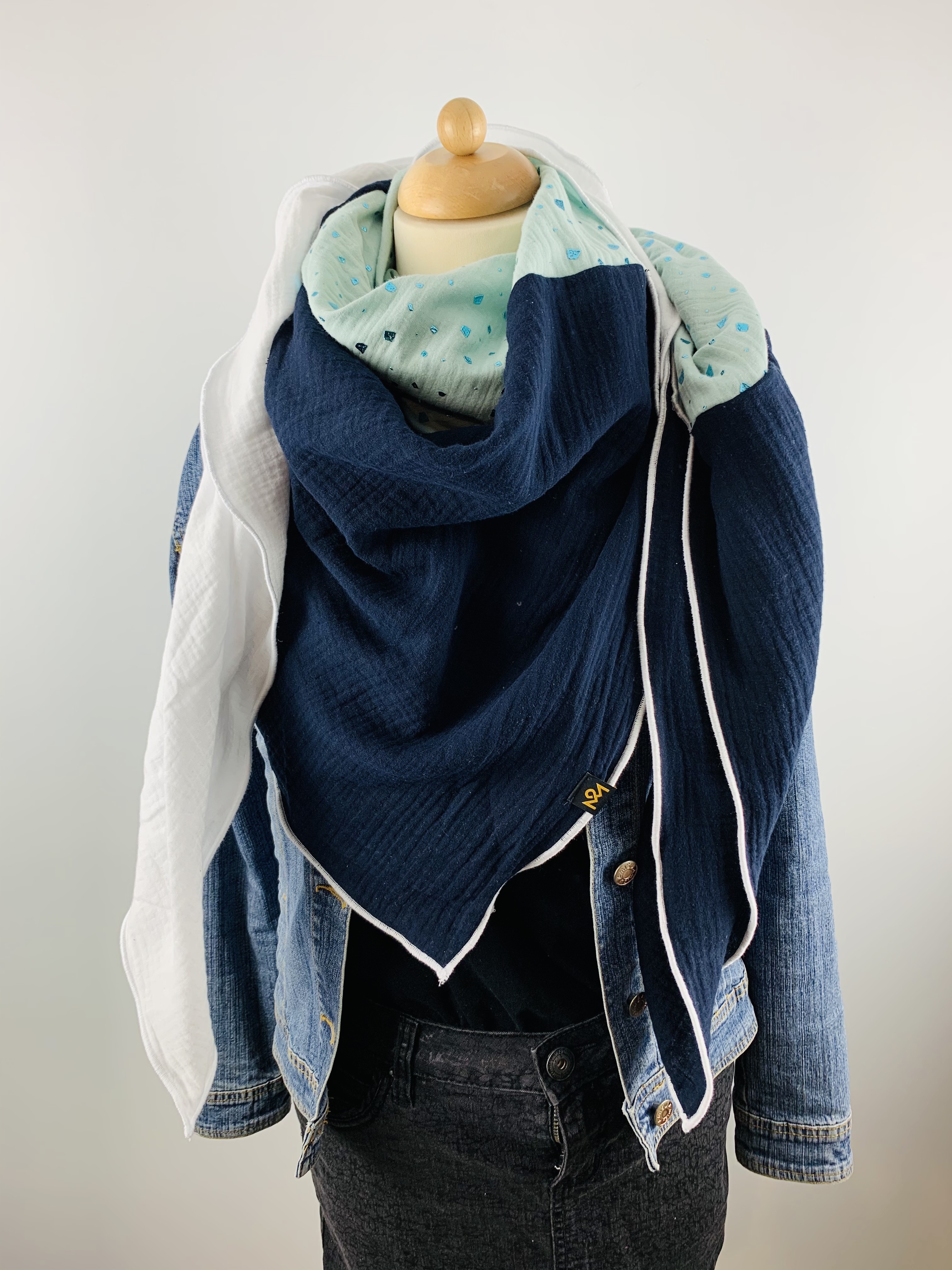 Dieses hochwertige, doppelt gewebte Tuch aus 100% Baumwollmusselin wurde in der Farbe "Weiß, Marineblau und Mint mit funkelnden Glitzerelementen" gefertigt.