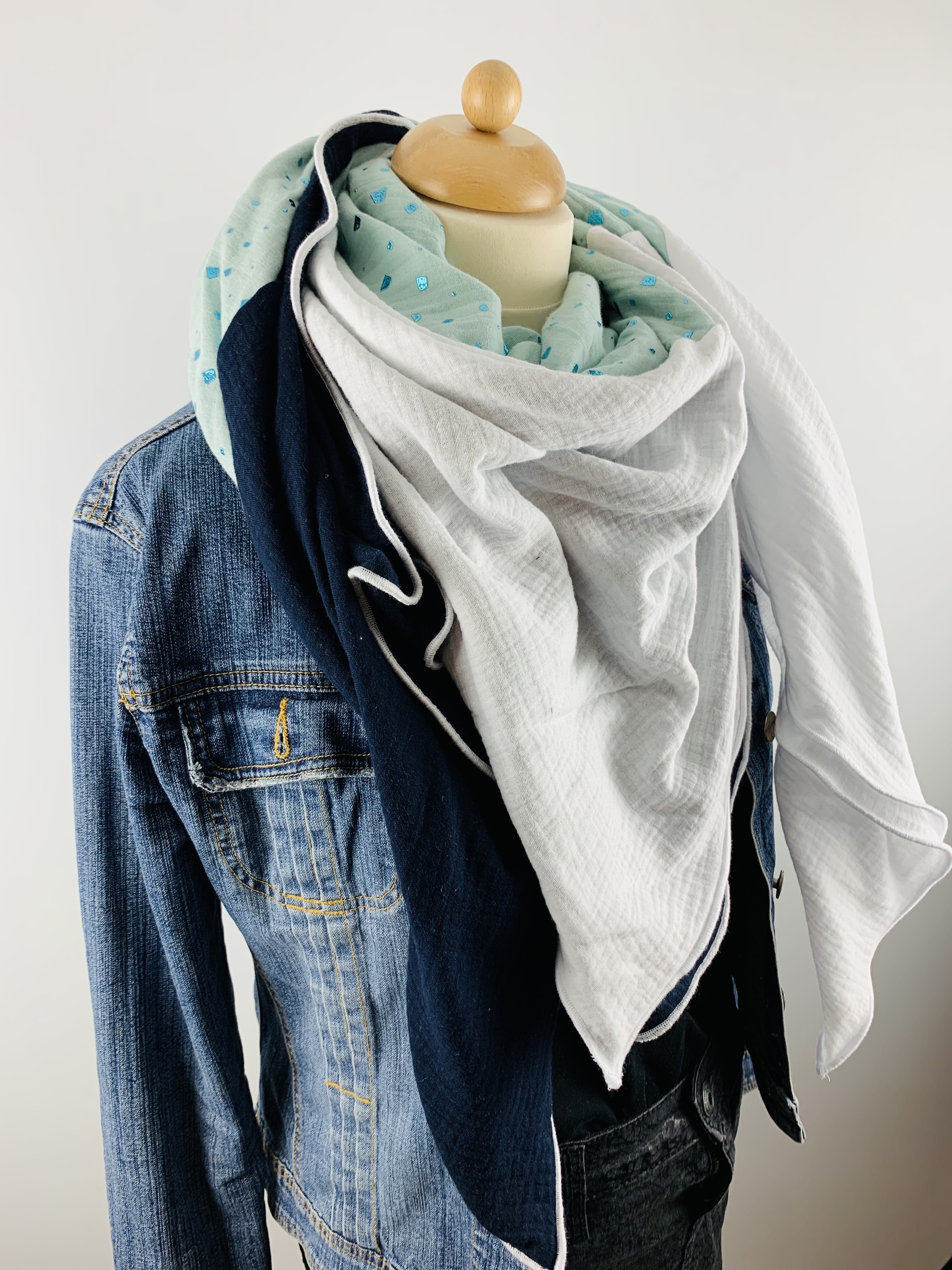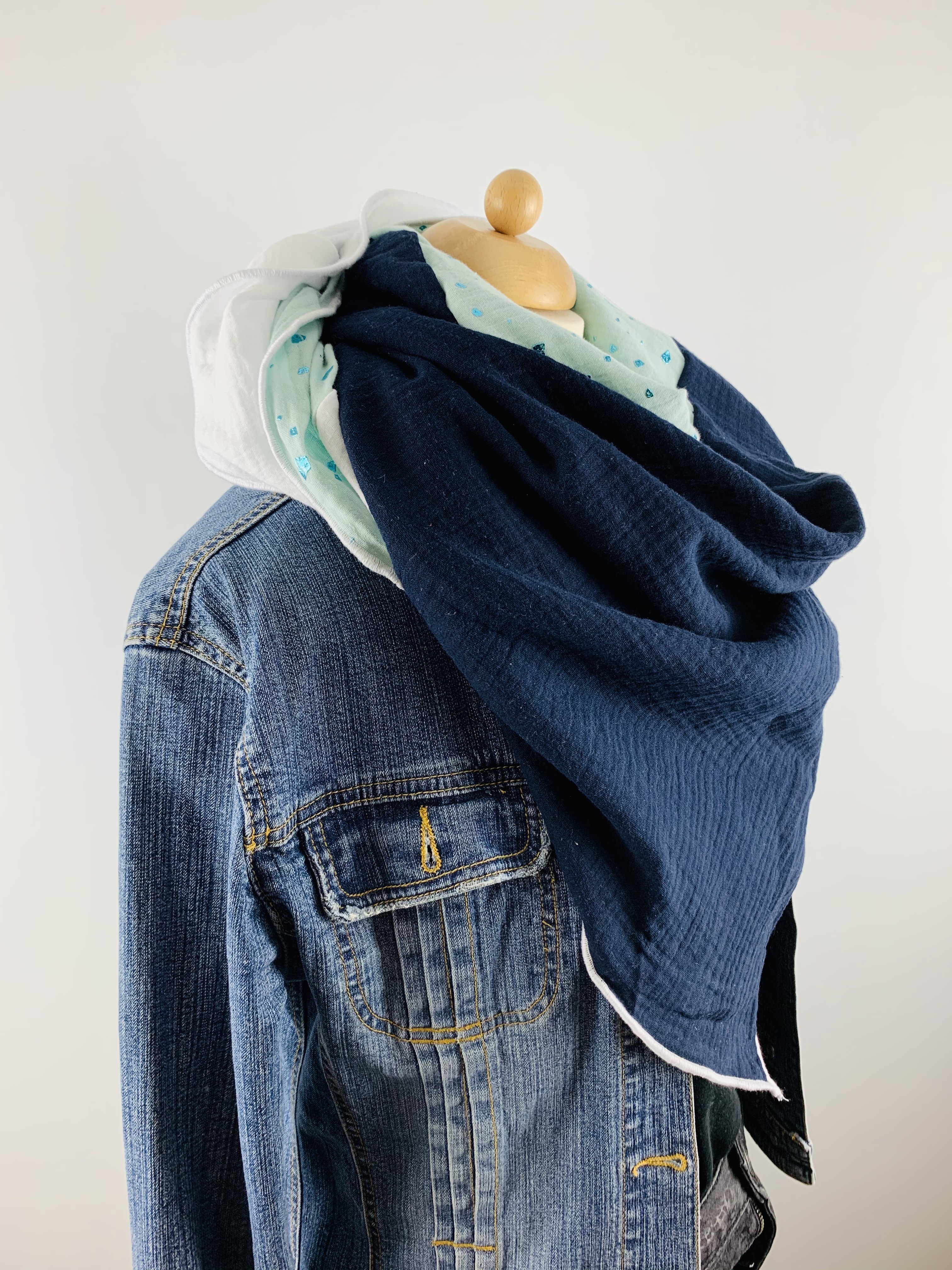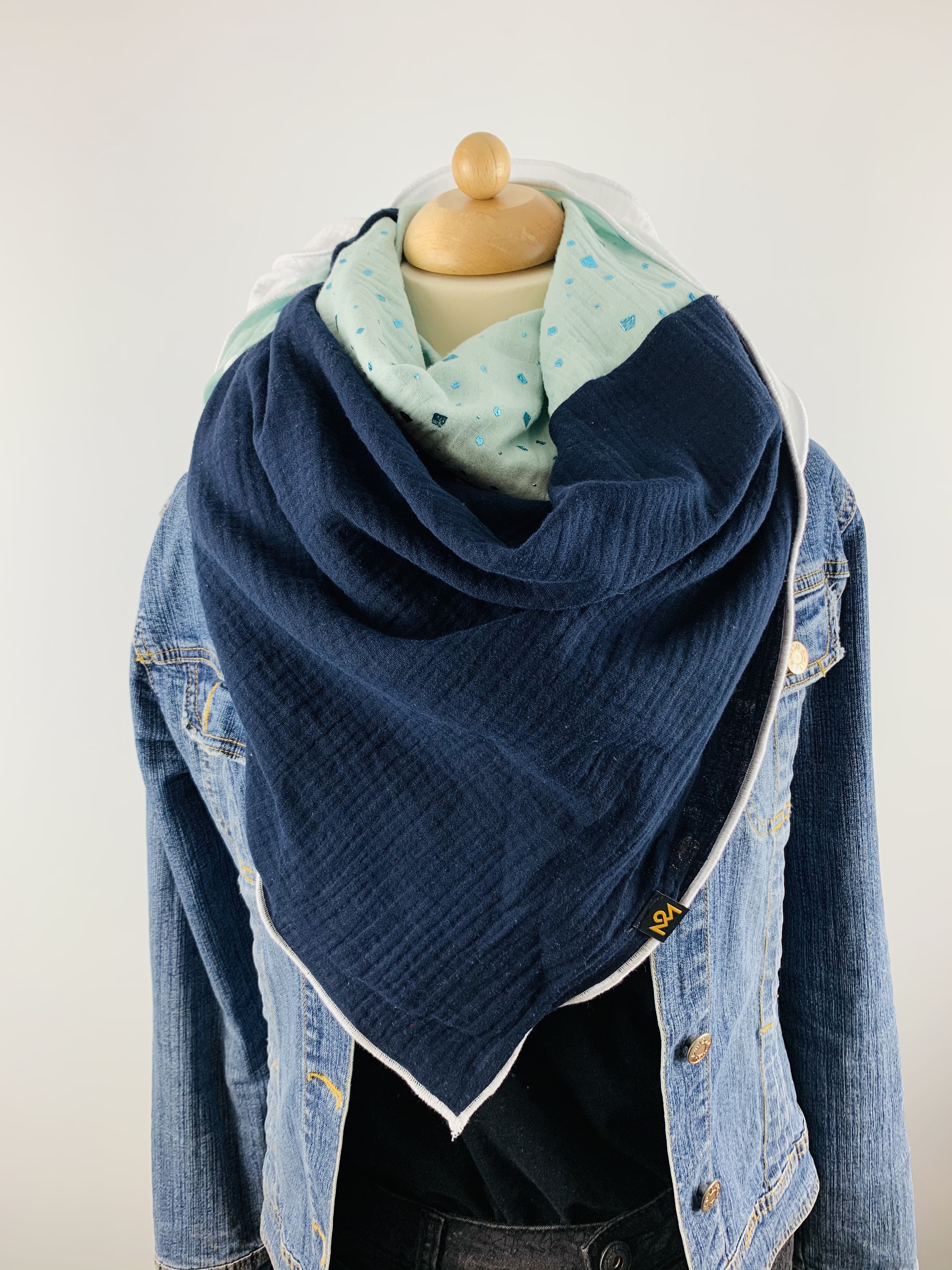Dieses hochwertige, doppelt gewebte Tuch aus 100% Baumwollmusselin wurde in der Farbe "Weiß, Marineblau und Mint mit funkelnden Glitzerelementen" gefertigt.