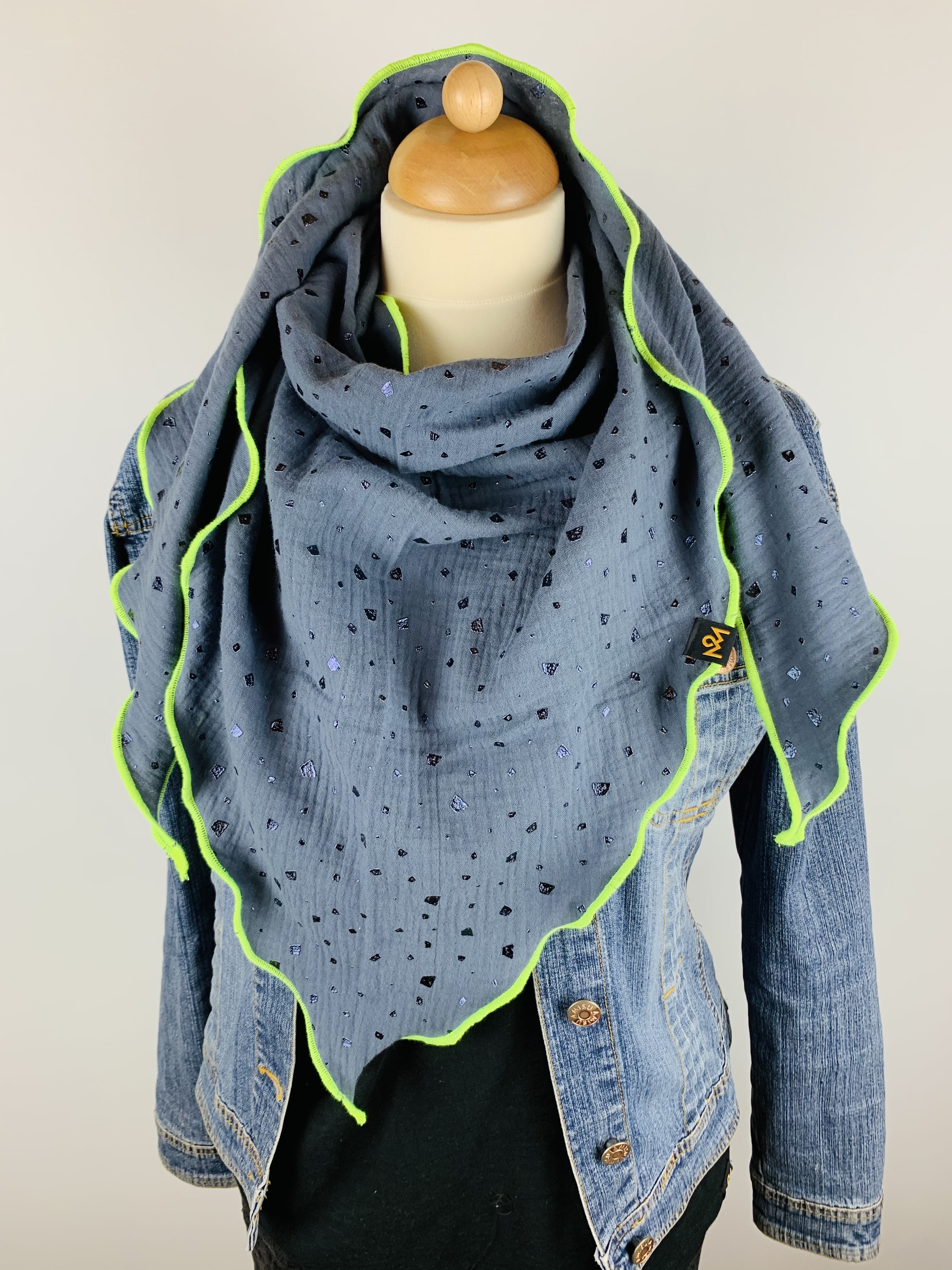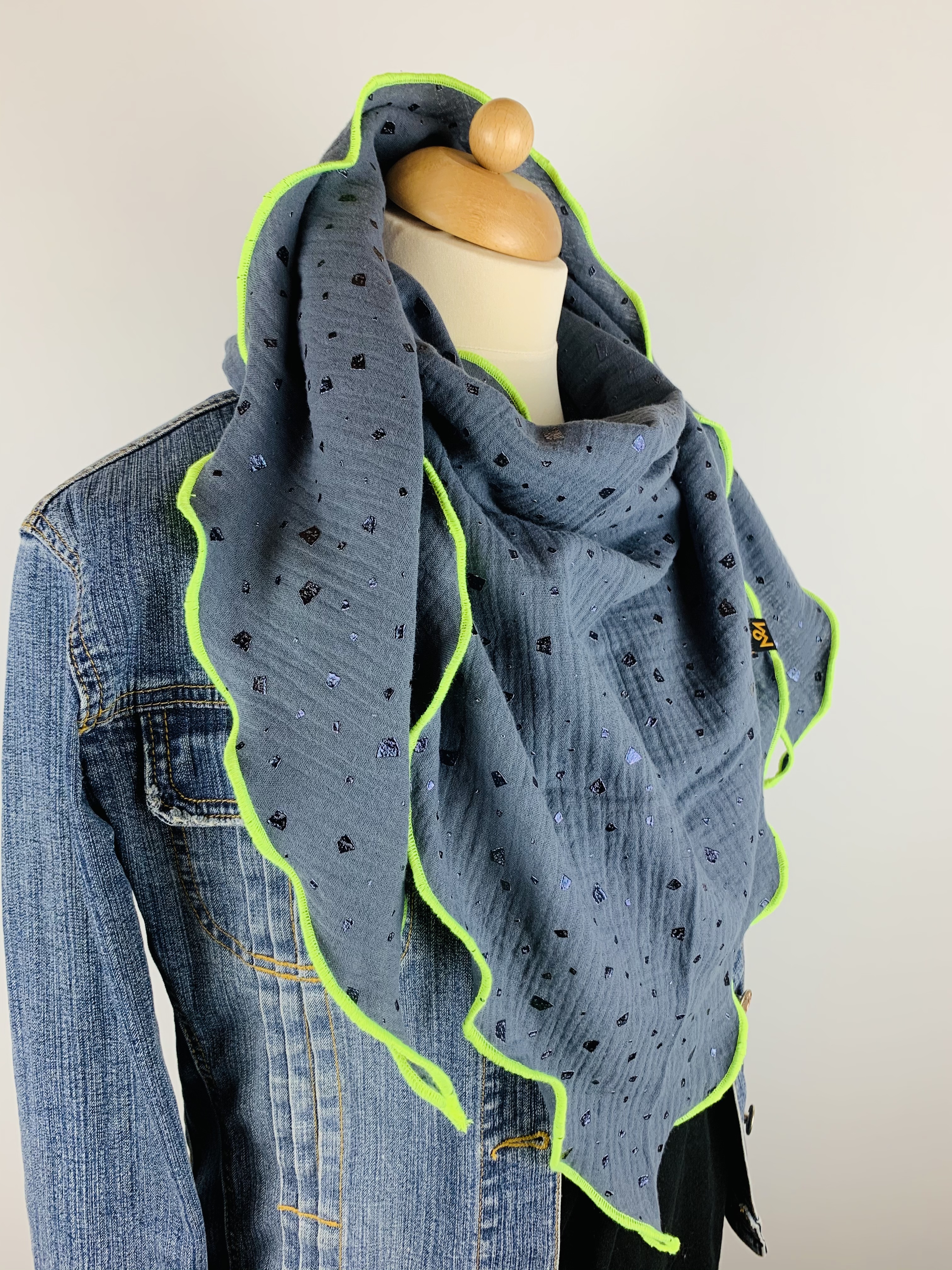 in dunkelblau mit funkelnden Glitzerelementen mit neongelben Wellensaum gefertigt.