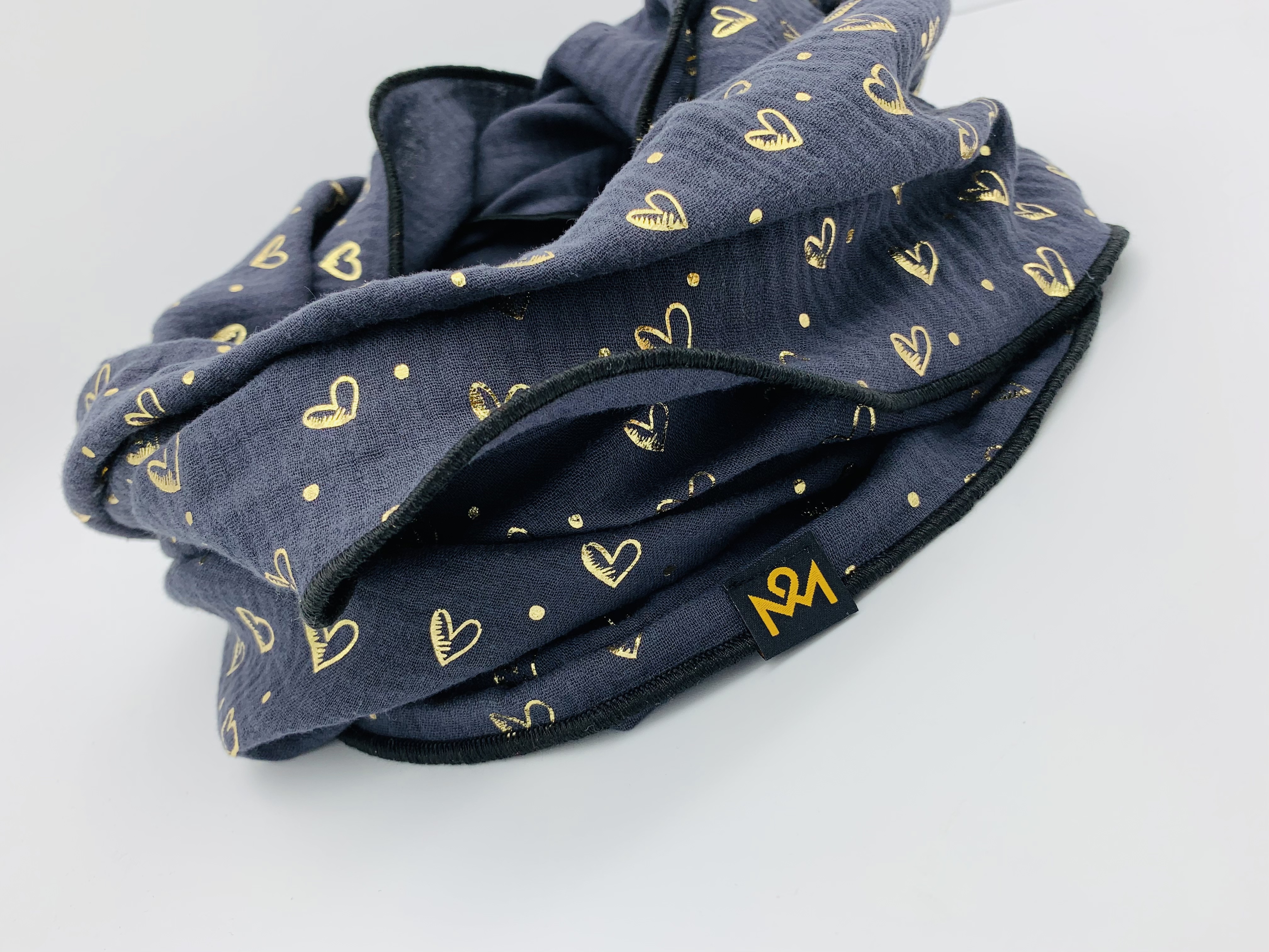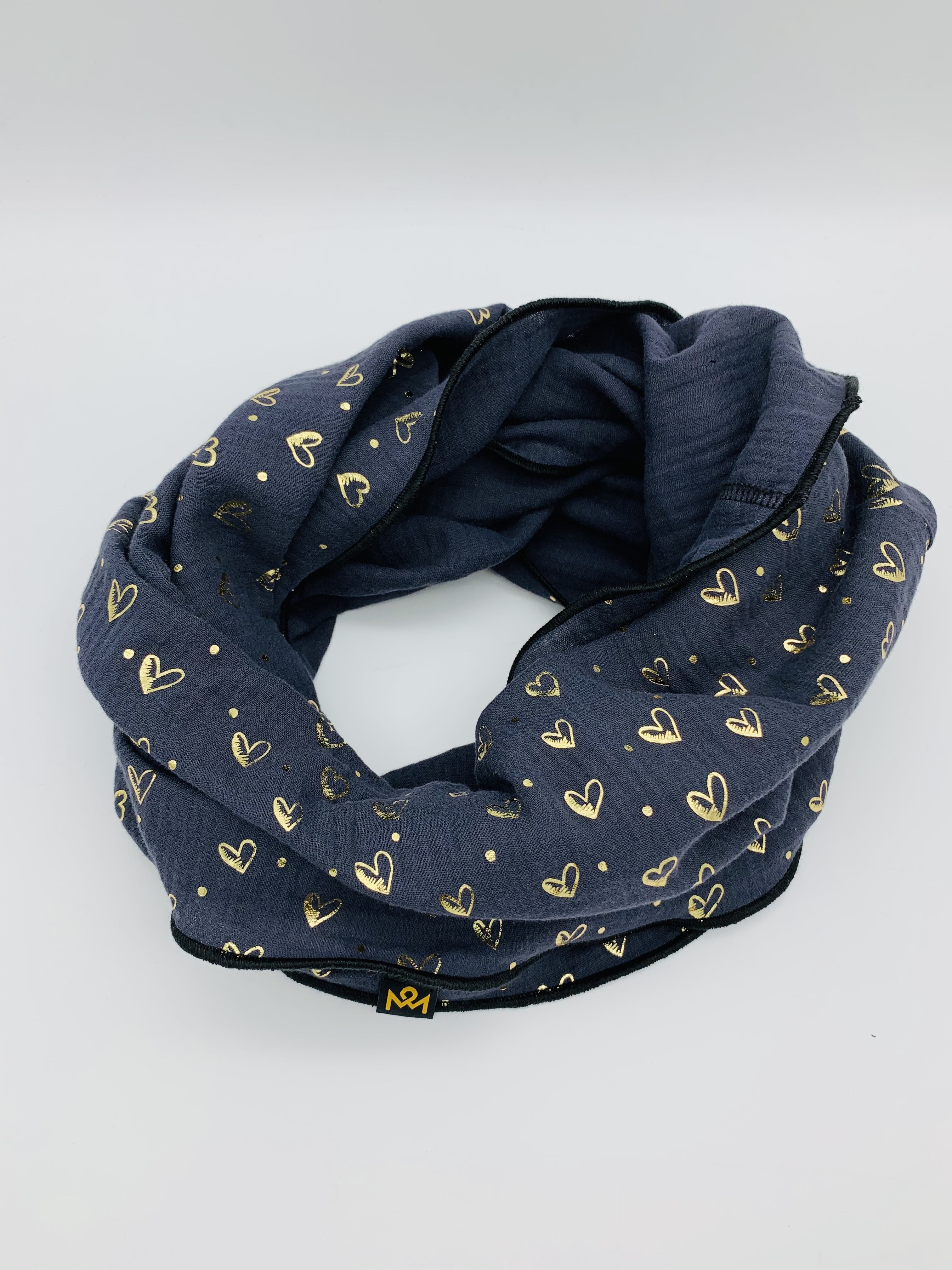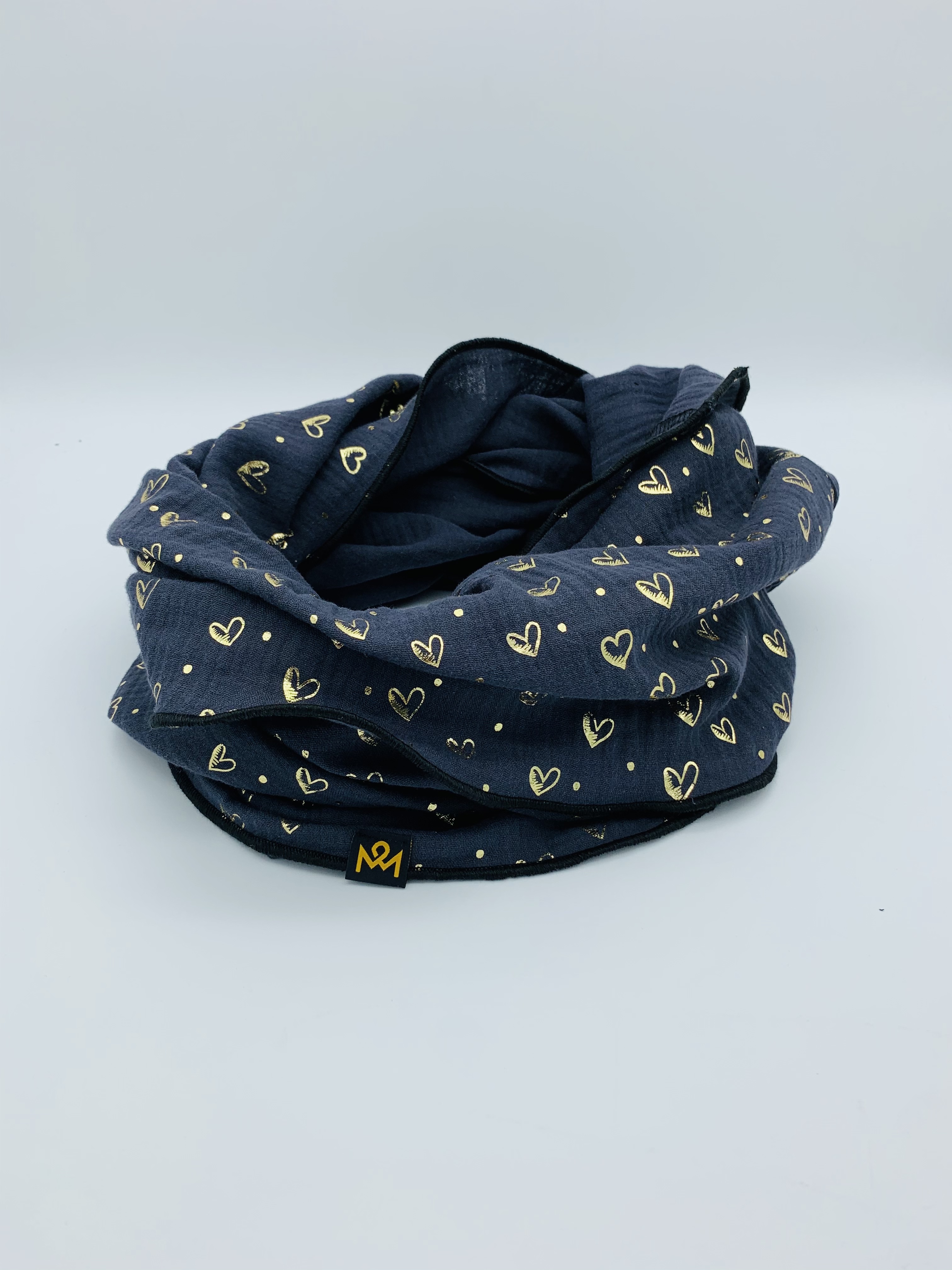Hochwertiger, doppelt gewebter Schlauchschal aus 100 % Baumwollmusselin in der Farbe dunkelblau mit goldenen Herzchen und schwarzem Saum.