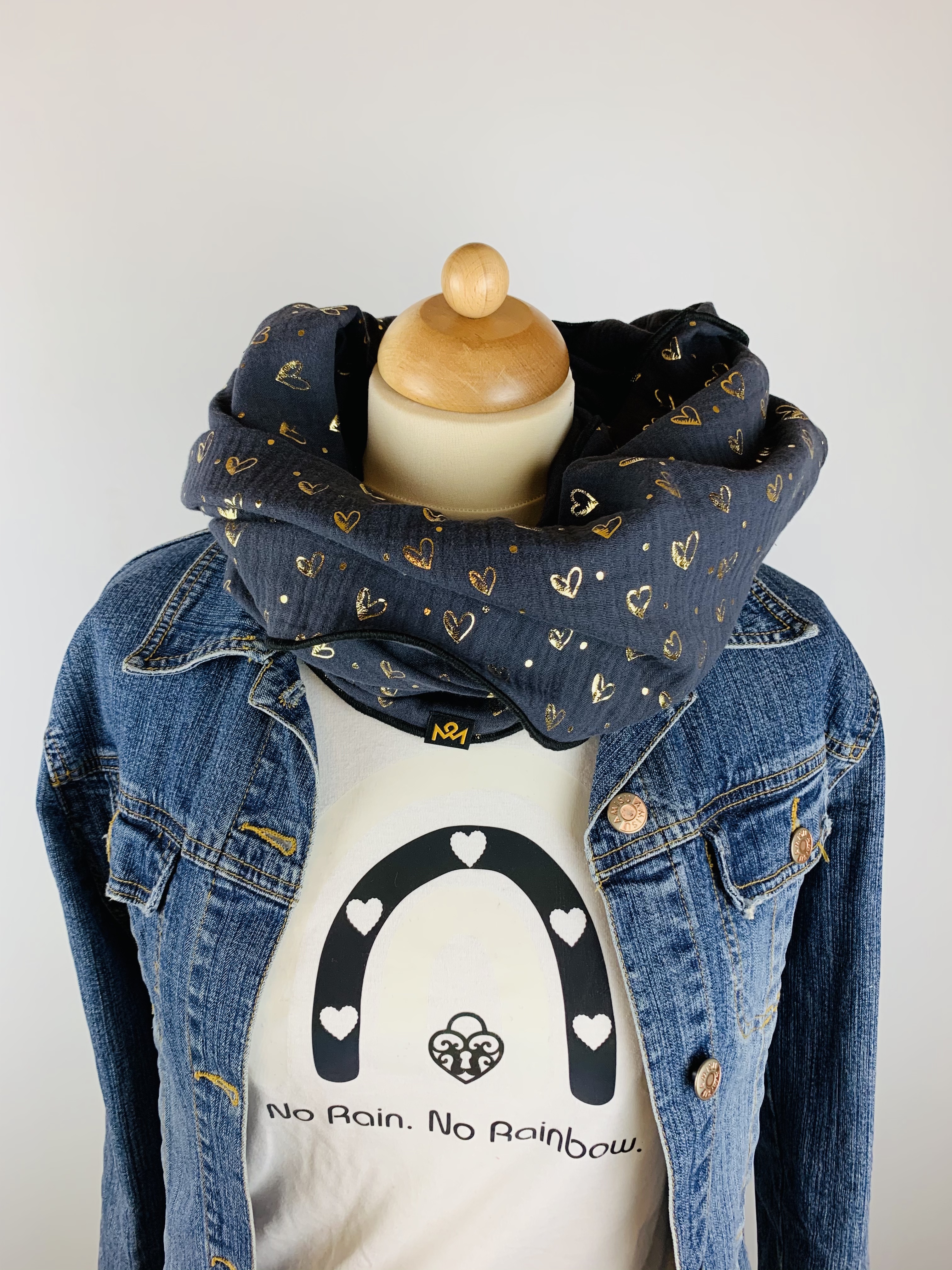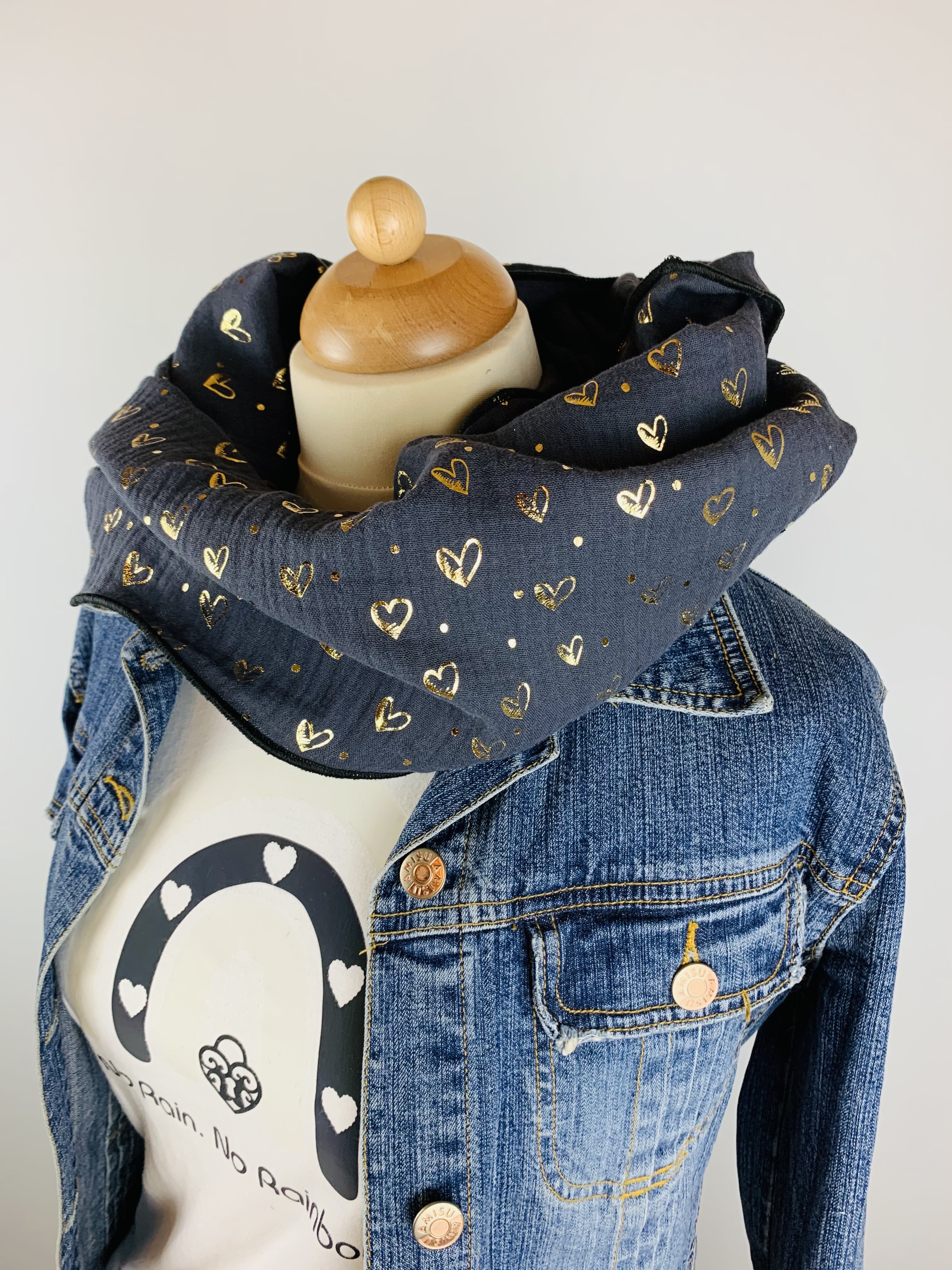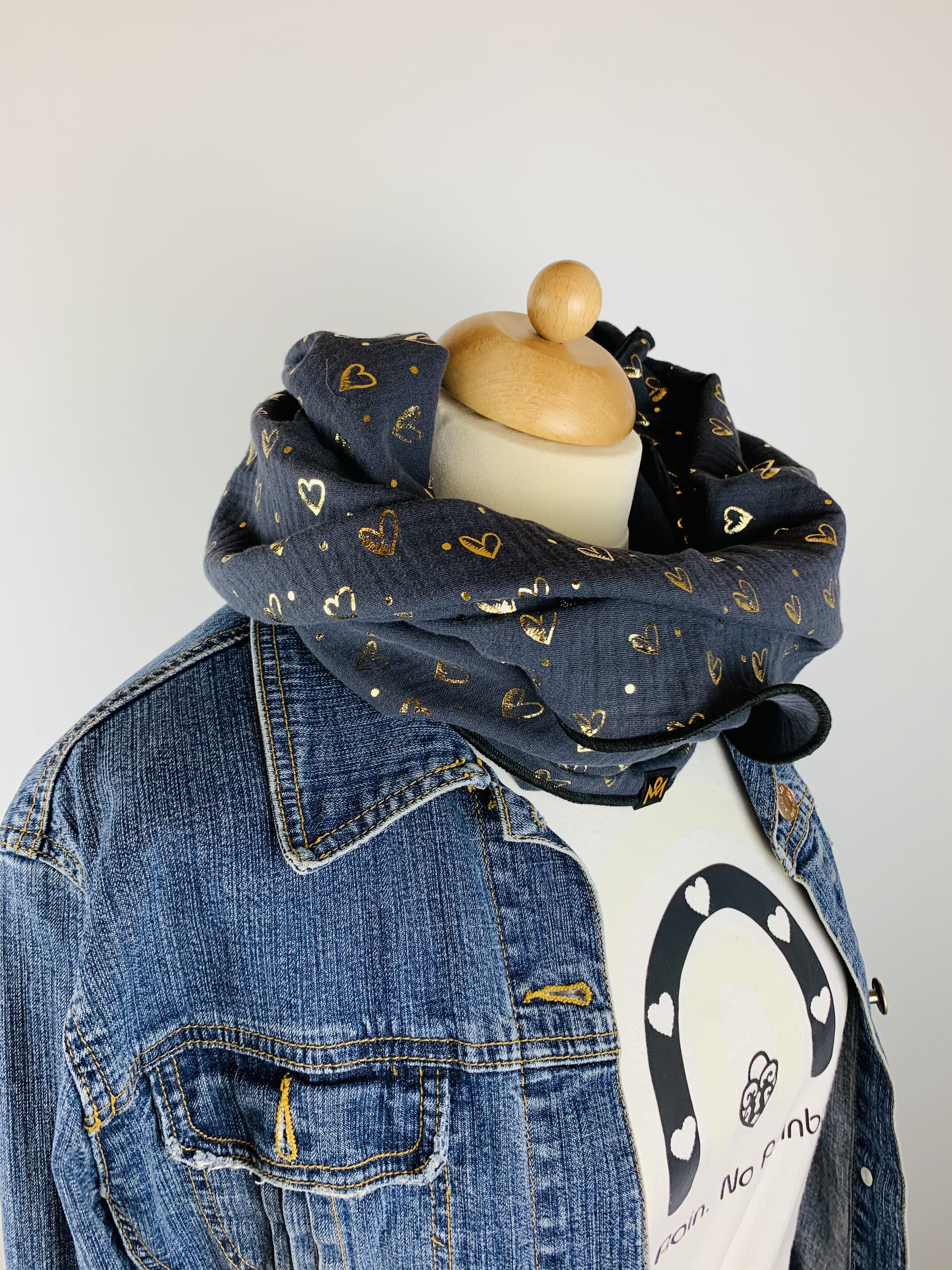 Hochwertiger, doppelt gewebter Schlauchschal aus 100 % Baumwollmusselin in der Farbe dunkelblau mit goldenen Herzchen und schwarzem Saum.