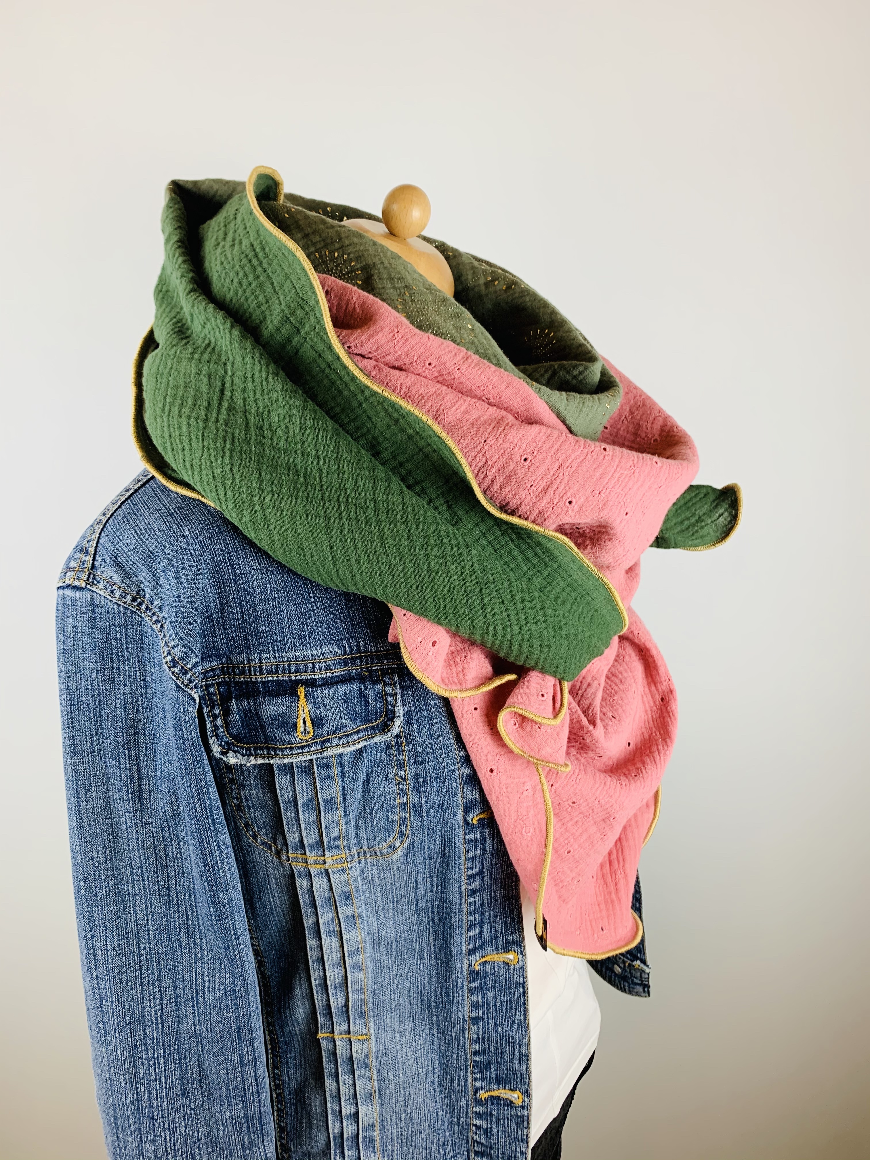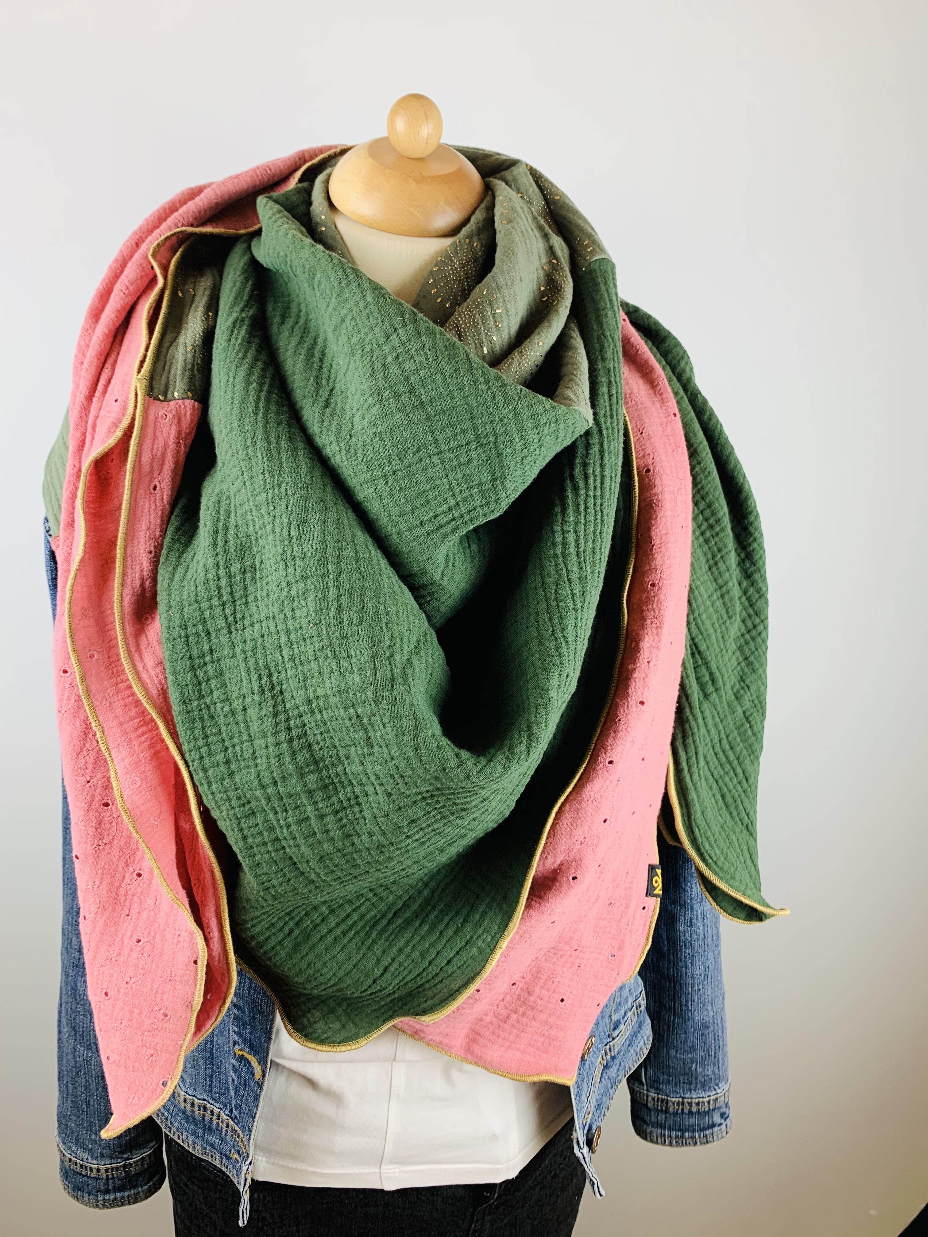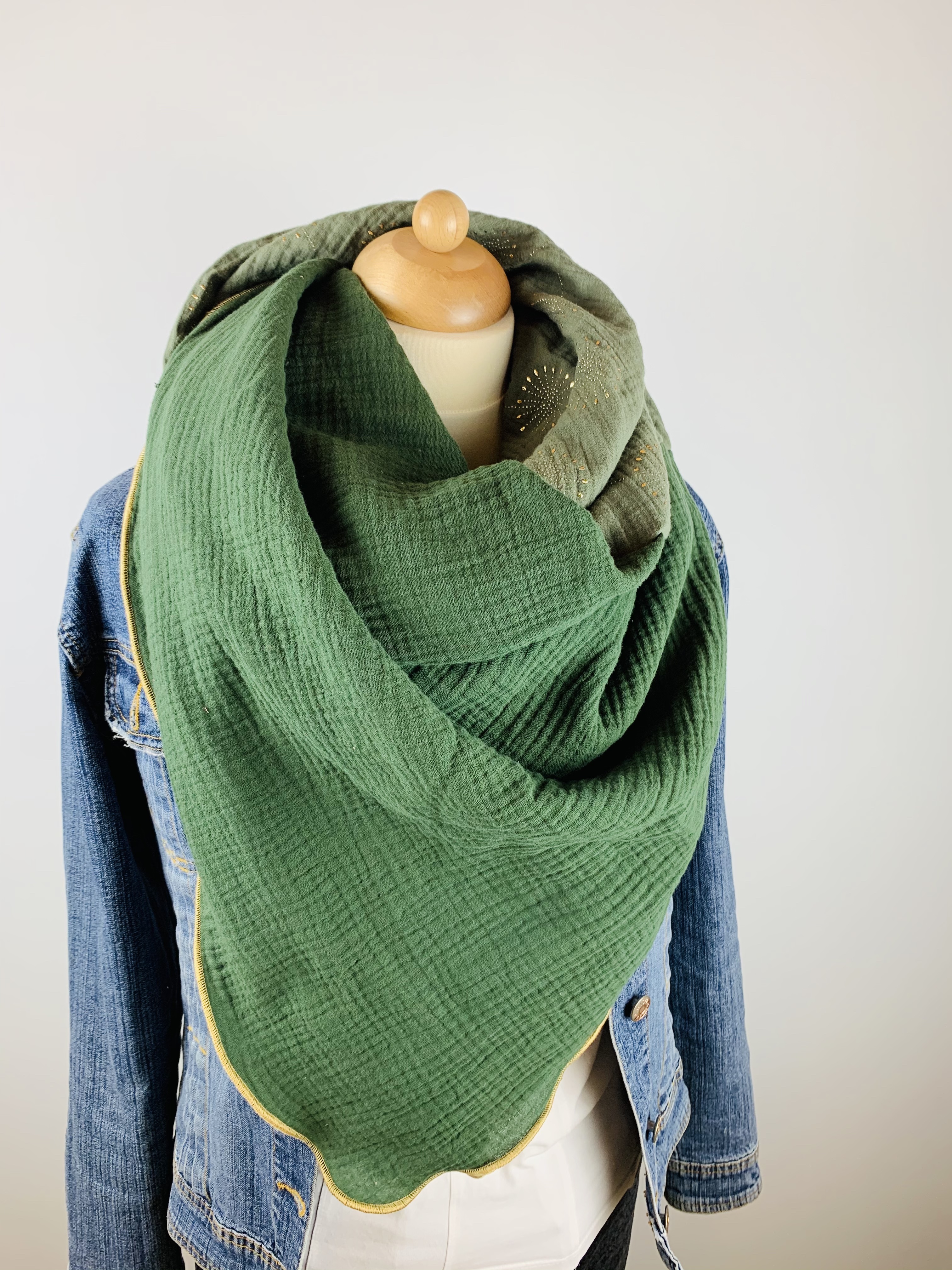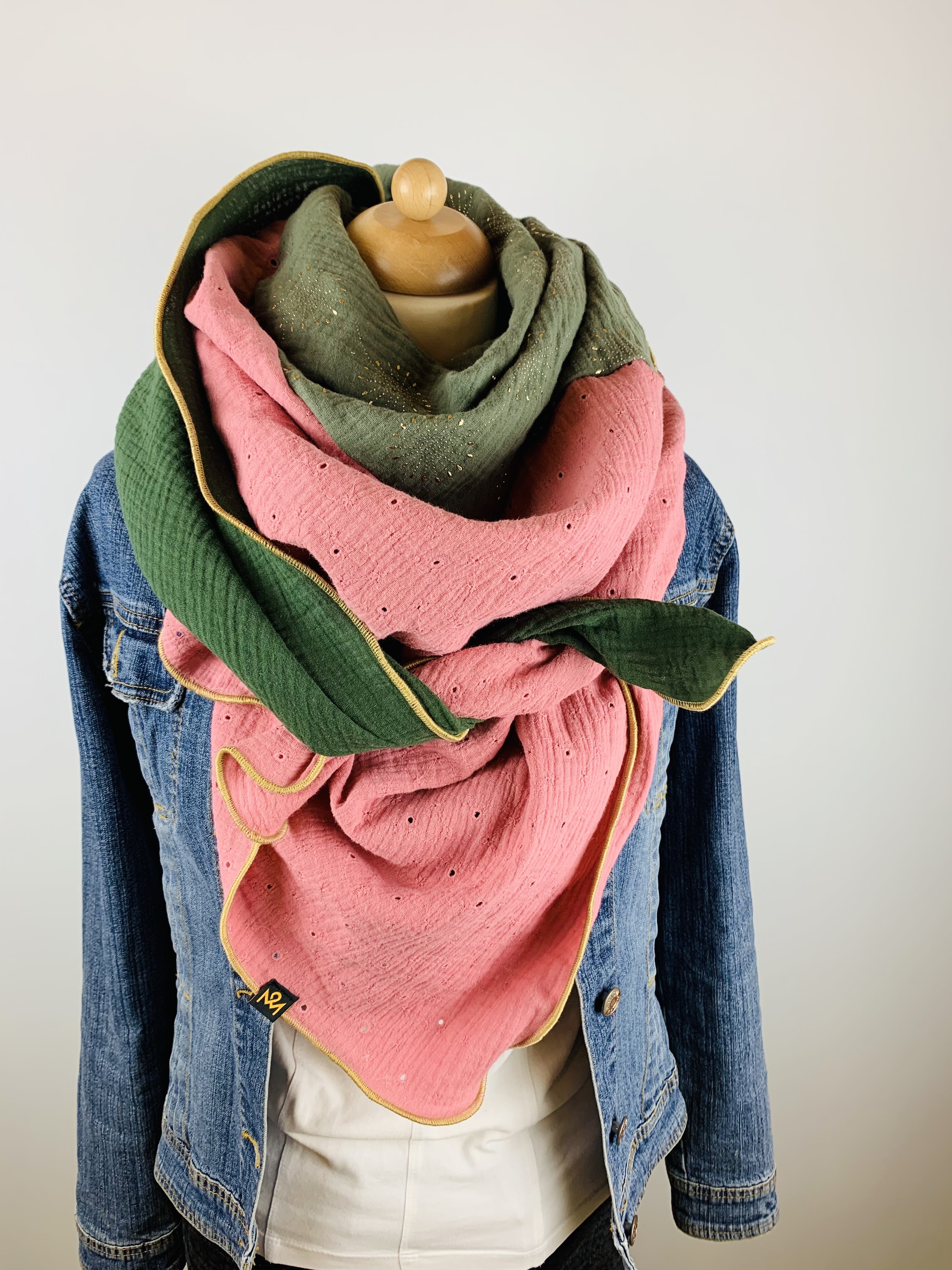 Dieser hochwertige, doppelt gewebte Schal aus 100 % Baumwollmusselin wurde in dunkelgrün, khai mit goldenen Pusteblumen und altrosa mit Lochstickerei gefertigt.