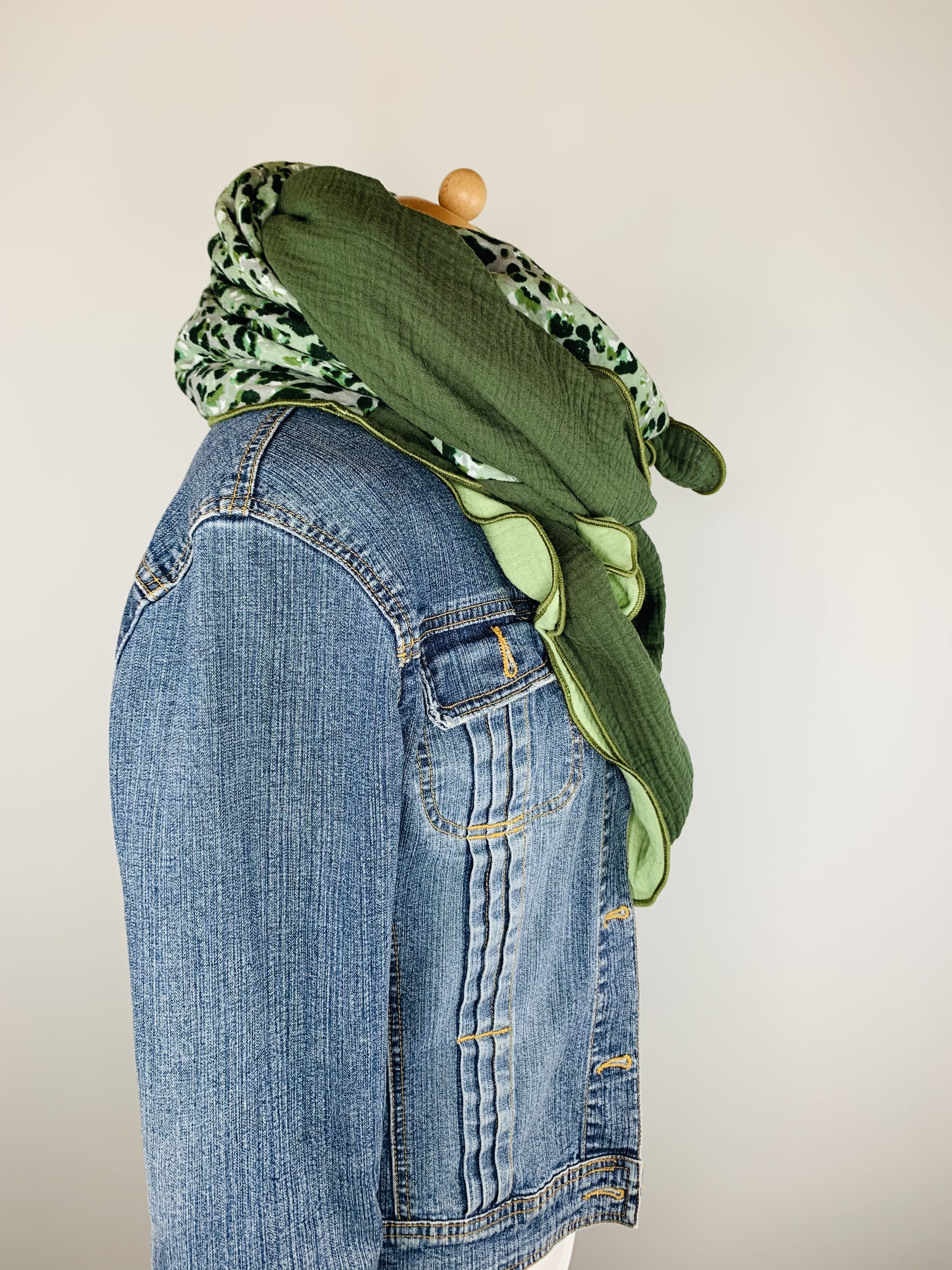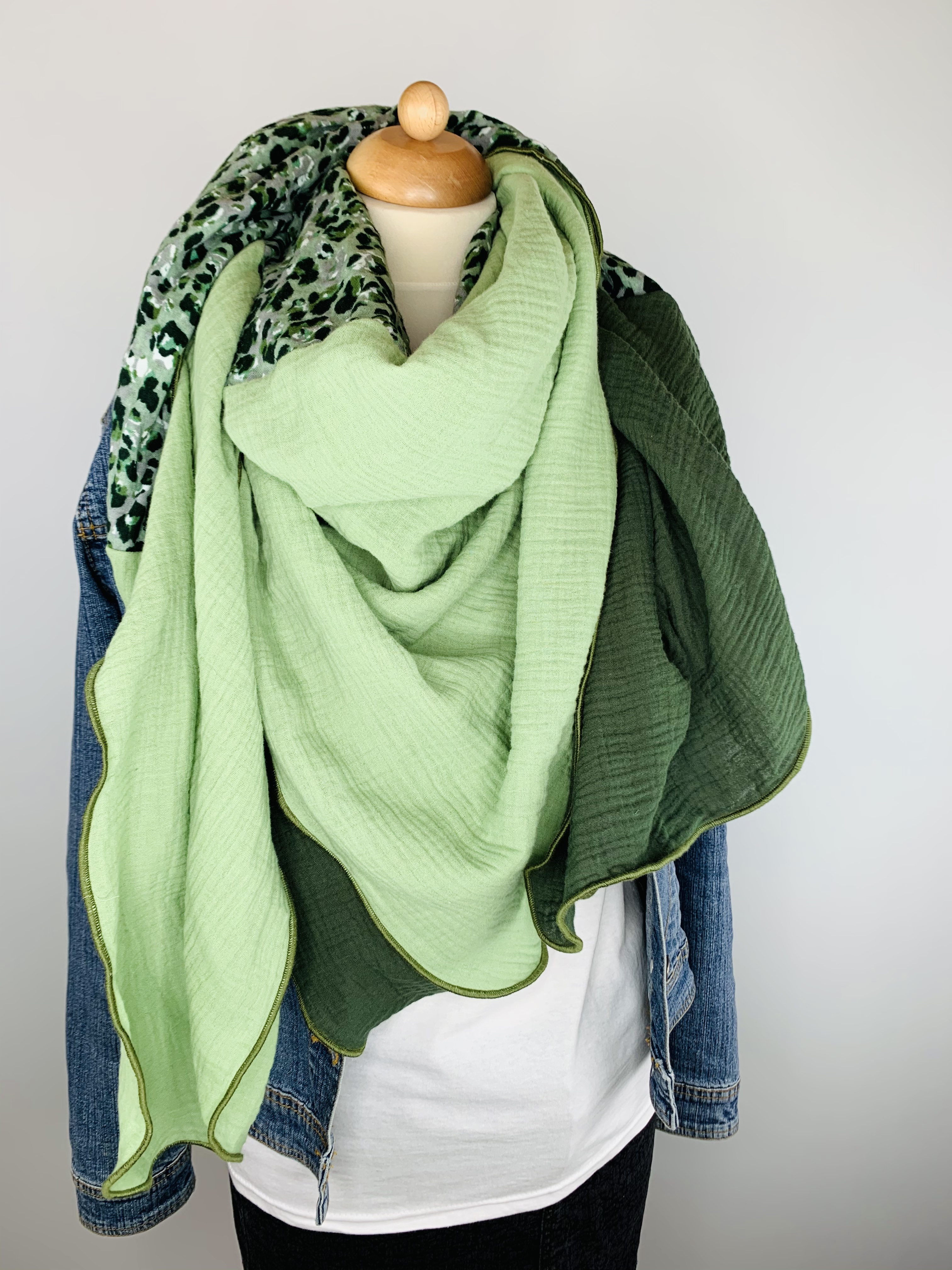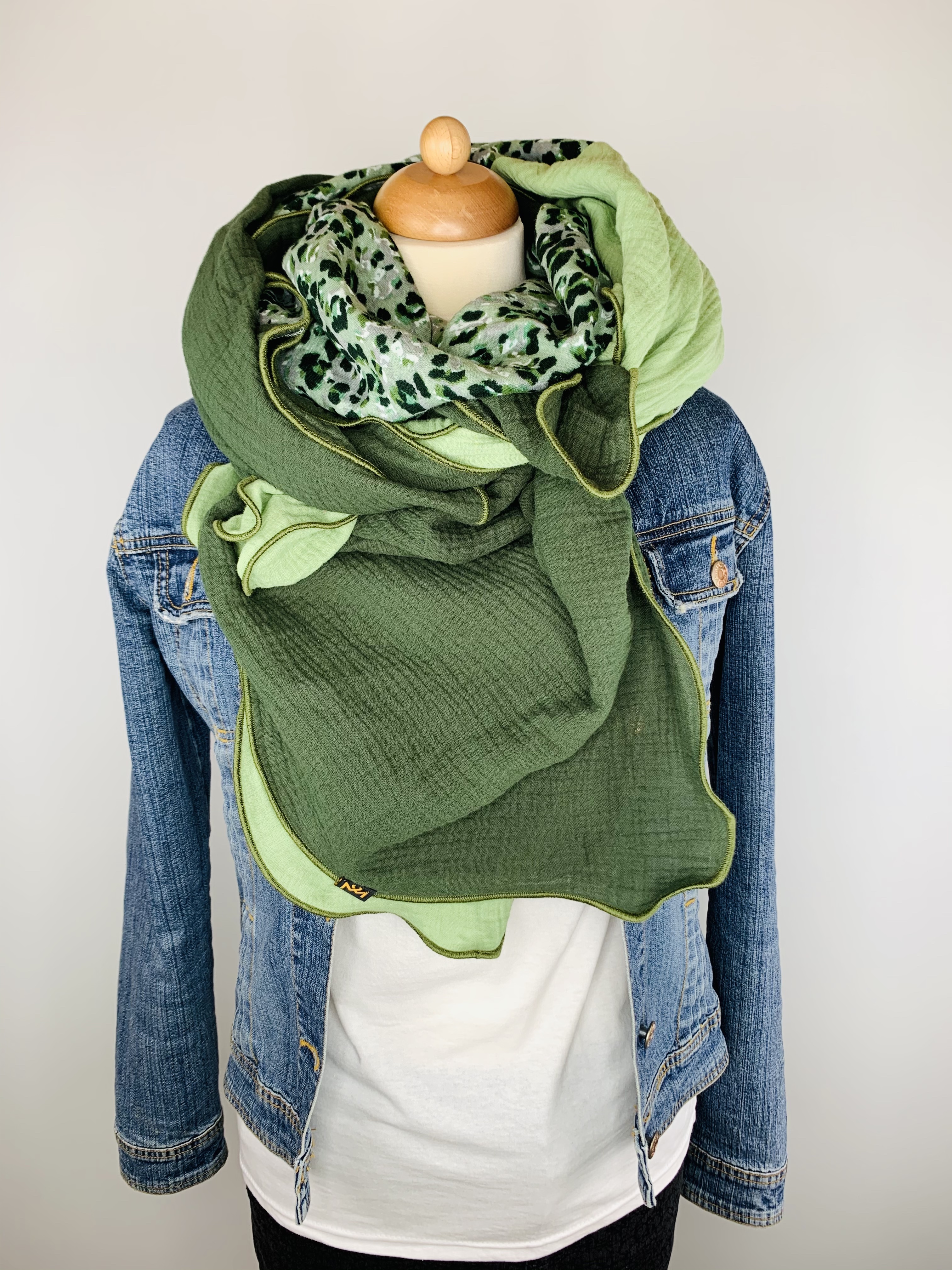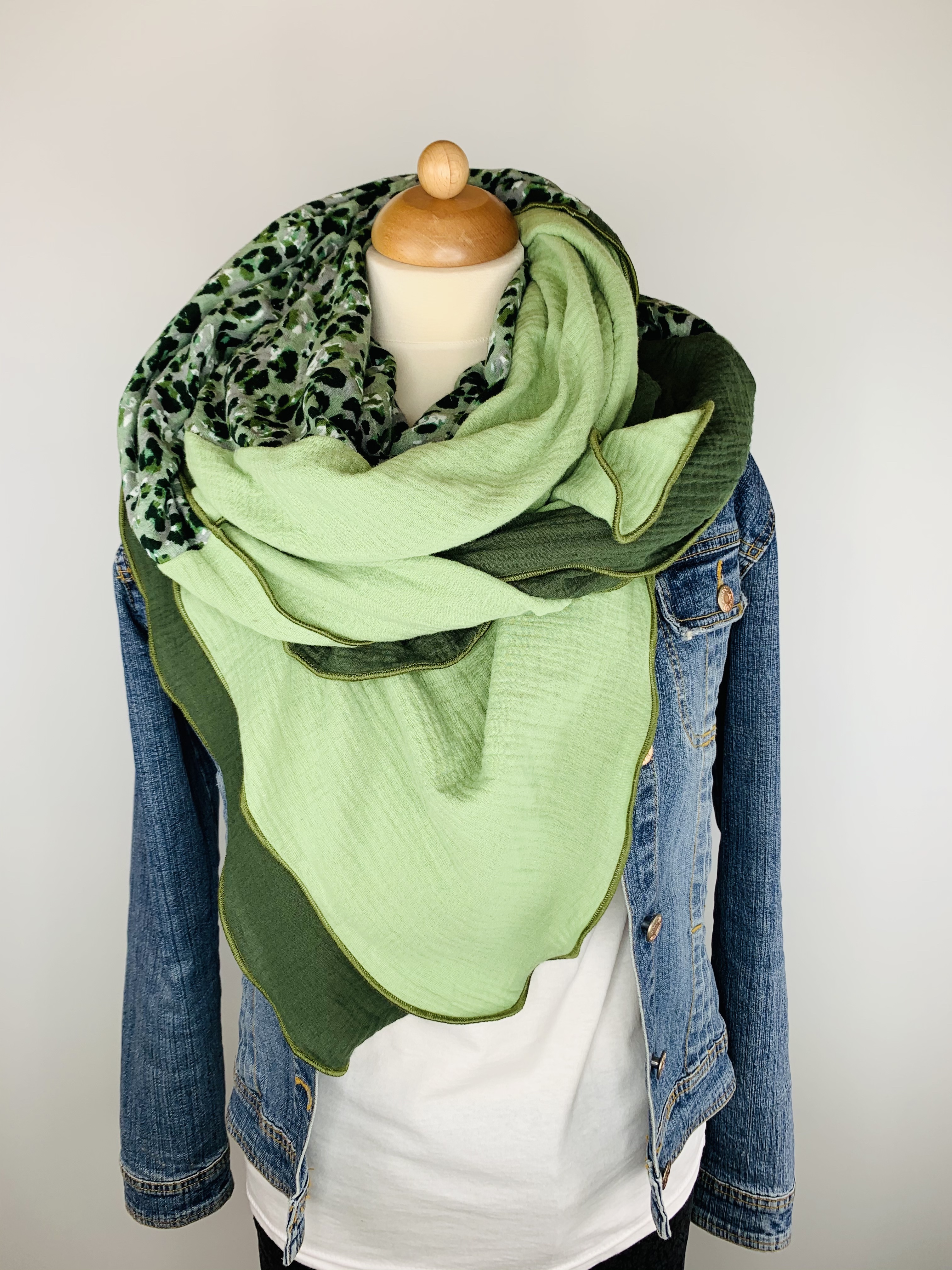 Dieser hochwertige, doppelt gewebte Schal aus 100 % Baumwollmusselin wurde in dunkelgrün, hellgrün und grünem Leo Muster gefertigt.