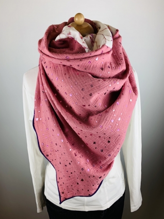 Dieser hochwertige, doppelt gewebte Schal aus 100 % Baumwollmusselin wurde in altrosa mit glitzer Flakes, flieder und mit einer weiß rosa Blumenwiese gefertigt.