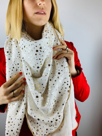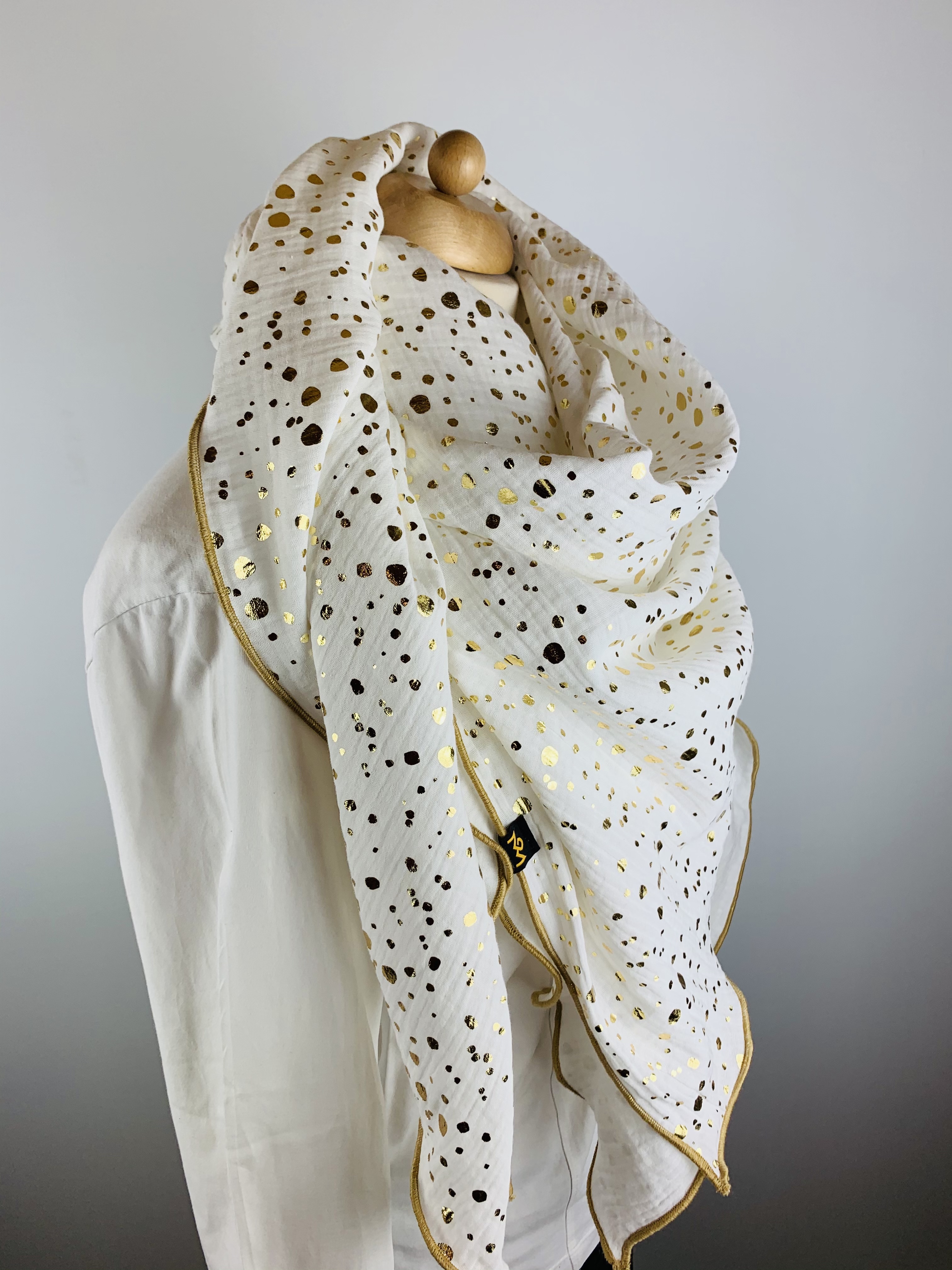 - 100% weiche Musselinbaumwolle in gebrochenem weiß mit goldenen Punkten