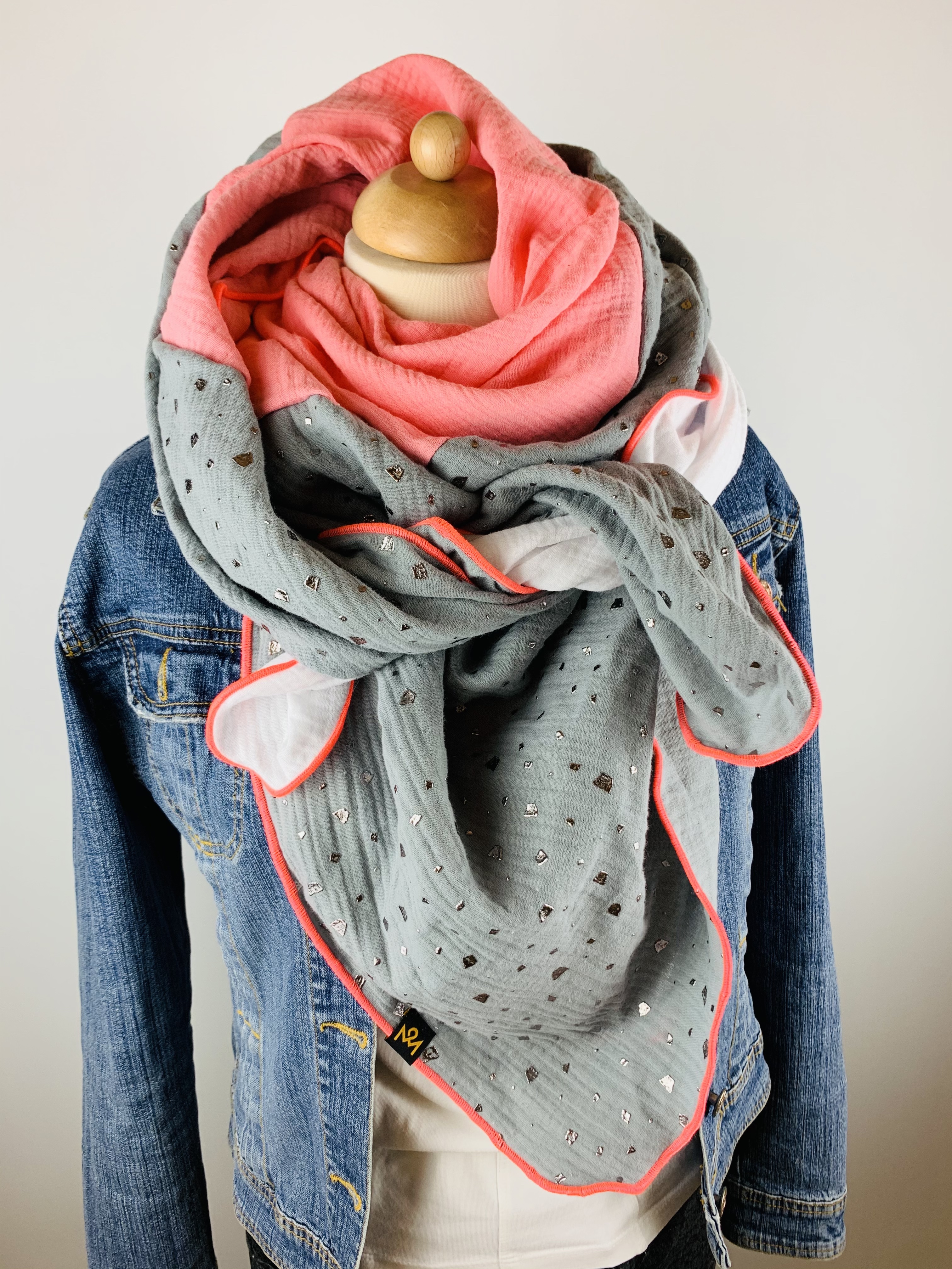 Dieser hochwertige, doppelt gewebte Schal aus 100 % Baumwollmusselin wurde in grau mit Glitzer Flakes, apricot und weiß gefertigt.