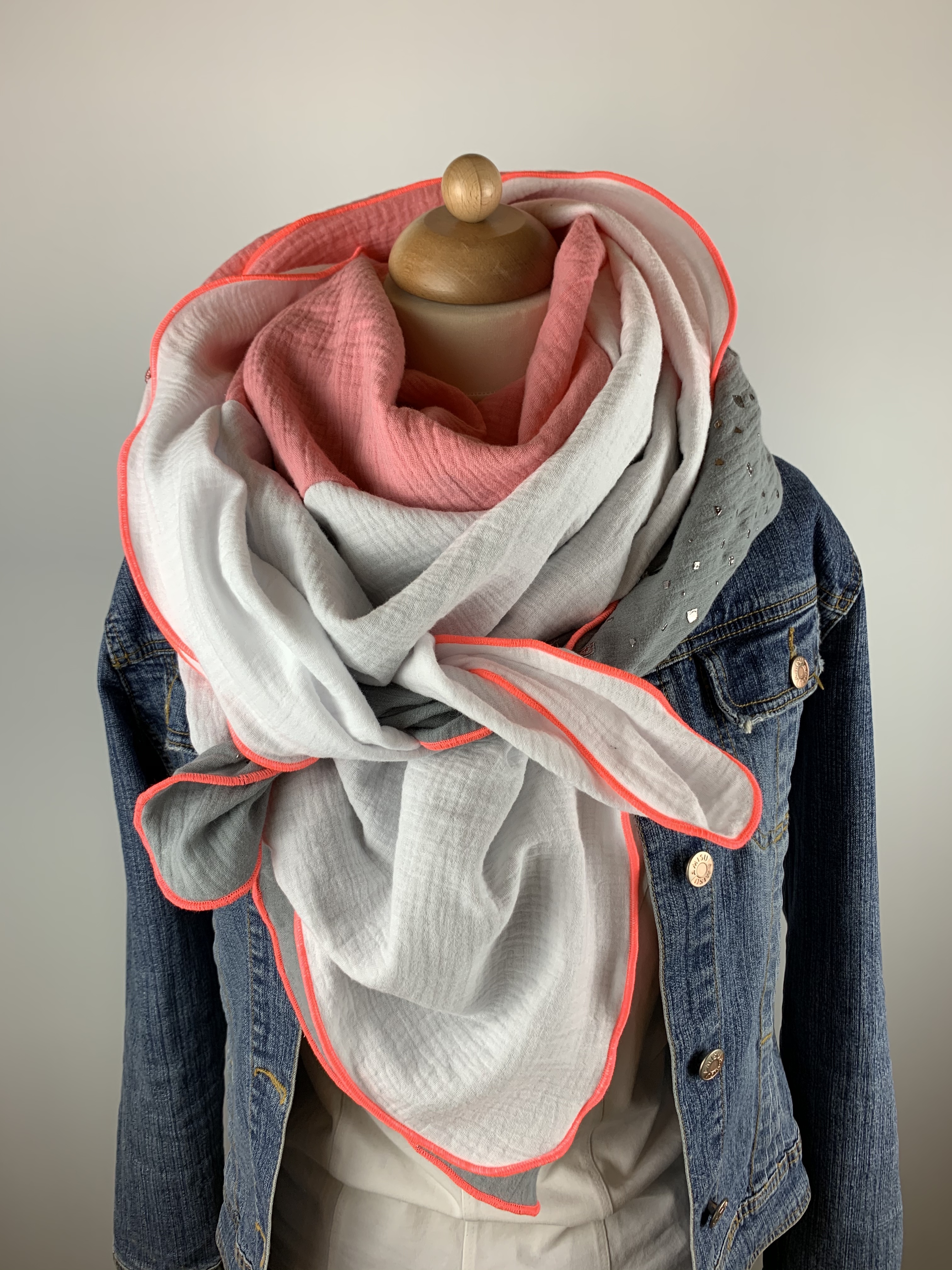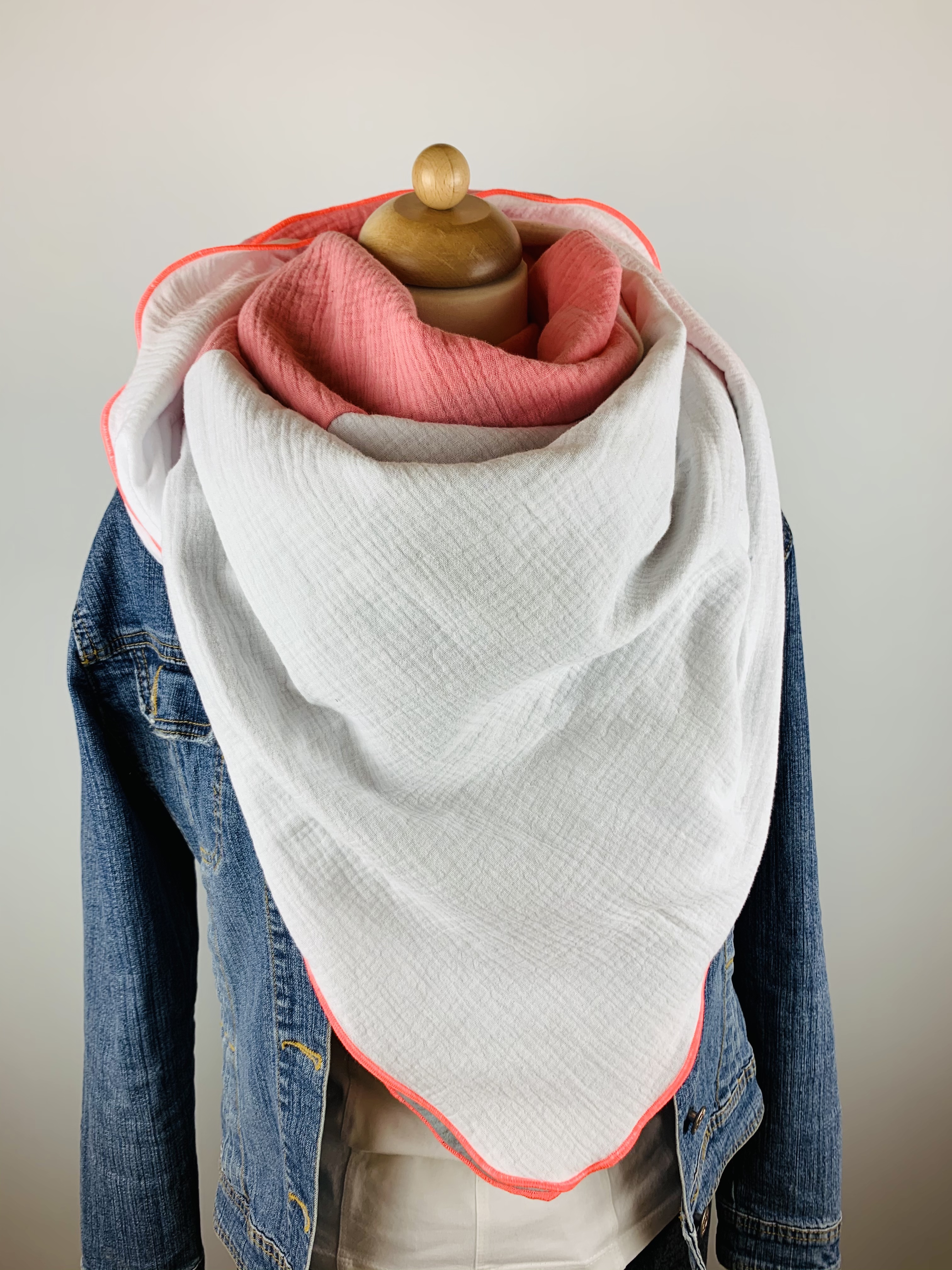 Die Einzigartigkeit des Designs wird durch die Struktur des weichen Musselins in Kombination mit dem Saum in der Farbe neon Pink bestimmt.