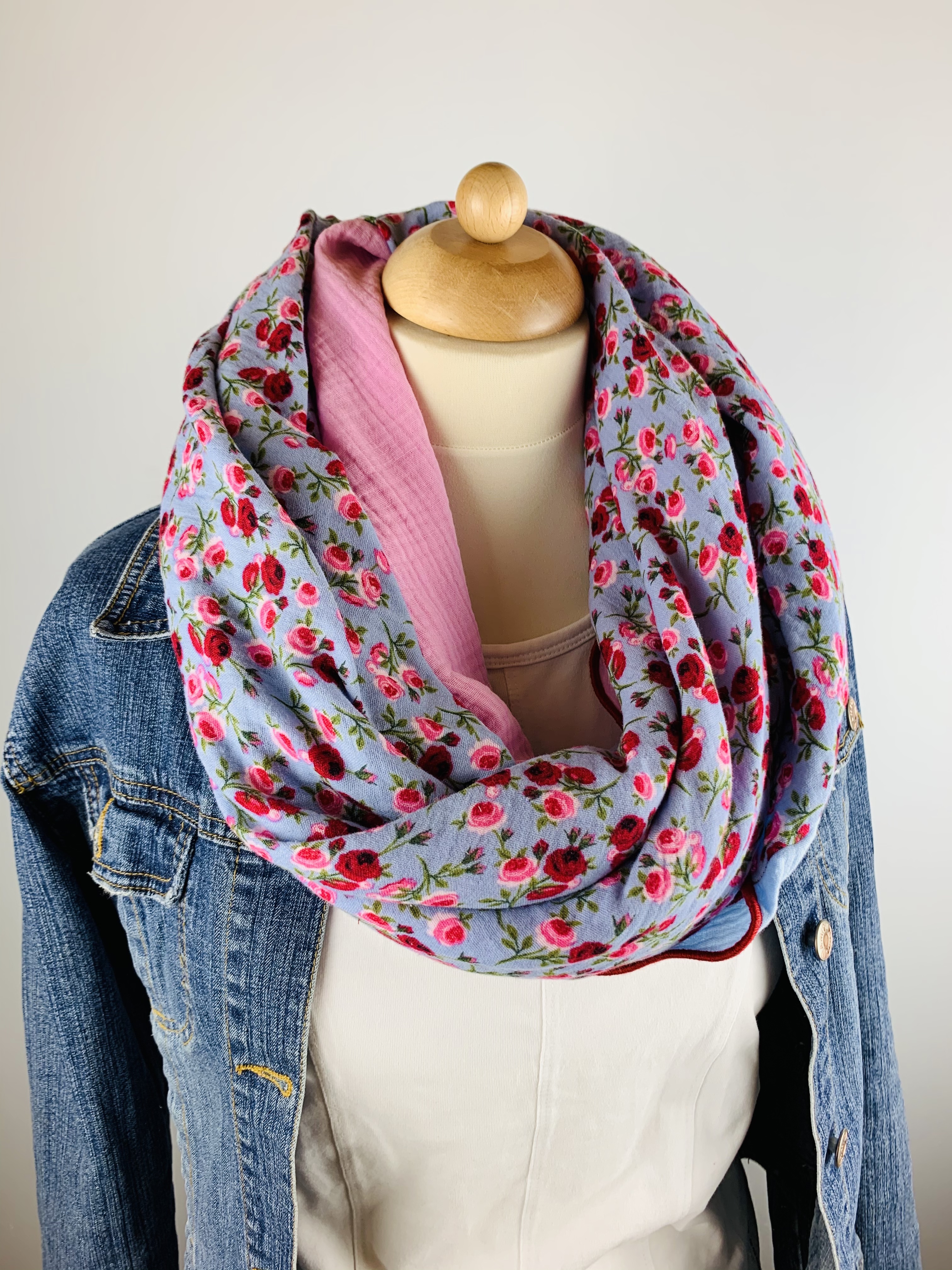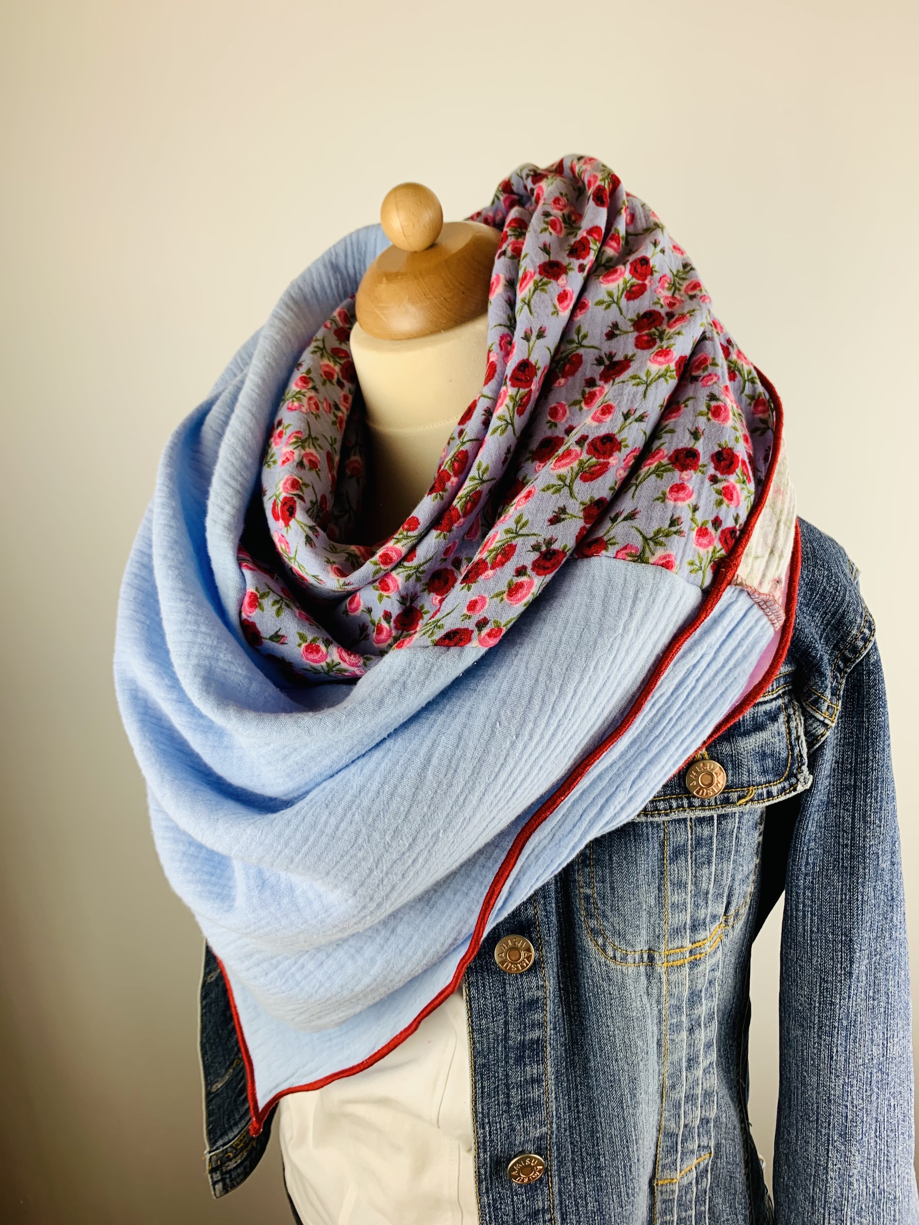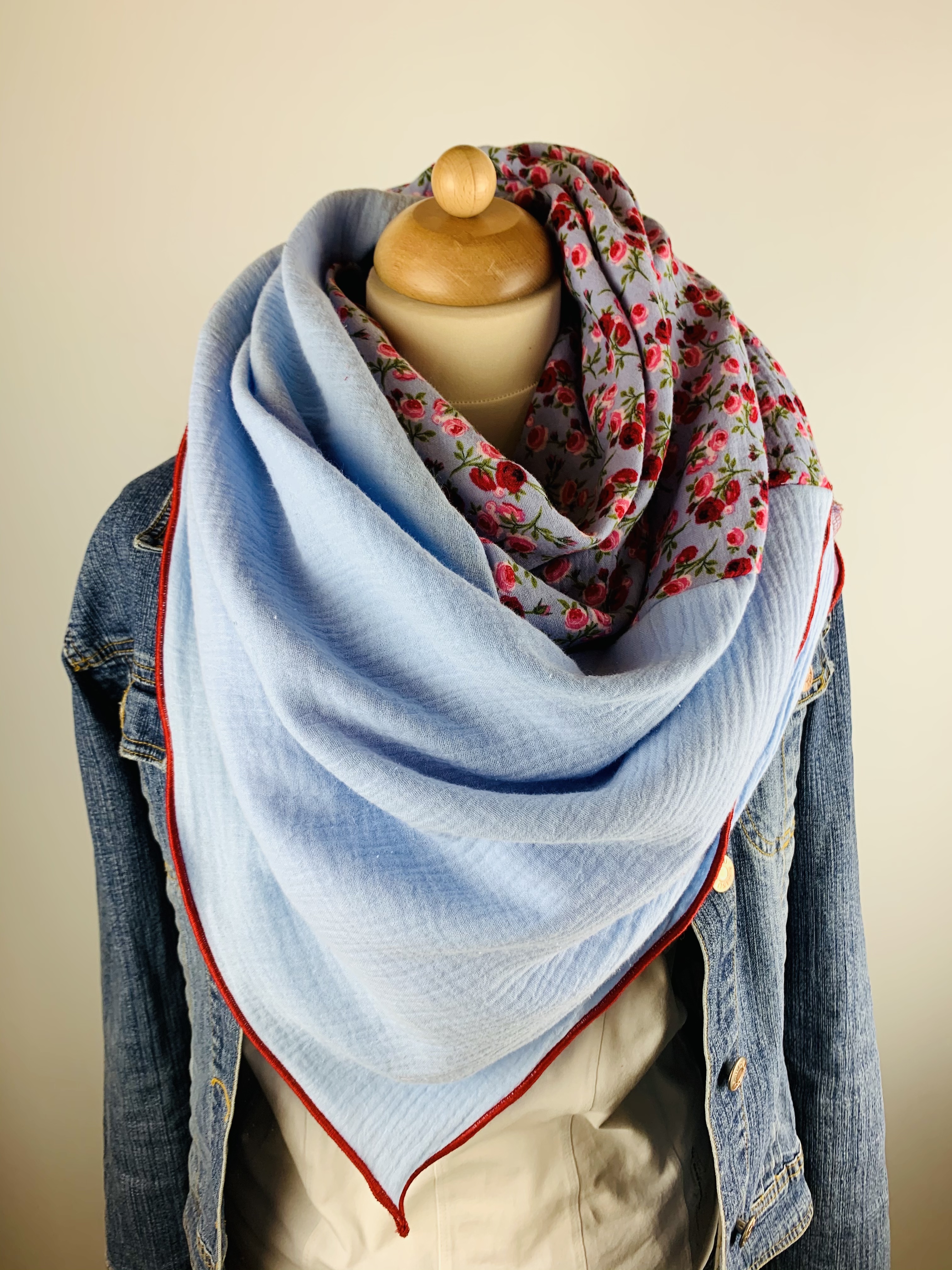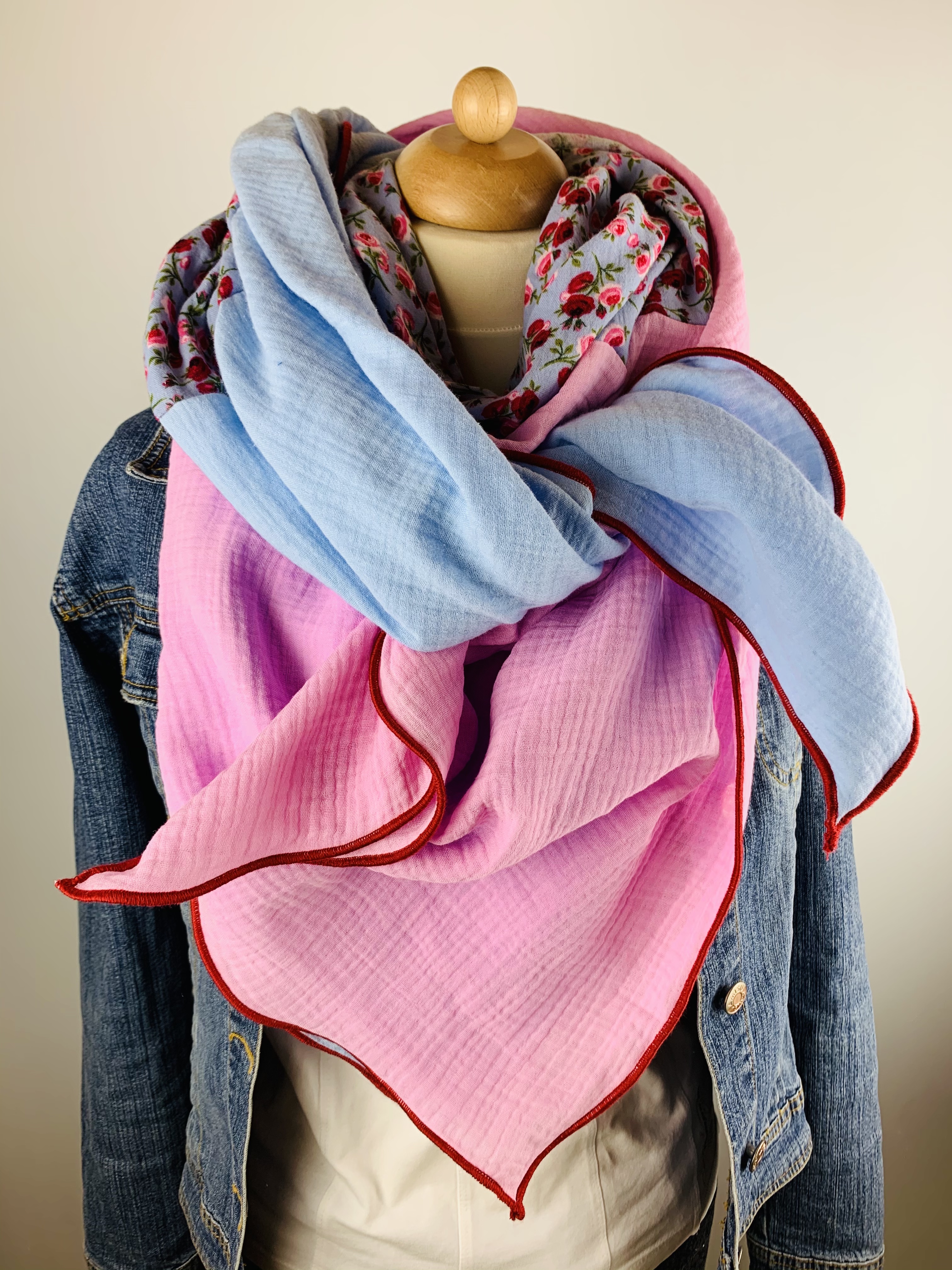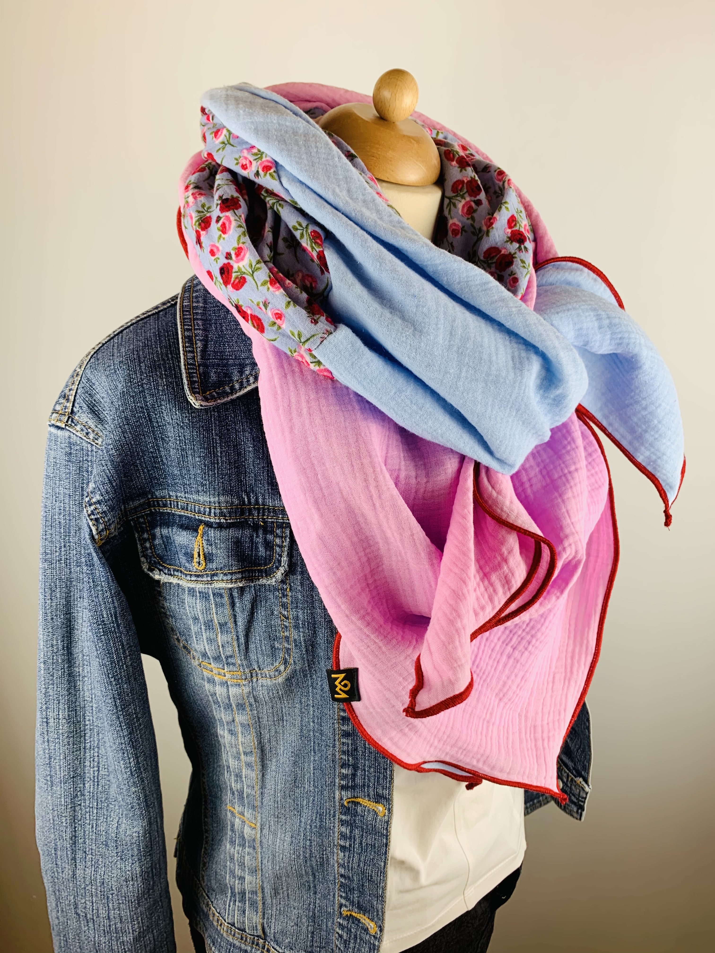Dieser hochwertige, doppelt gewebte Schal aus 100 % Baumwollmusselin wurde in hellblau, rosa un deiner hellblauen Blumenwiese gefertigt.