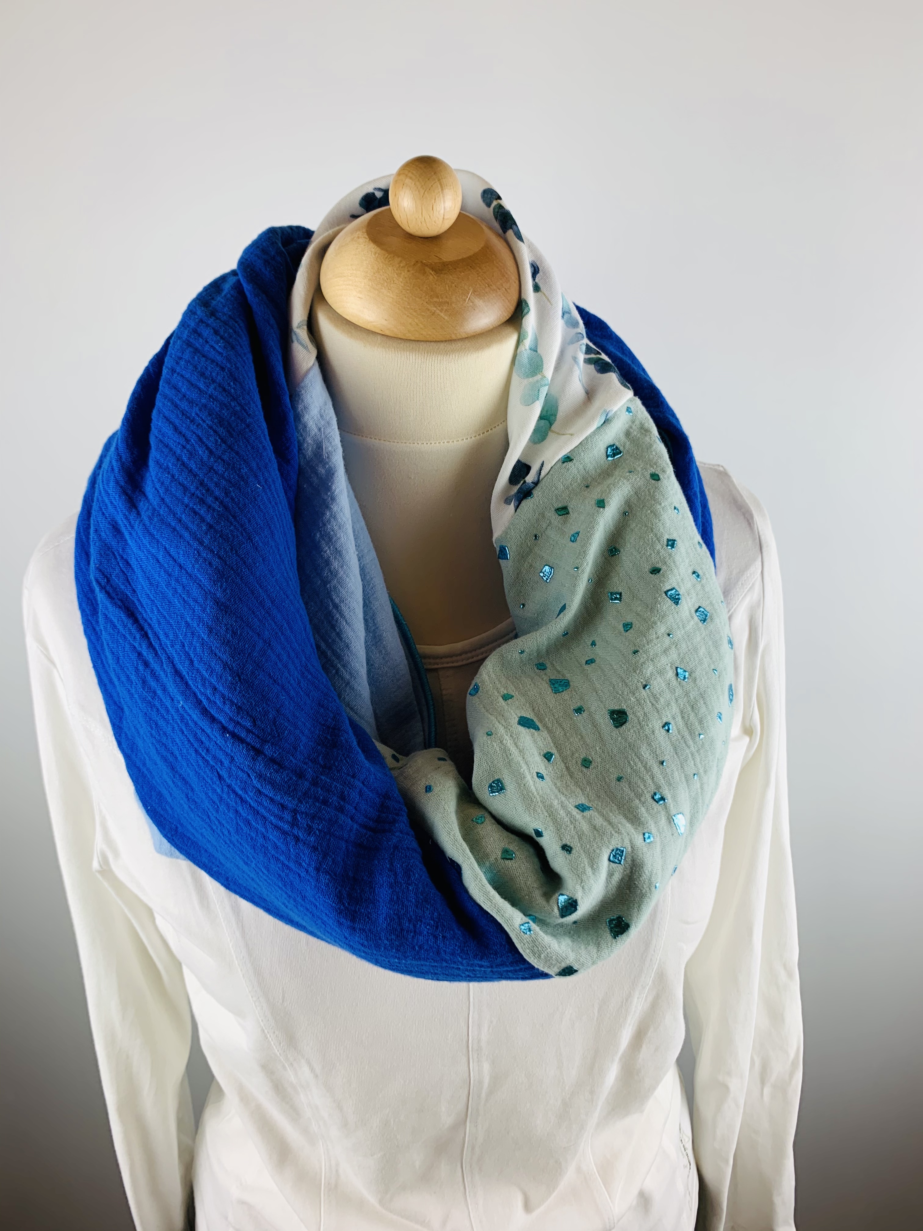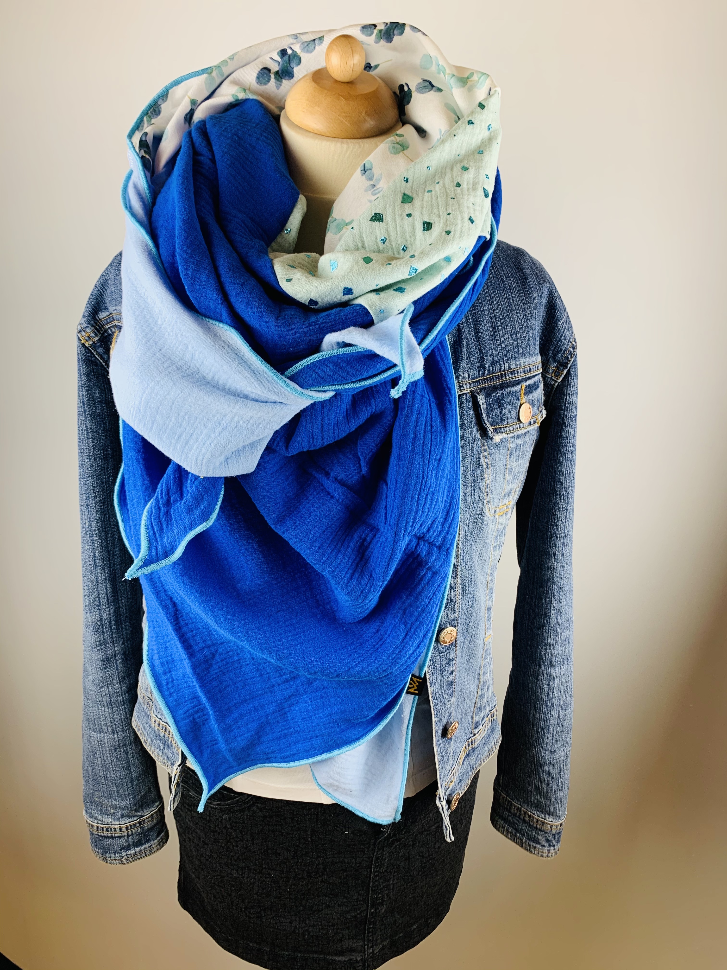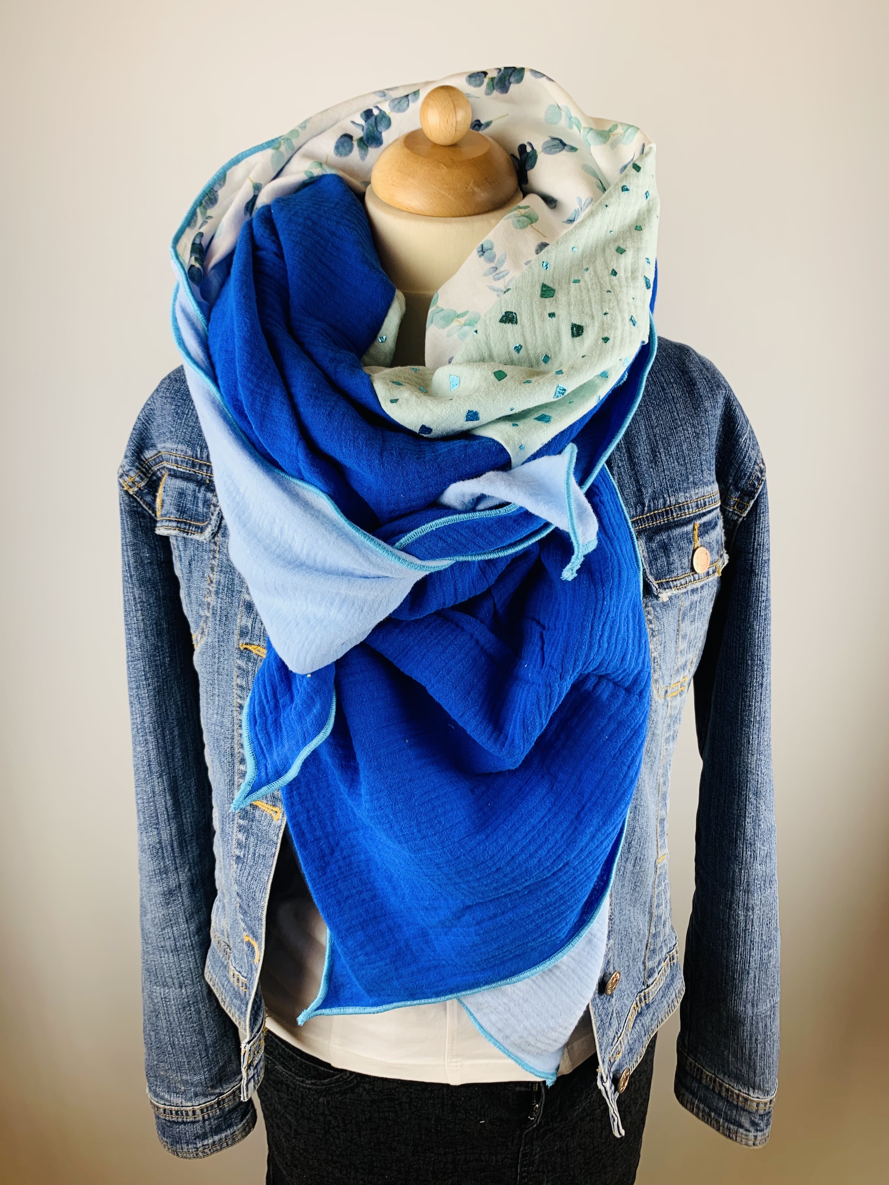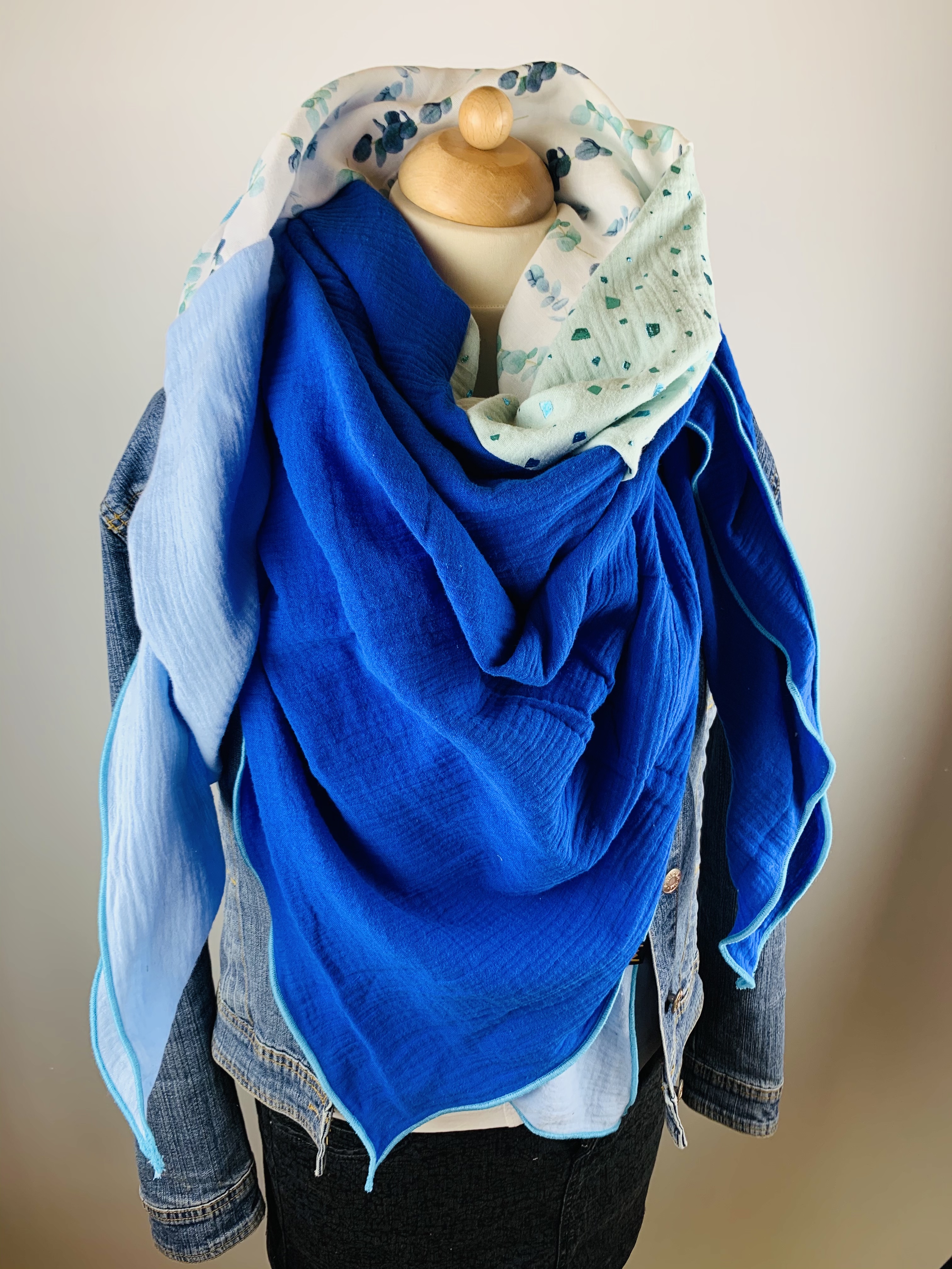 Dieser hochwertige, doppelt gewebte Schal aus 100 % Baumwollmusselin wurde in hellblau, royalblau,weiß mit Eukalyptus und mint mit Glitzerflakes gefertigt.