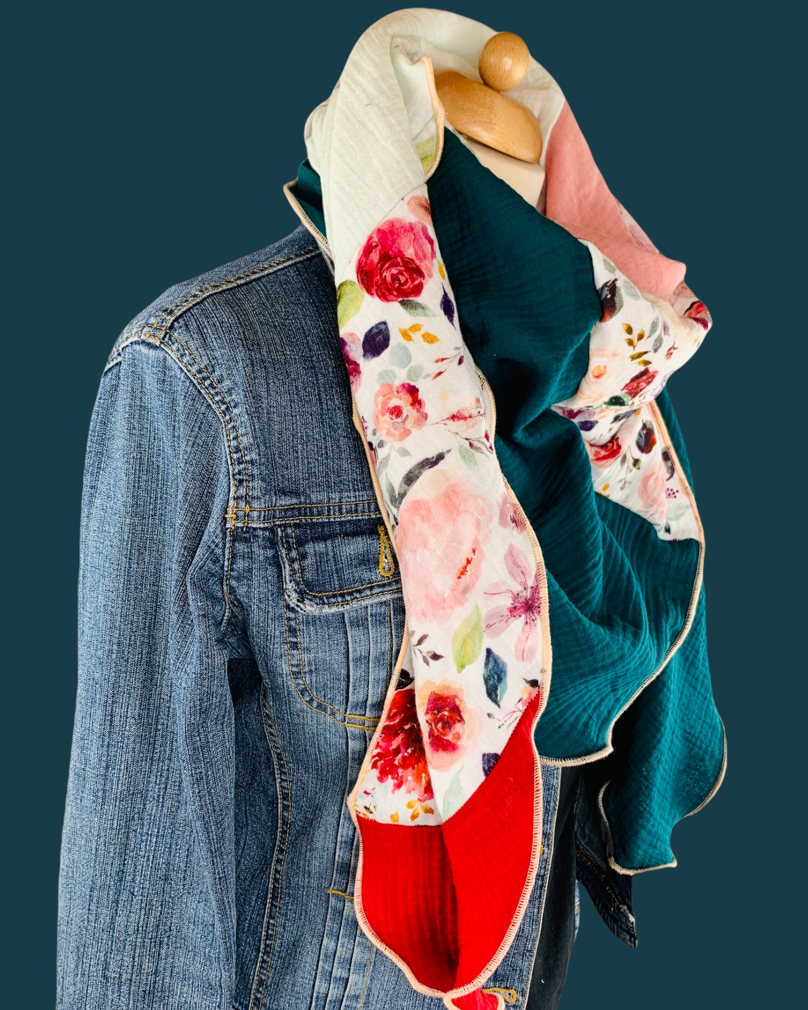 Der Schal besteht aus einem glatten, lockeren und feinfädigen Musselinbaumwollstoff.