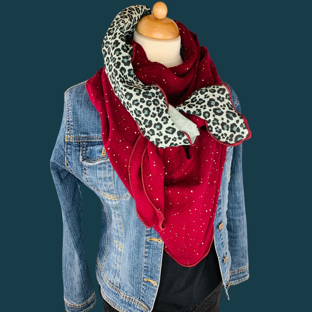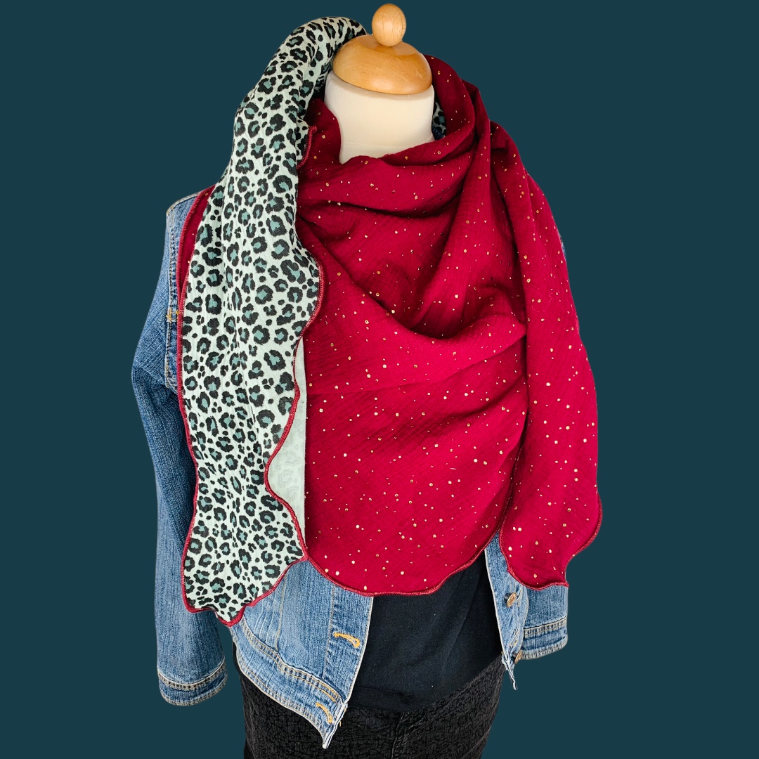 Dieses hochwertige, doppelt gewebte Tuch aus 100% Baumwollmusselin wurde in den Farben "Grün Leoprint und Weinrot mit goldenen Tropfen" gefertigt.
