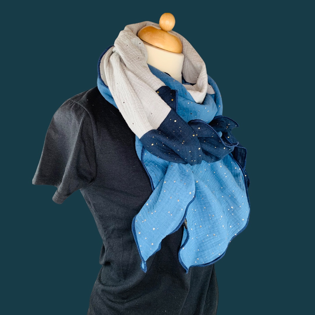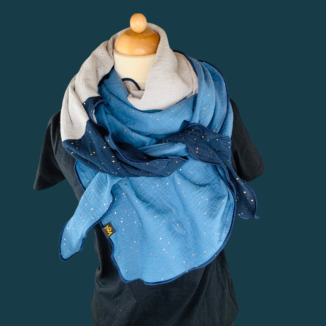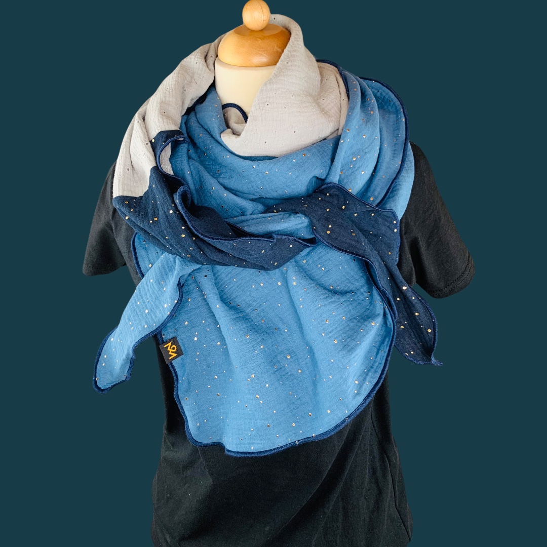Dieses hochwertige, doppelt gewebte Tuch aus 100% Baumwollmusselin wurde in den Farben "Blau, Marineblau mit goldenen Punkten und Hellgrau mit Lochstickerei" gefertigt.