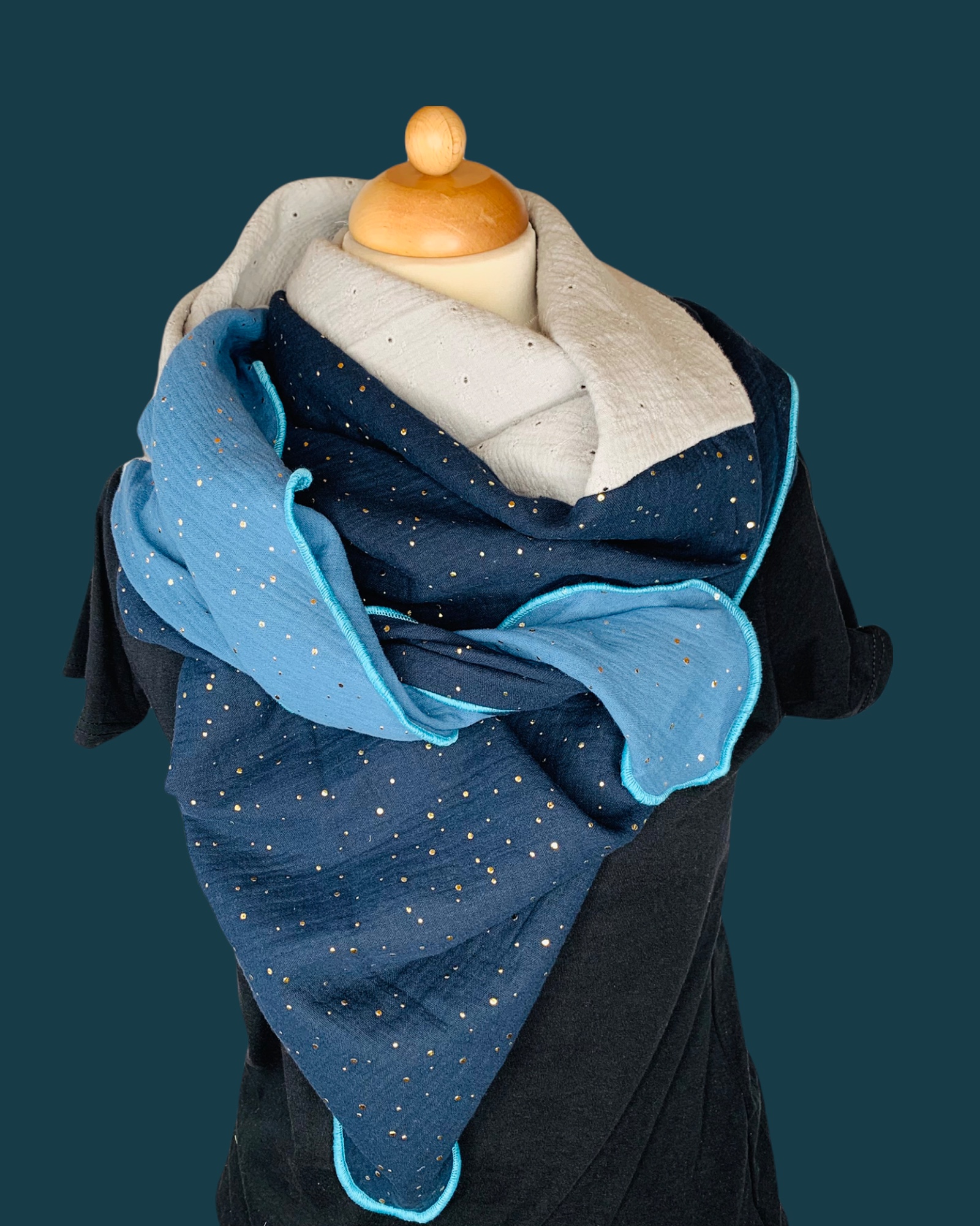 Dieses hochwertige, doppelt gewebte Tuch aus 100% Baumwollmusselin wurde in den Farben "Blau, Marineblau mit goldenen Punkten und Creme mit Lochstickerei" gefertigt.