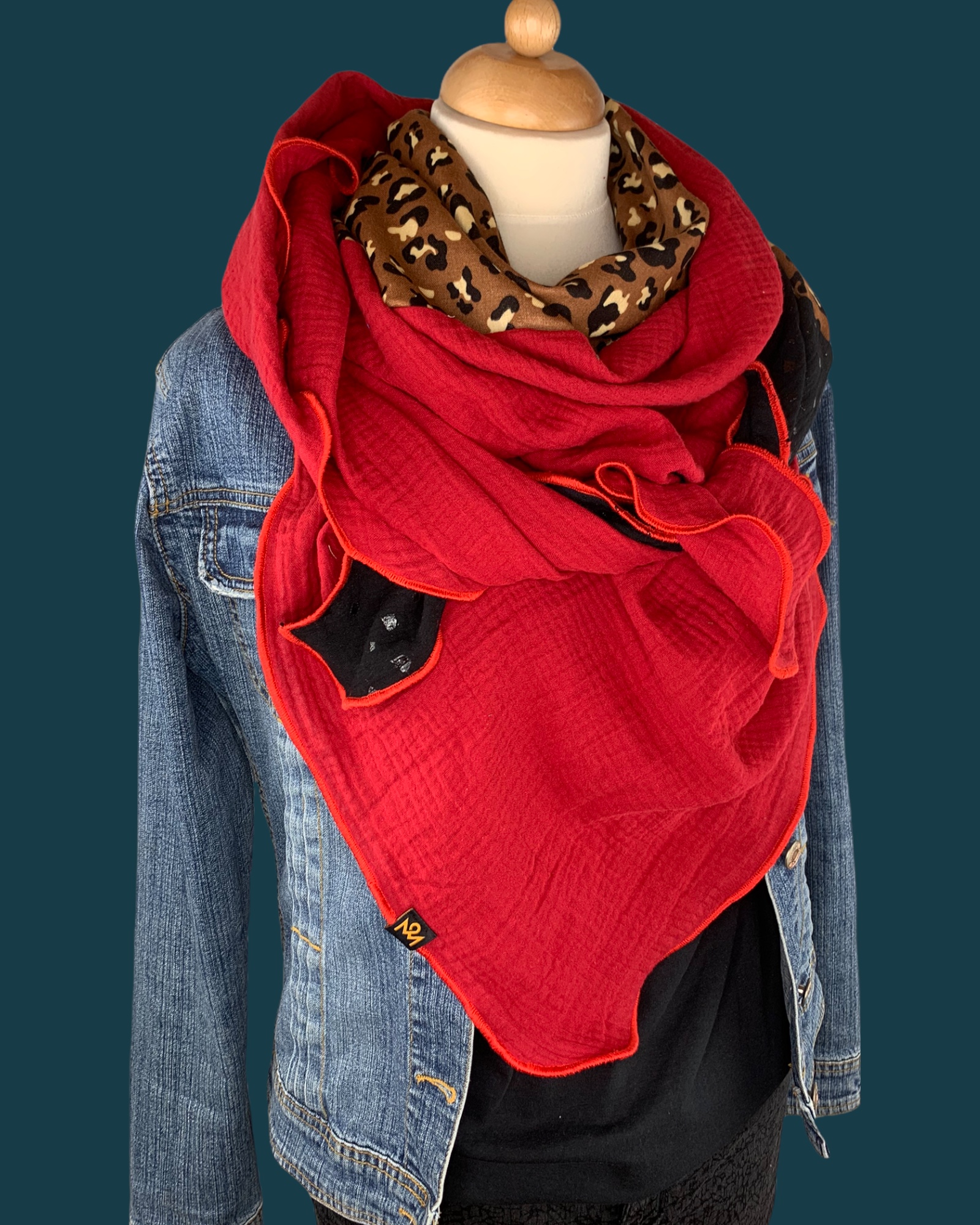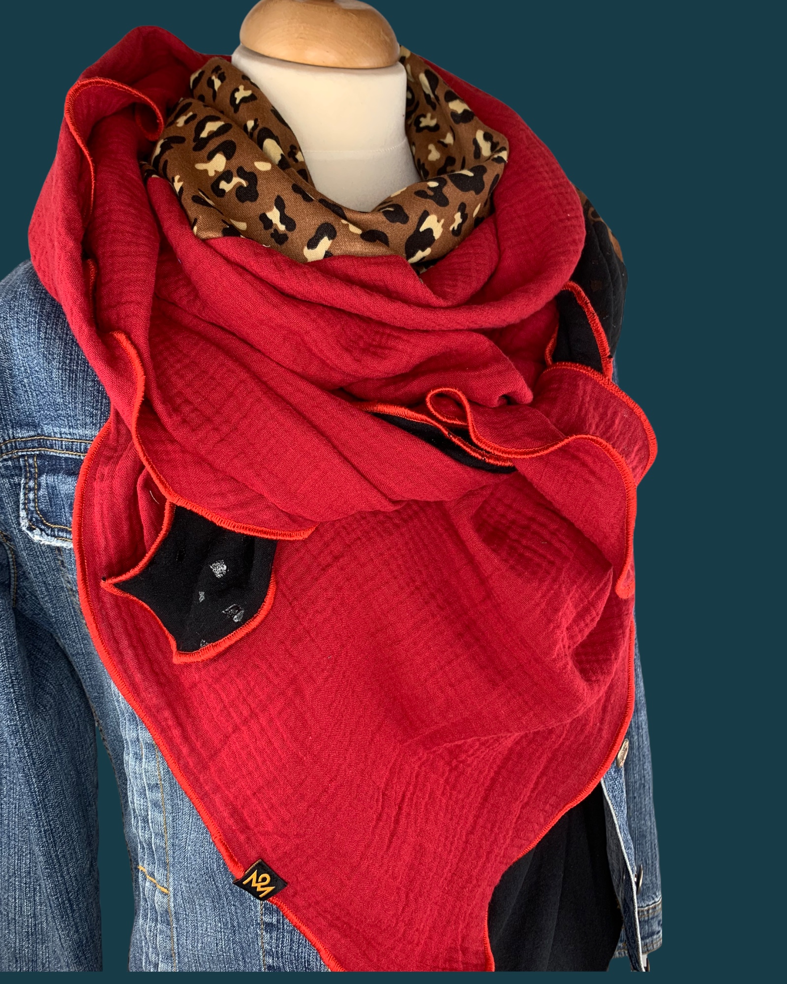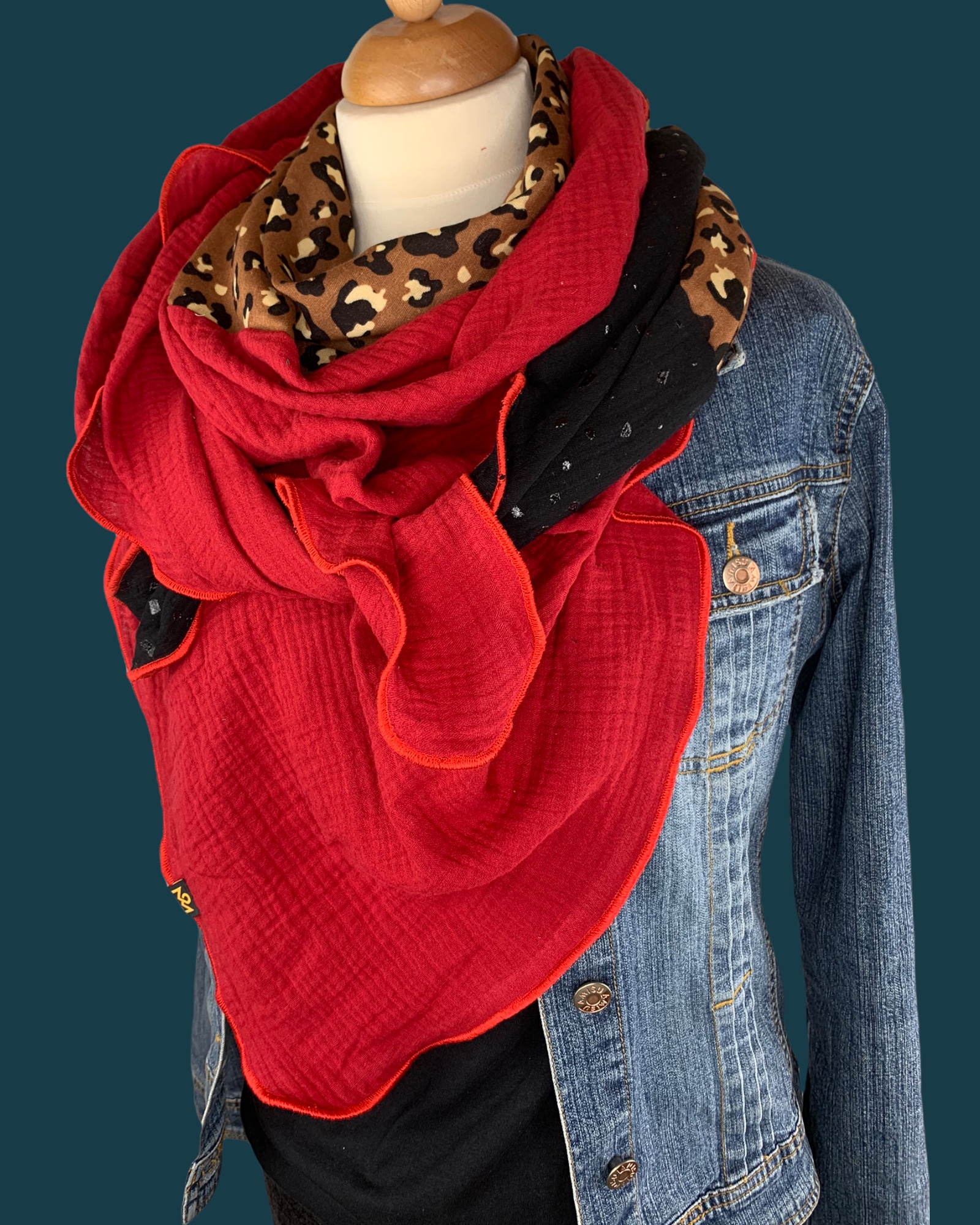 Die Einzigartigkeit des Designs wird durch die Struktur des weichen Baumwollmusselins in Kombination mit der Gewebekante in den Farben "Rot" bestimmt.