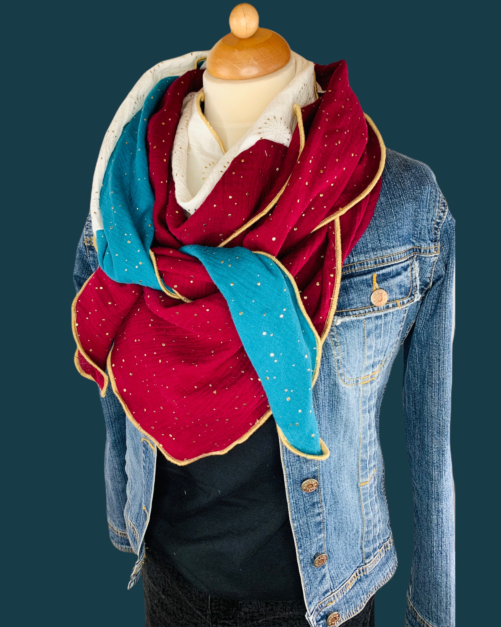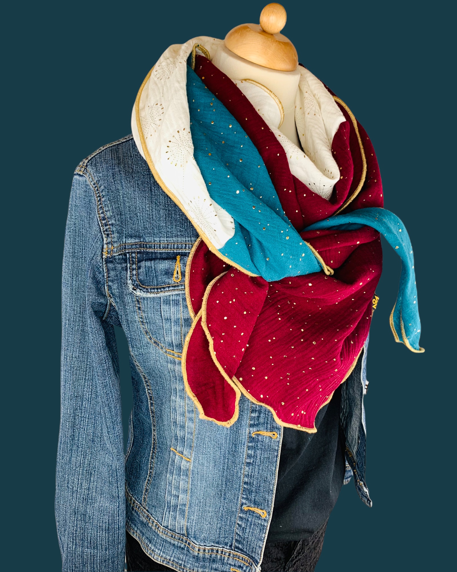 Der Schal besteht aus einem glatten, lockeren und feinfädigen Musselinbaumwollstoff.