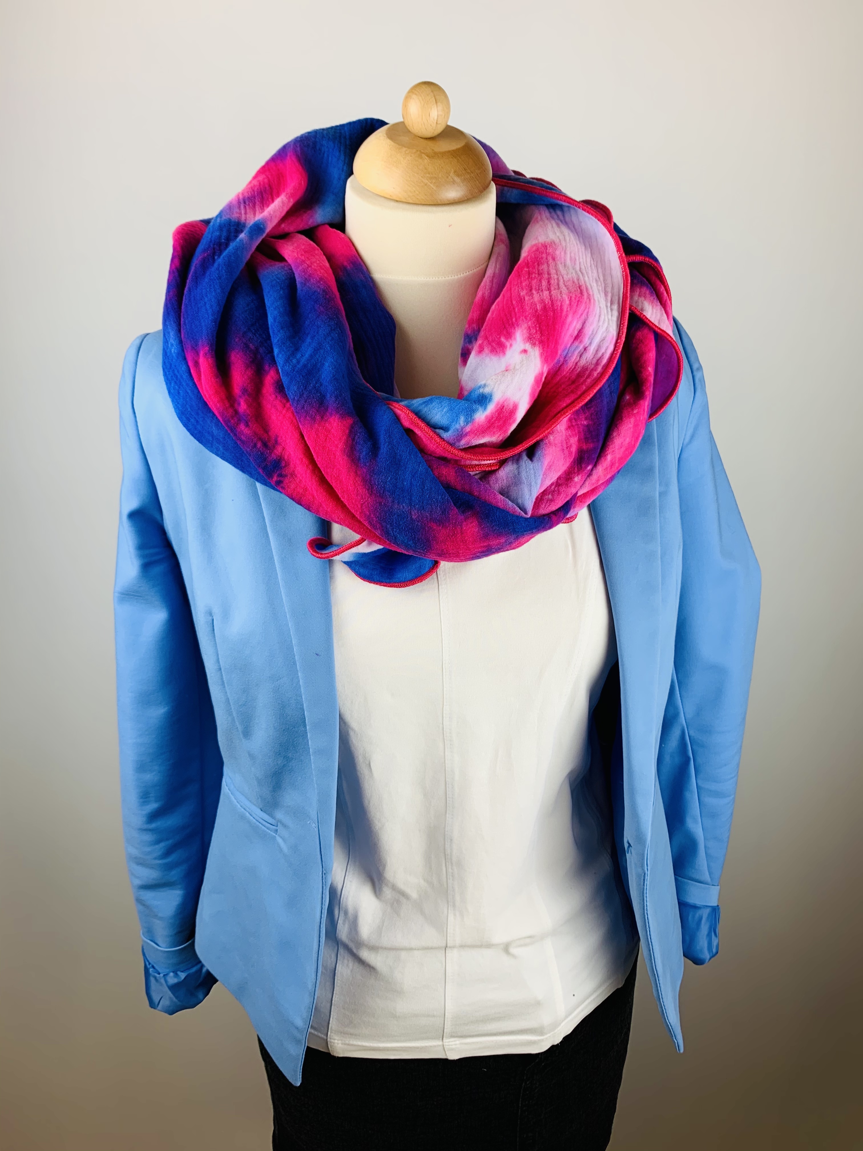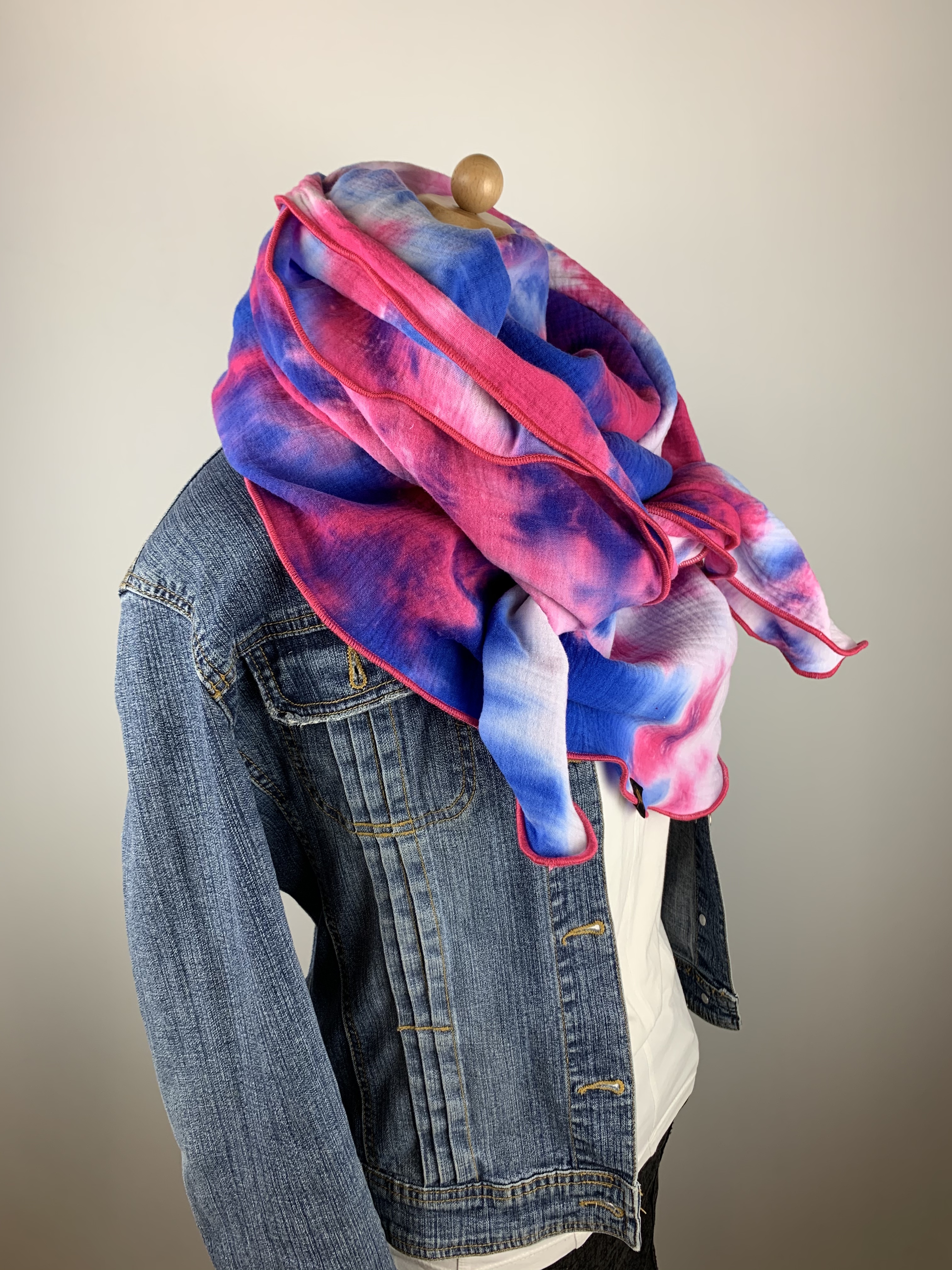 Dieser hochwertige, doppelt gewebte Schal aus 100 % Baumwollmusselin wurde in pink, dunkelblauer,rosa Batik Optik gefertigt.