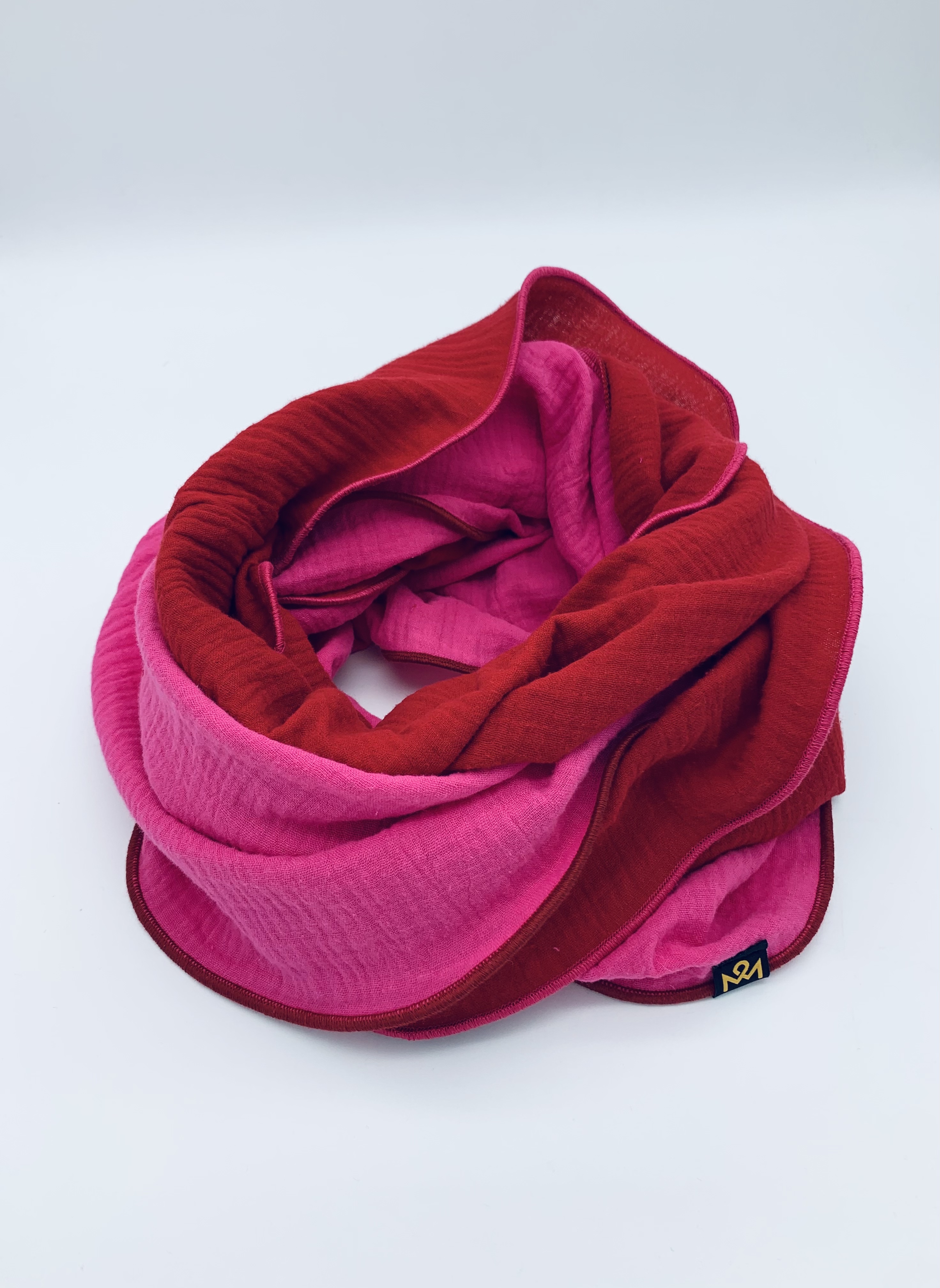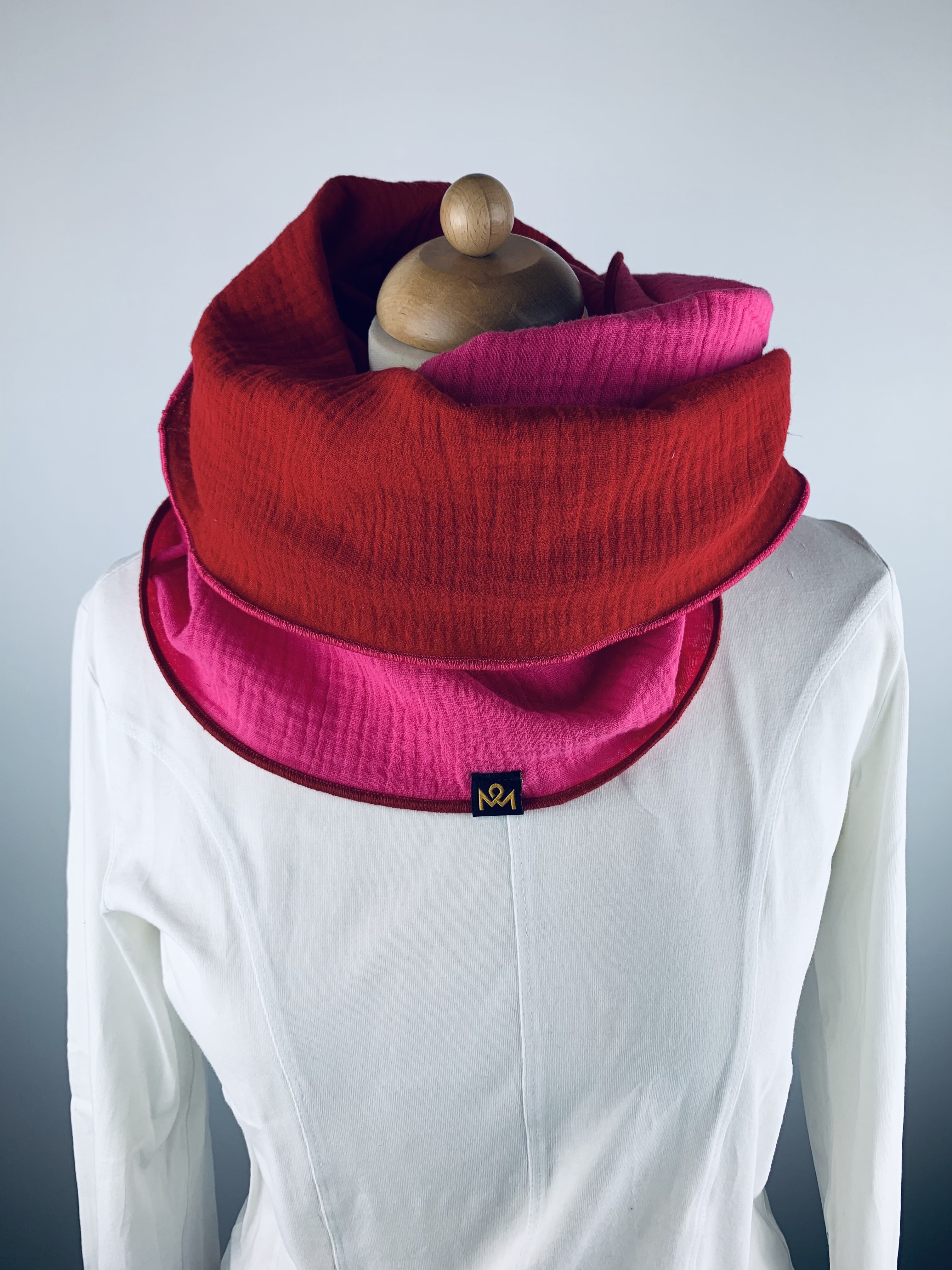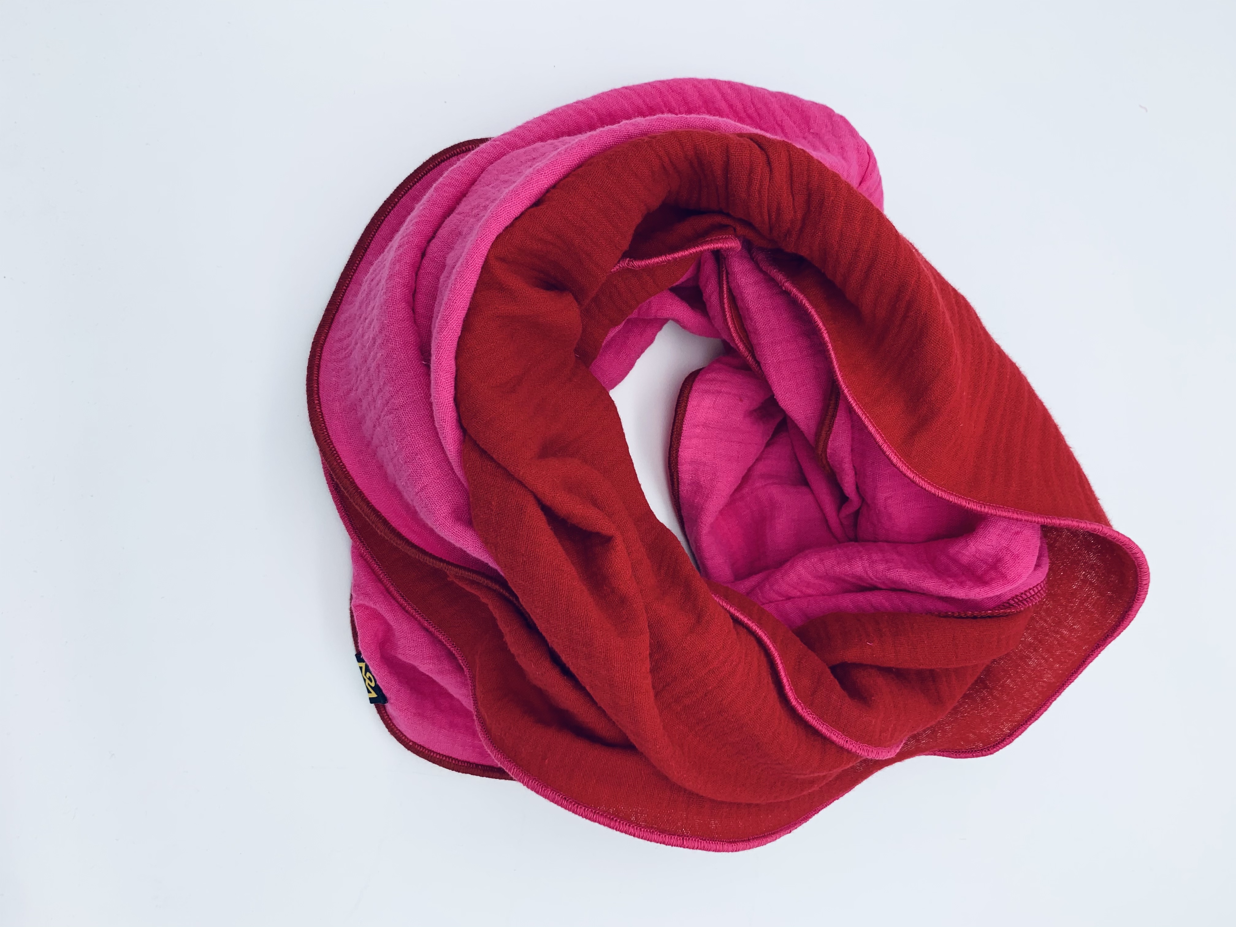 Hochwertiger, doppelt gewebter Schlauchschal aus 100 % Baumwollmusselin in der Farbe pink und rot.