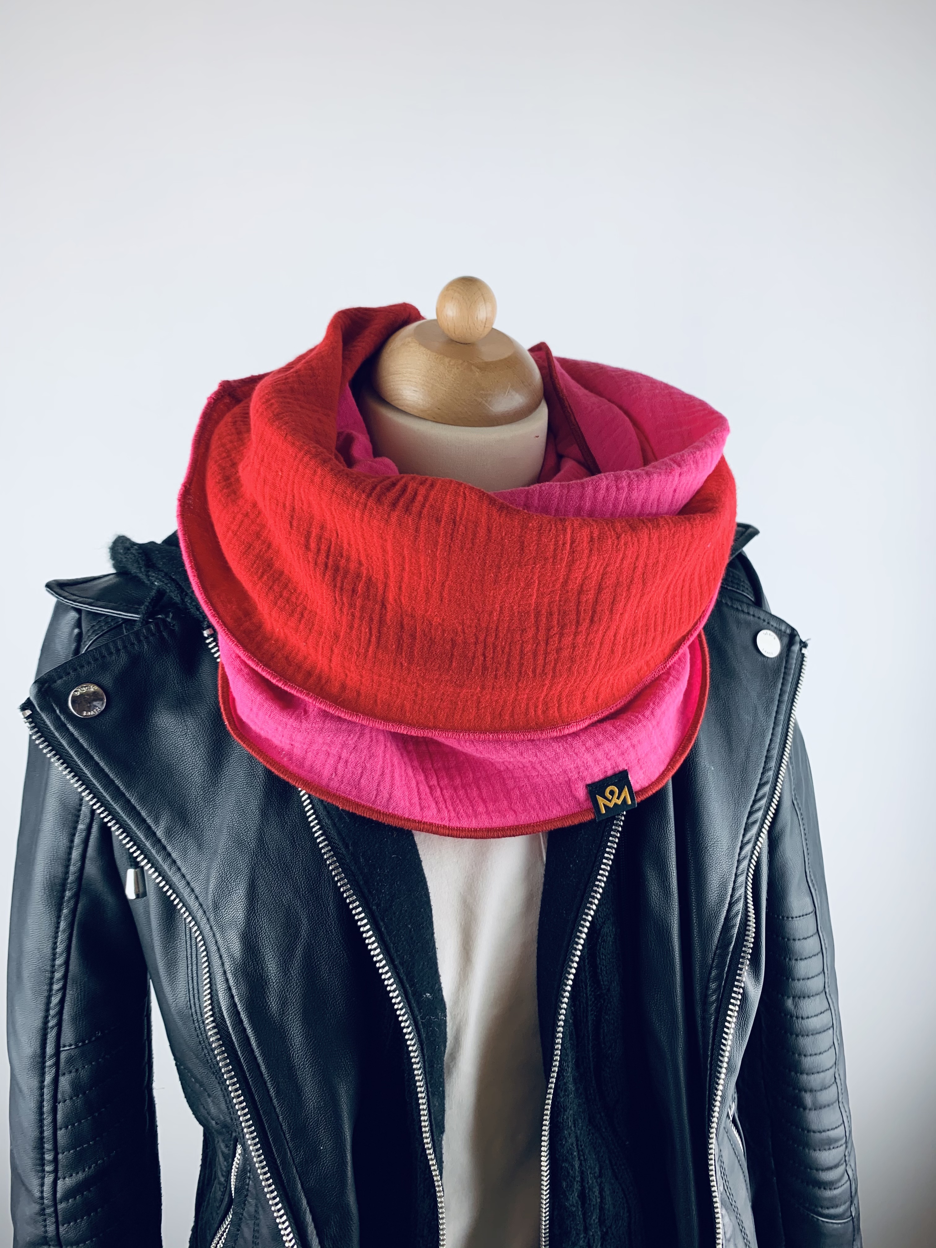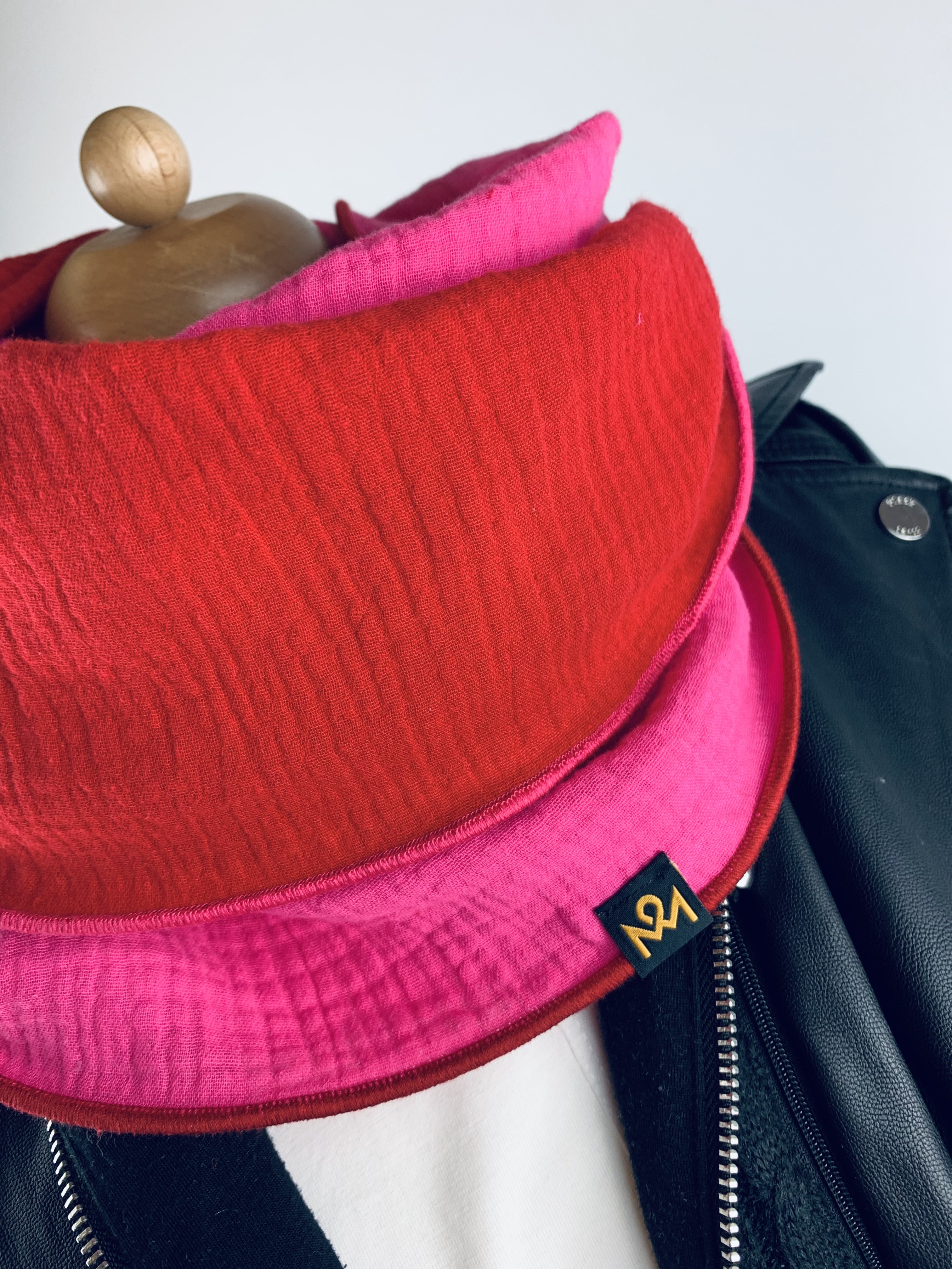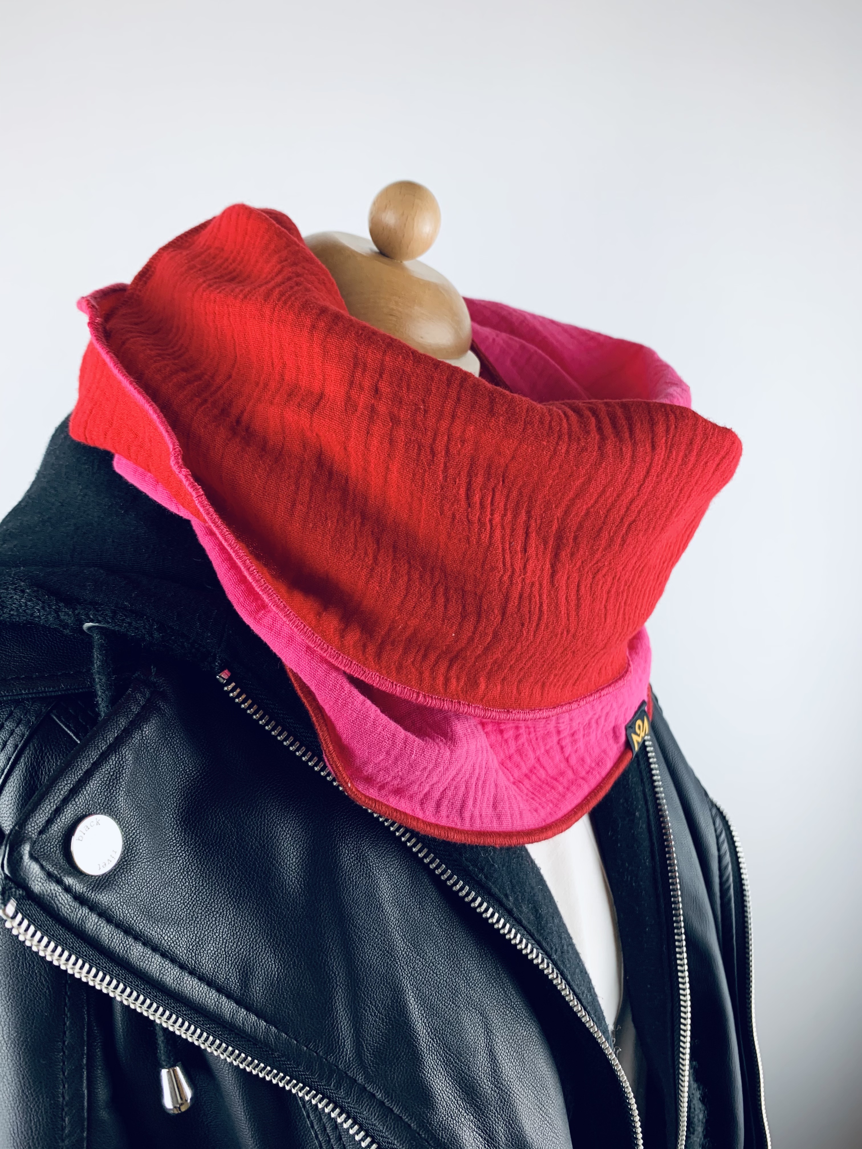 Hochwertiger, doppelt gewebter Schlauchschal aus 100 % Baumwollmusselin in der Farbe pink und rot.