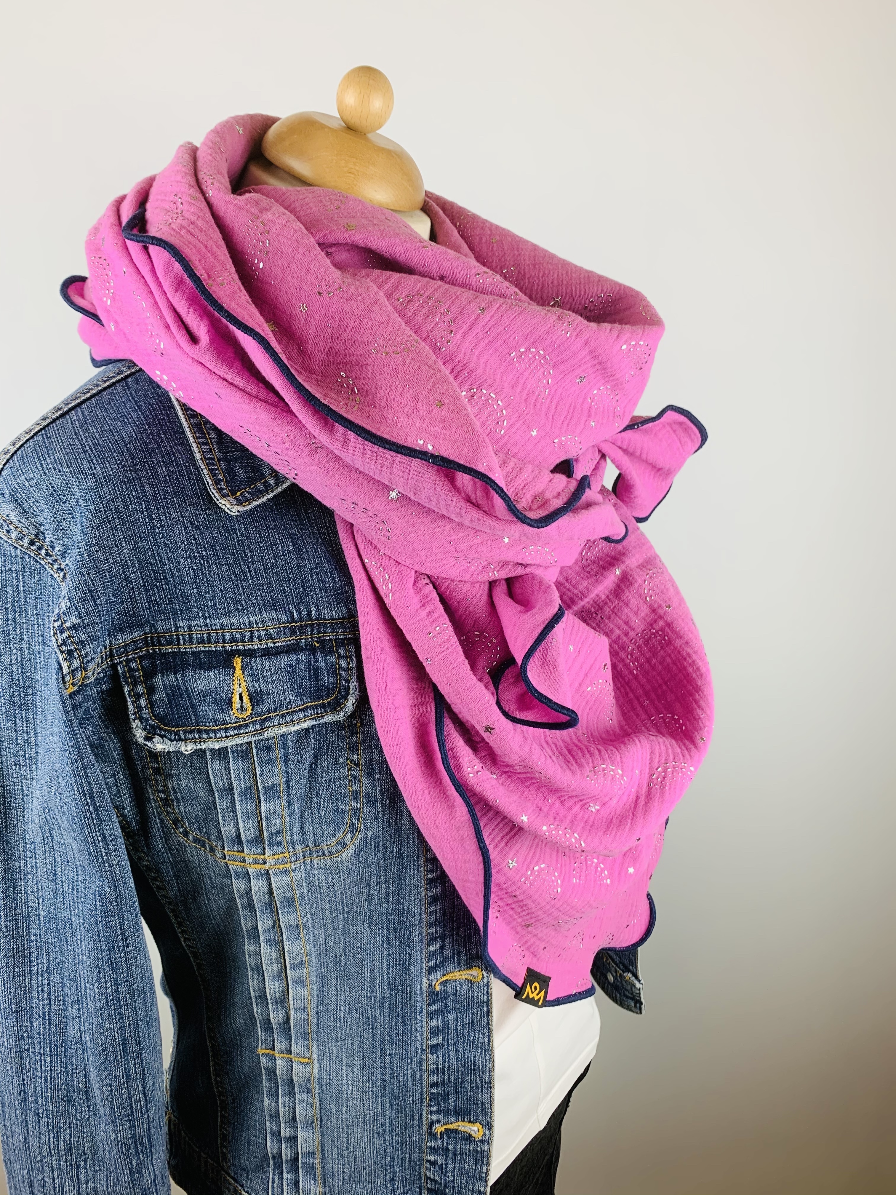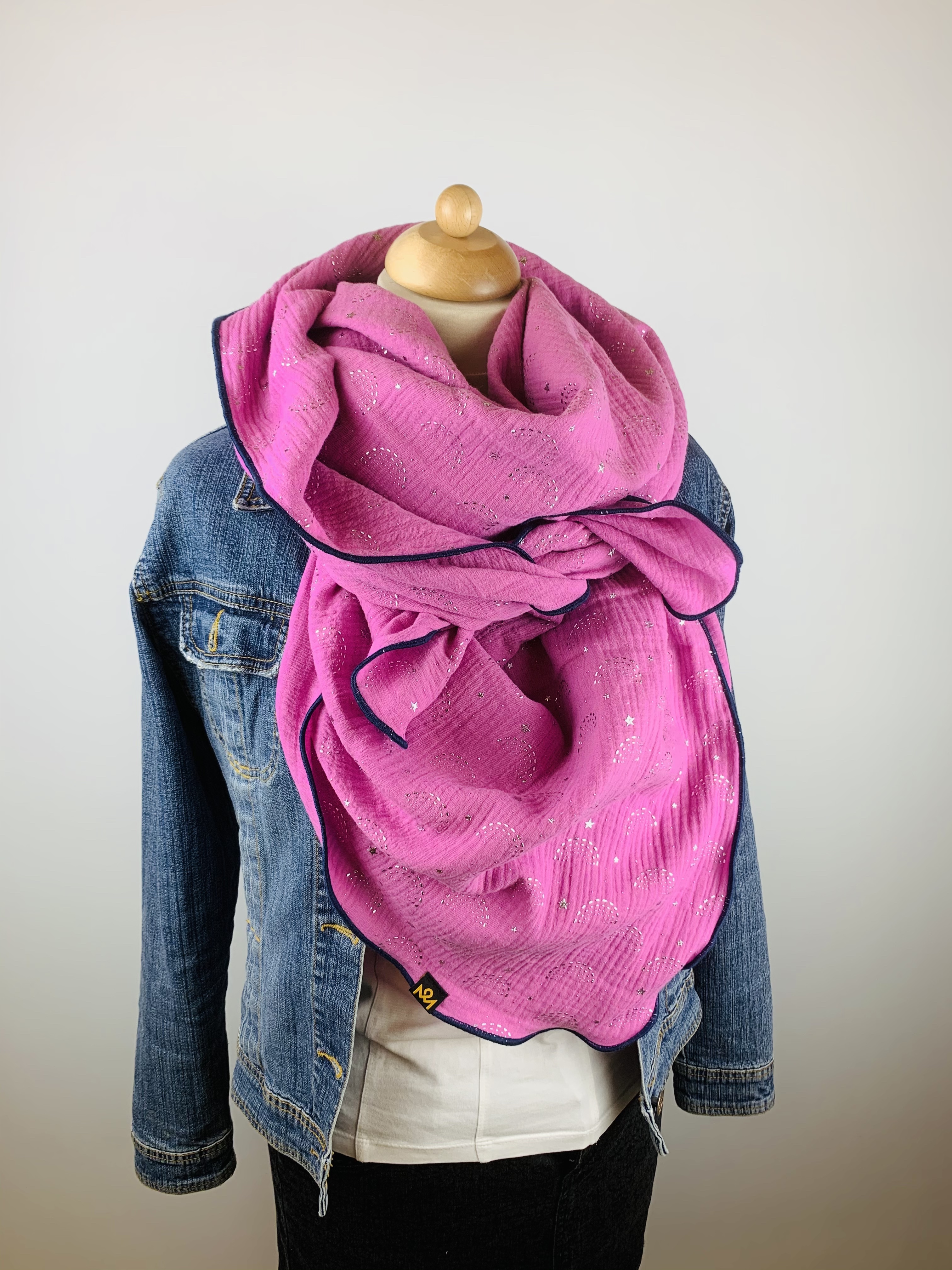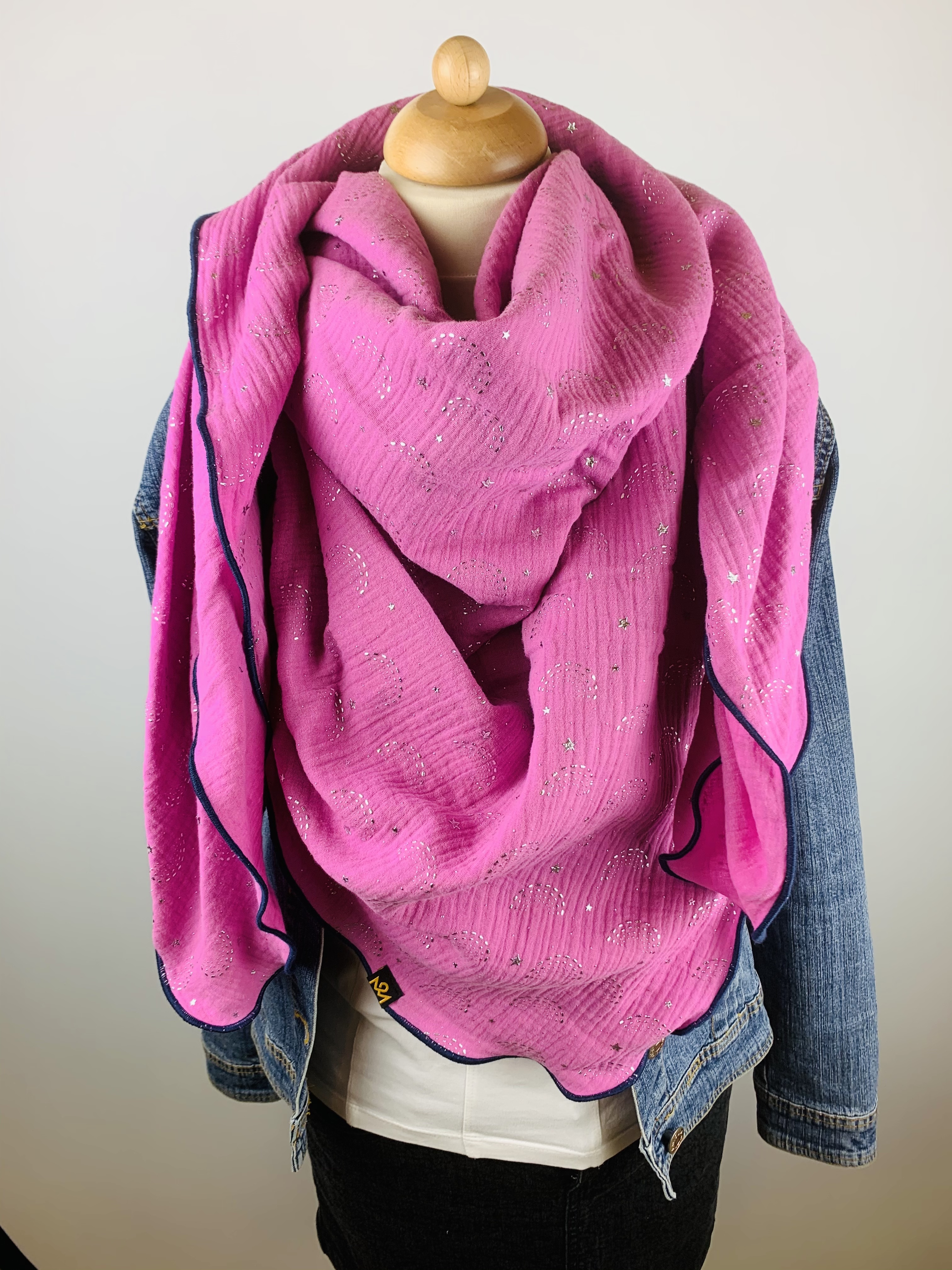 Dieser hochwertige, doppelt gewebte Schal aus 100 % Baumwollmusselin wurde in rosa mit silbernen Regenbögen und Sternen gefertigt.