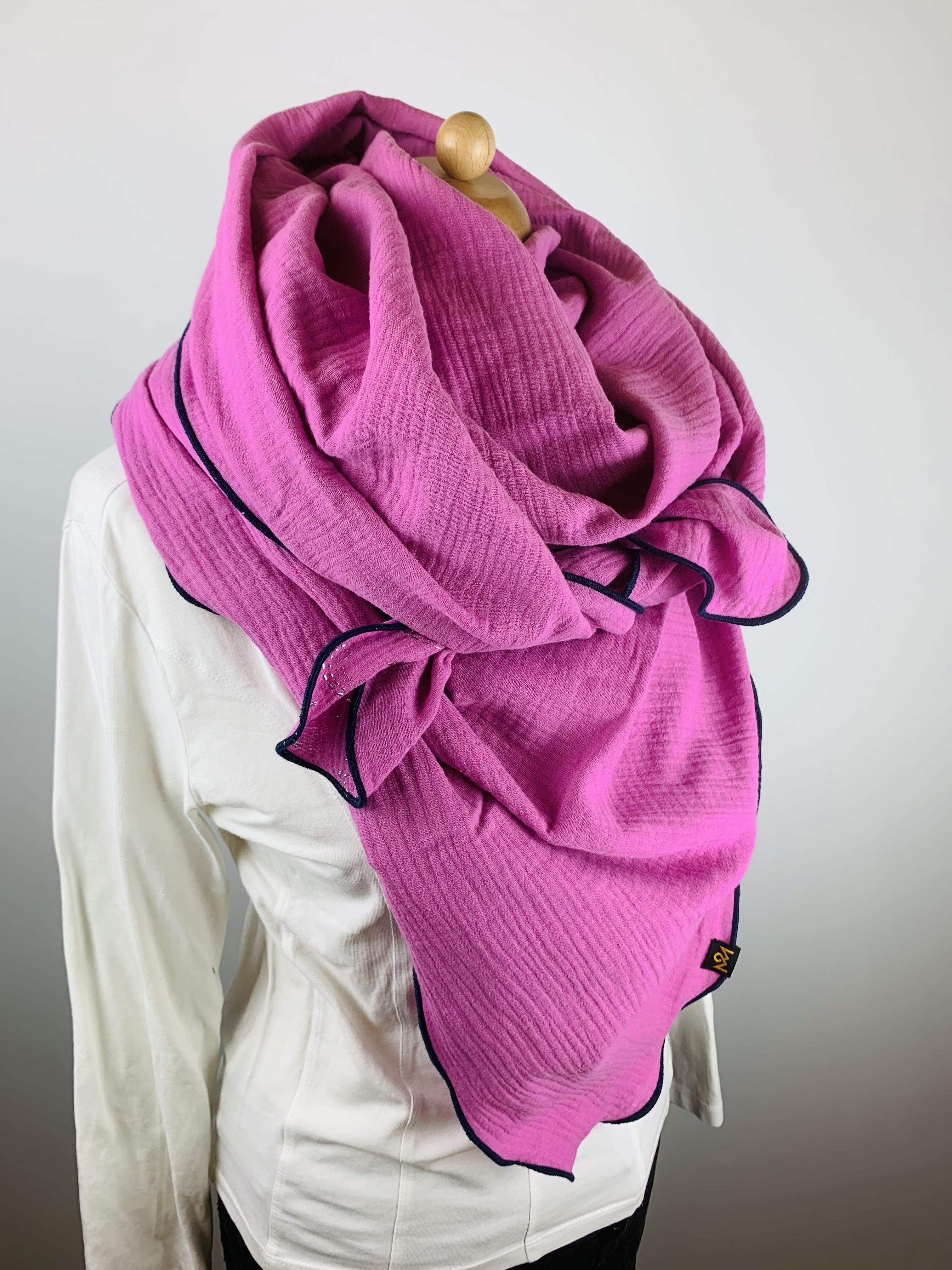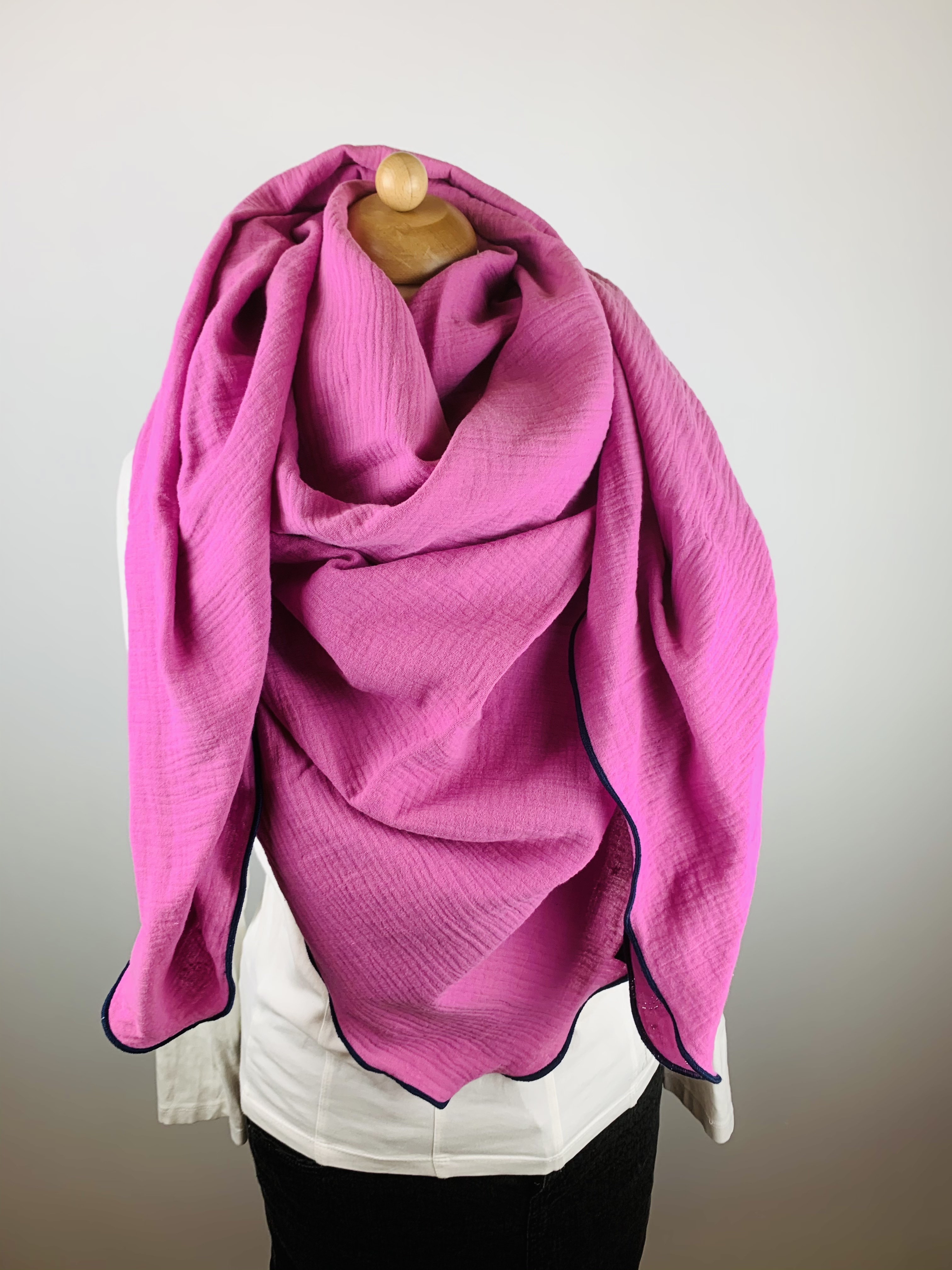 Die Einzigartigkeit des Designs wird durch die Struktur des weichen Musselins in Kombination mit dem Saum in der Farbe dunkelblau bestimmt.