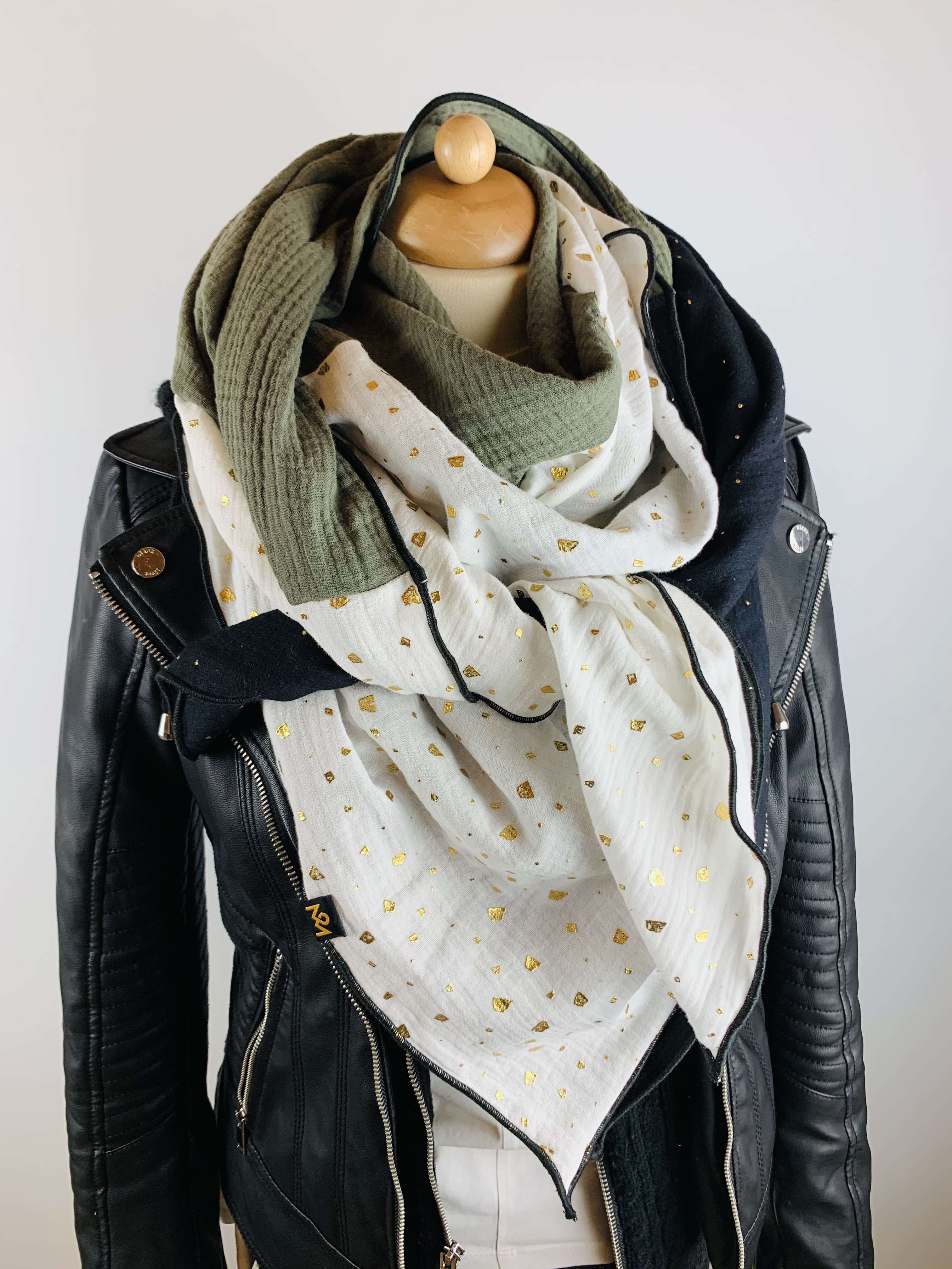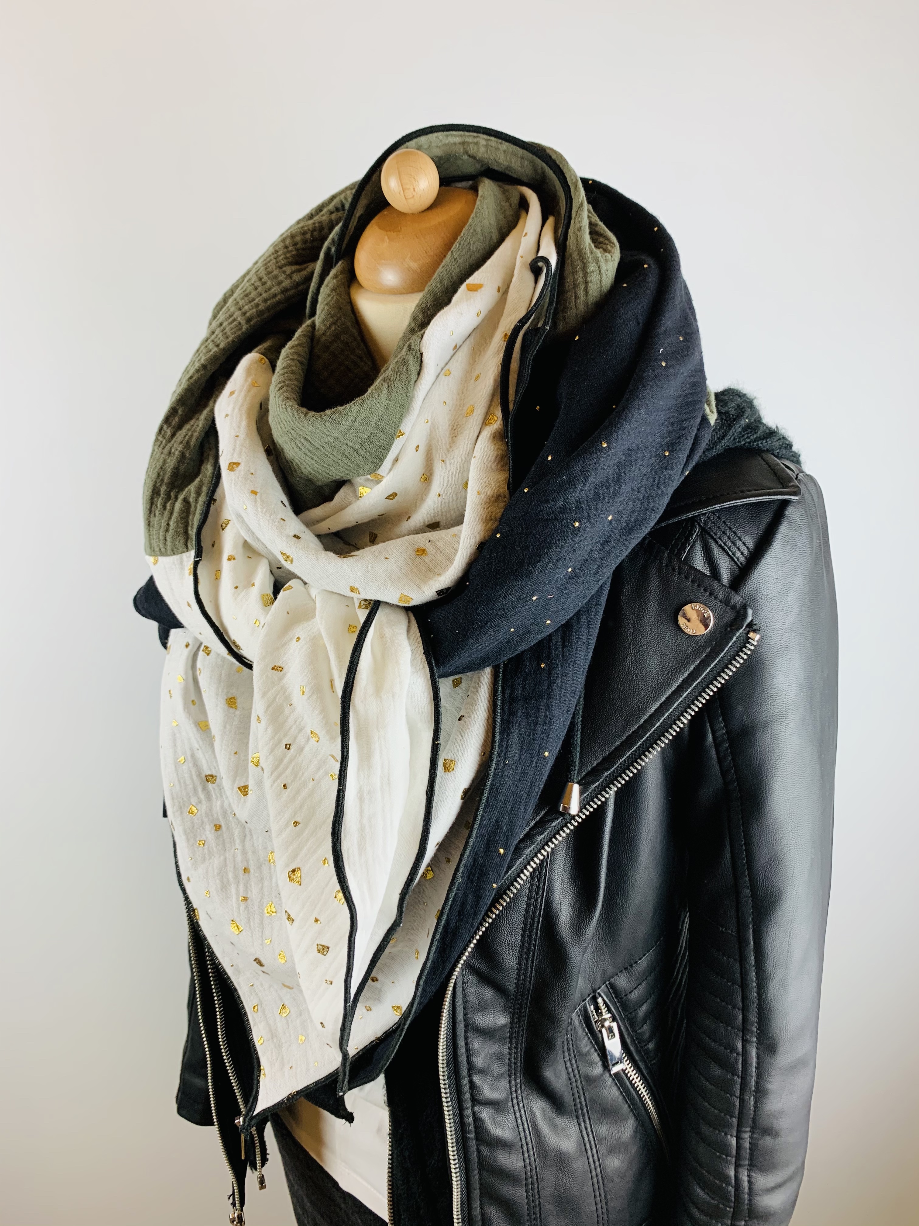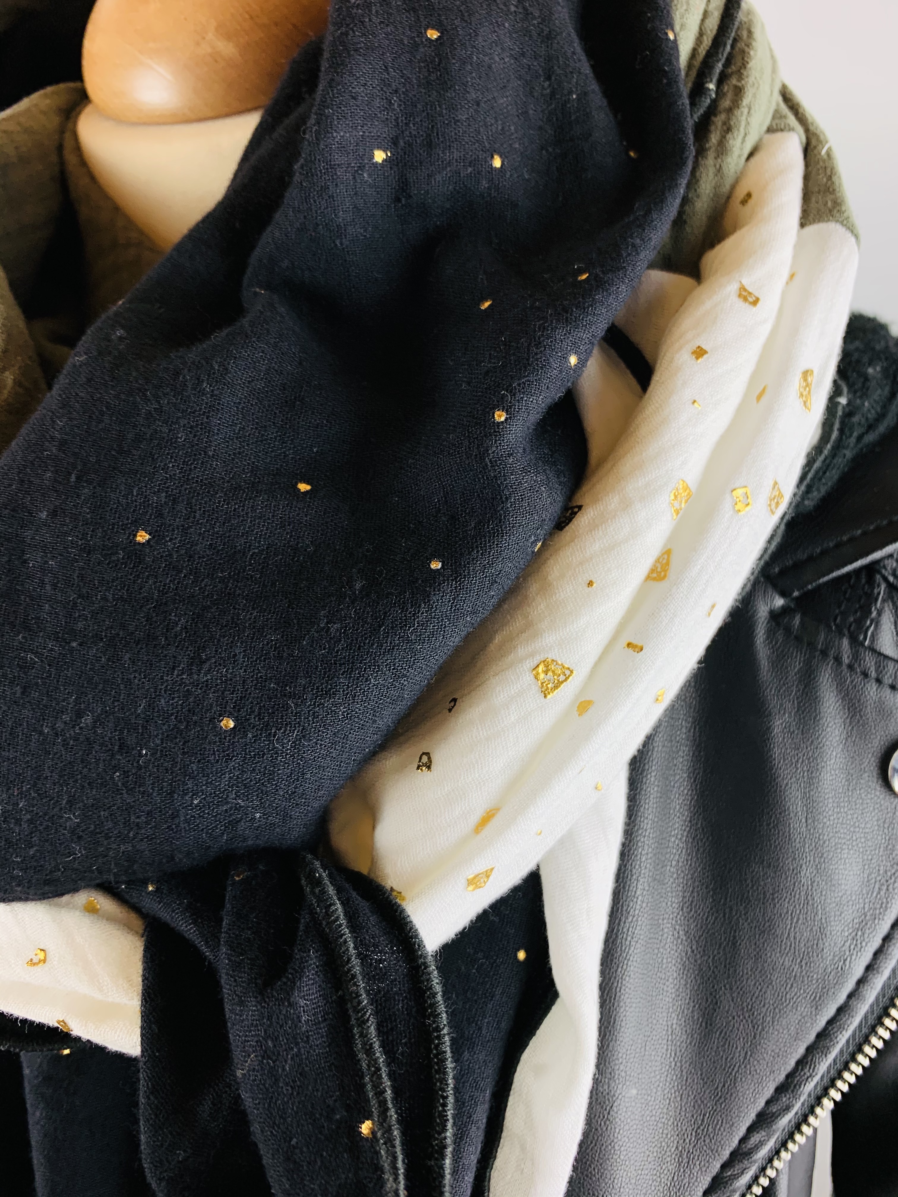 Dieser hochwertige, doppelt gewebte Schal aus 100 % Baumwollmusselin wurde in schwarz mit goldenen Tropfen, weiß mit goldenen Glitzer Flakes und olivgrün gefertigt.