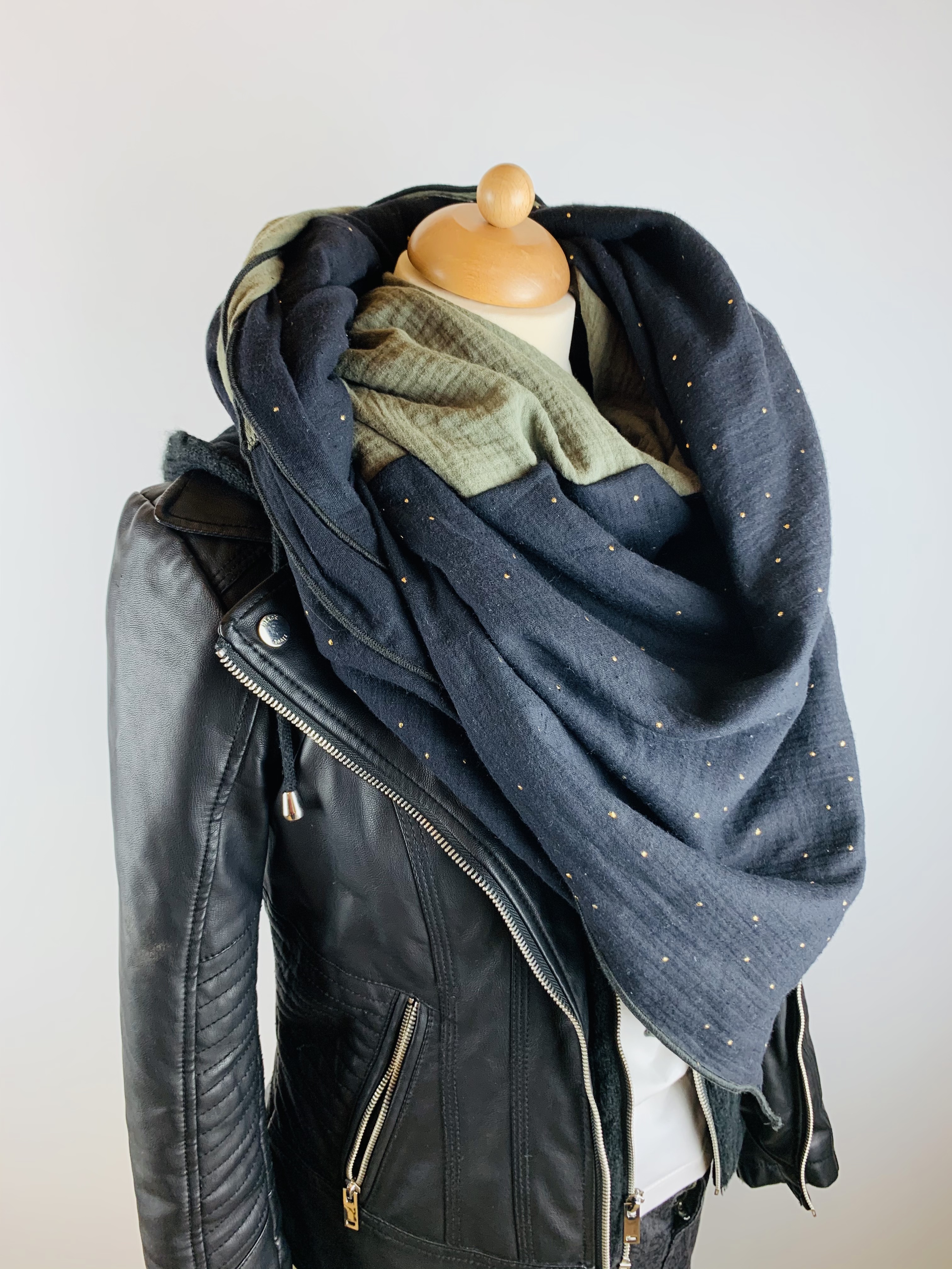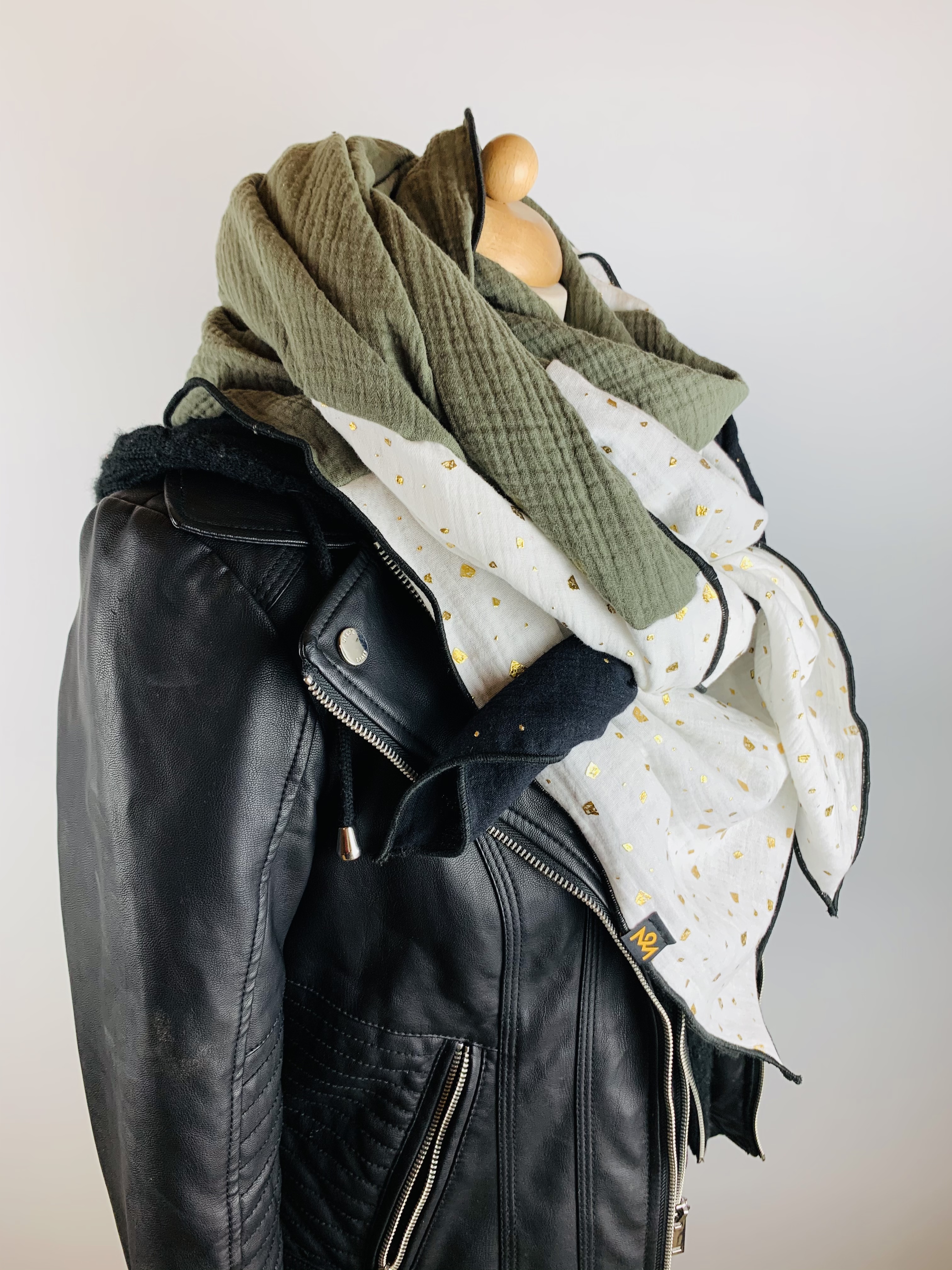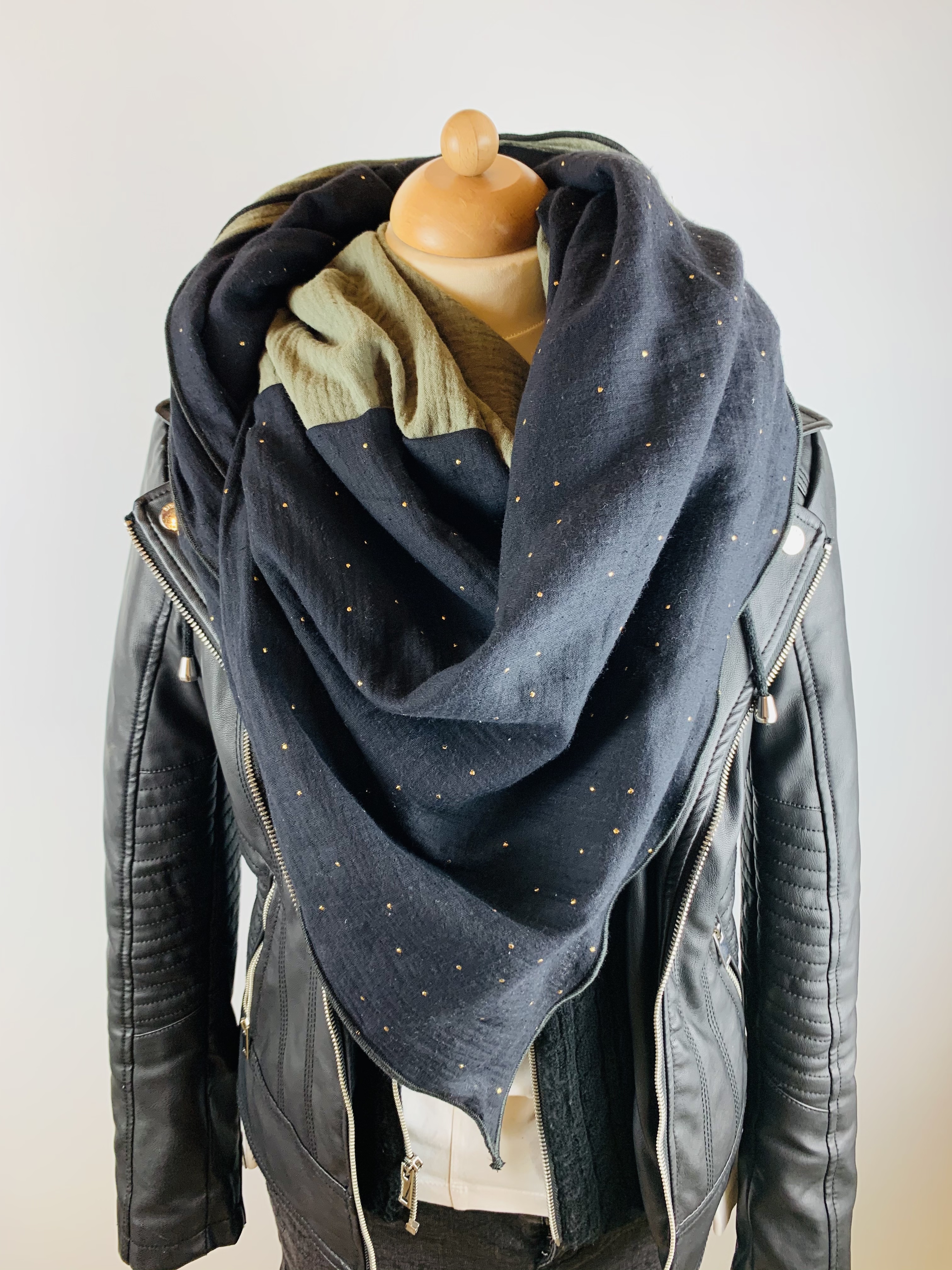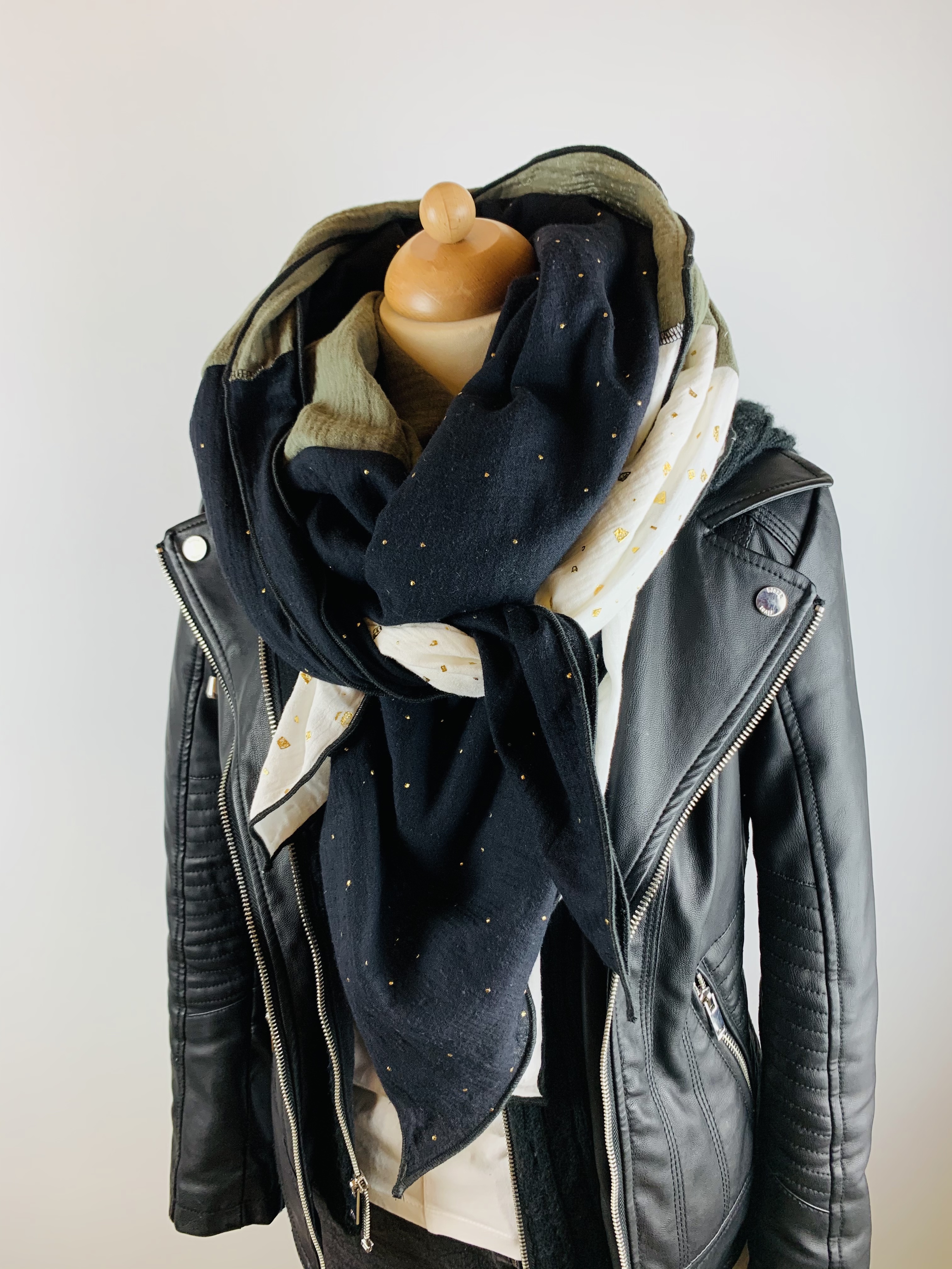 Dieser hochwertige, doppelt gewebte Schal aus 100 % Baumwollmusselin wurde in schwarz mit goldenen Tropfen, weiß mit goldenen Glitzer Flakes und olivgrün gefertigt.